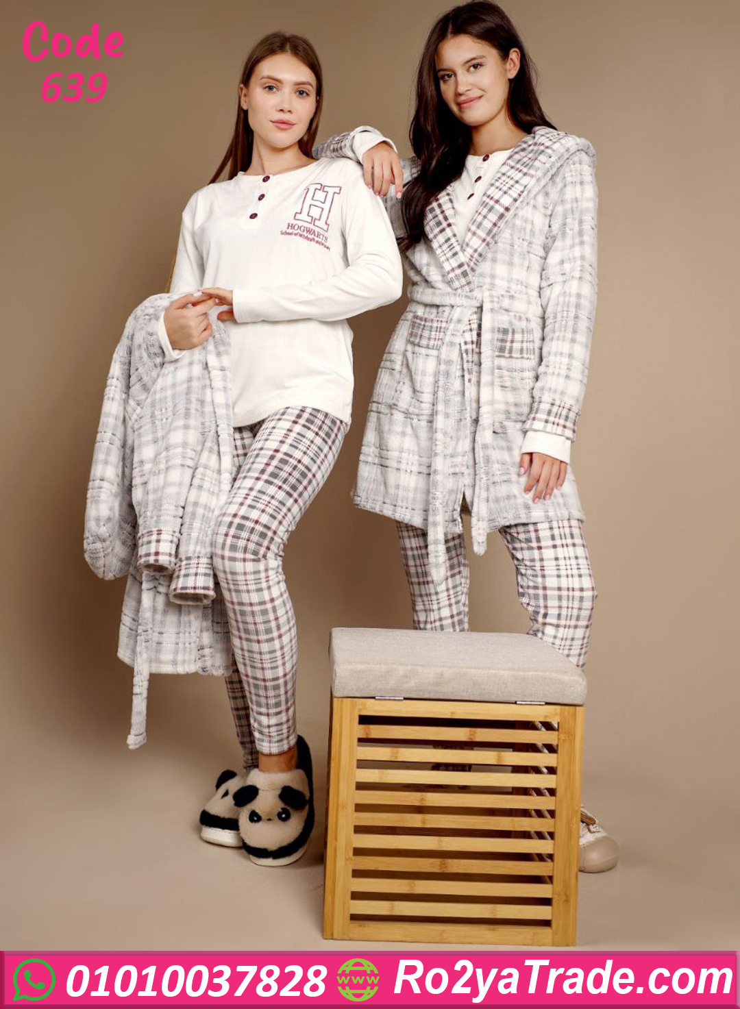 البيچامة فيها روب طويل بخامة فليز ثقيلة وتيشيرت بسيط بياقة دائرية مع بنطلون مريح بوسط مطاطي يناسب جميع المقاسات.
