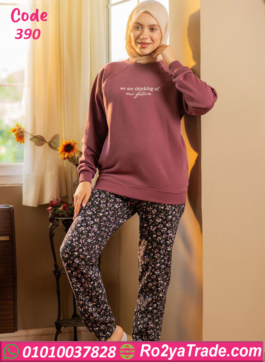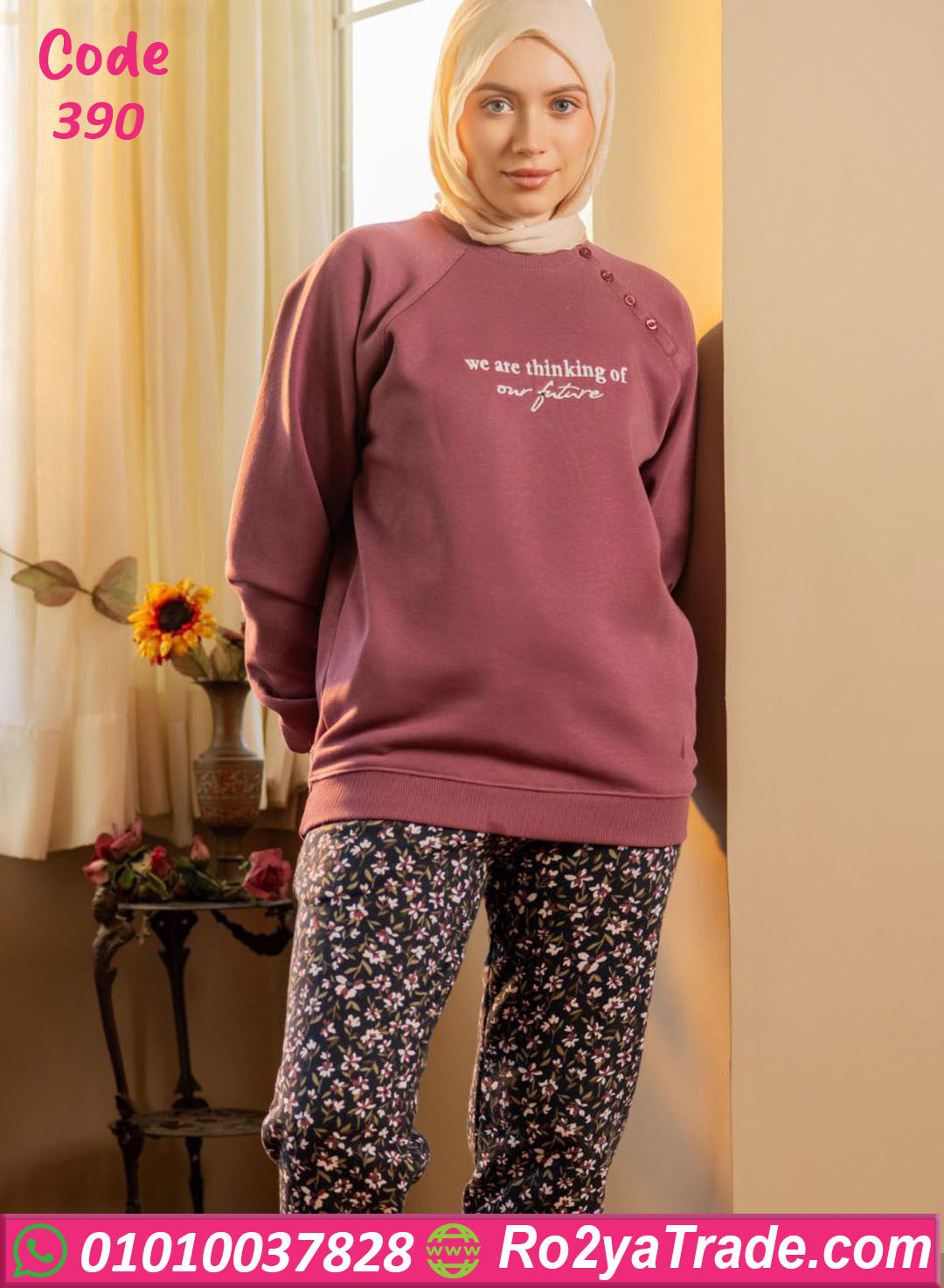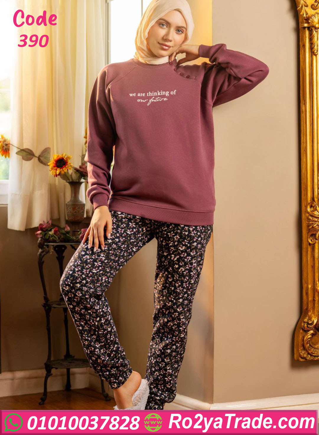 ترنج قطيفة شتوي ناعم بخامة دافئة جدًا ومريحة، الجزء العلوي بلون كشمير مطبوع عليه جملة أنيقة، والبنطلون منقوش بنقشة ورد صغيرة، مناسب للبيت والخروجات الكاجوال ✨