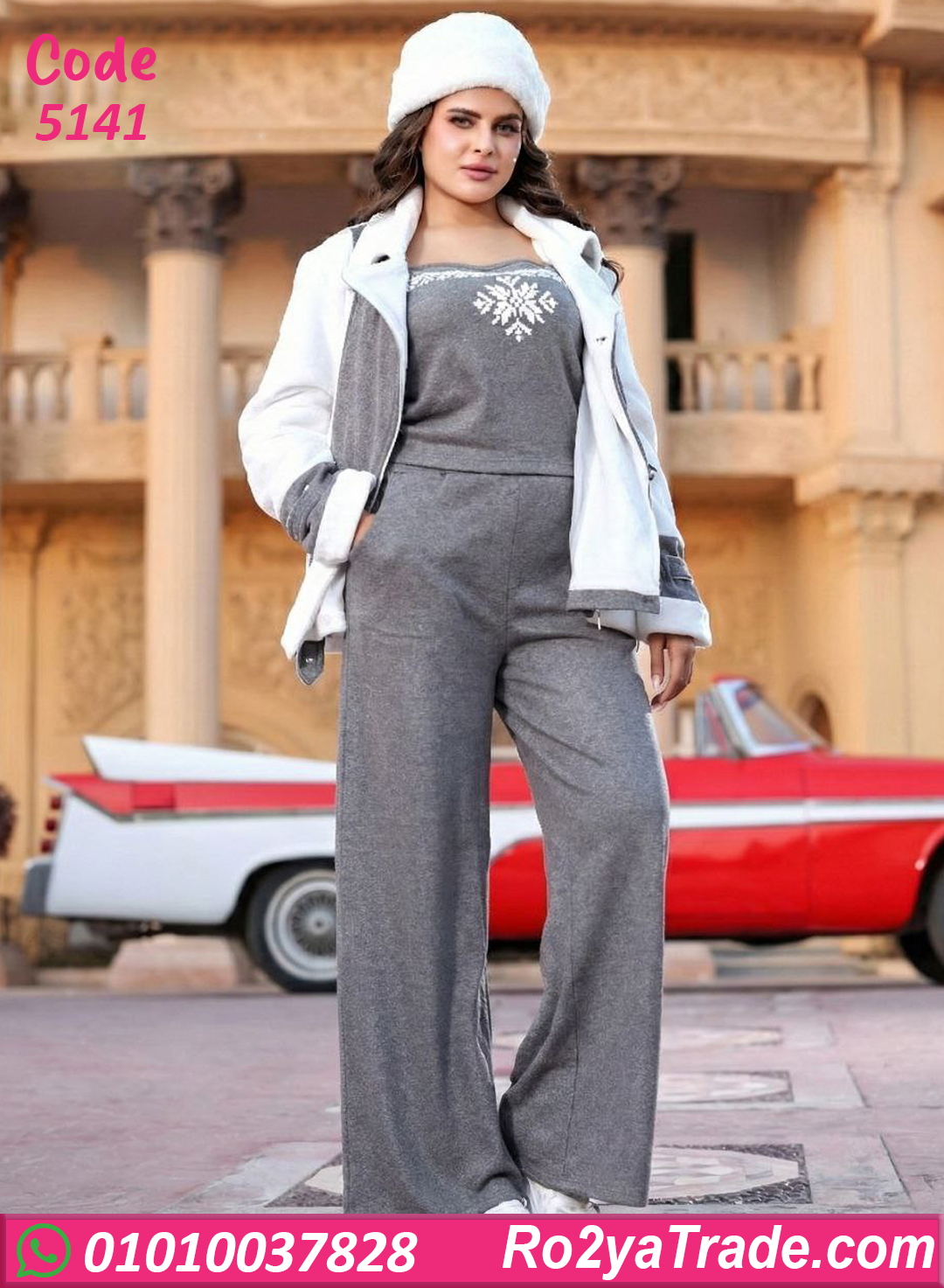 مكوّن من توب وبنطلون مع جاكيت شتوي مبطّن وخامة فرو دافية، تصميم عملي ومريح يناسب اللبس اليومي والخروجات في الجو البارد.