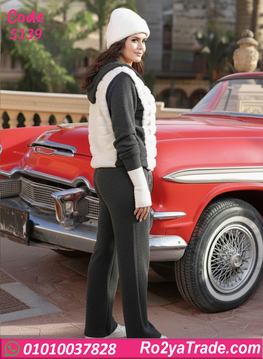 مكوّن من توب وبنطلون مع جاكيت هودي مبطّن فرو من الأمام، خامة دافية ومريحة جدًا، مناسب للشتا والخروجات واللبس اليومي.