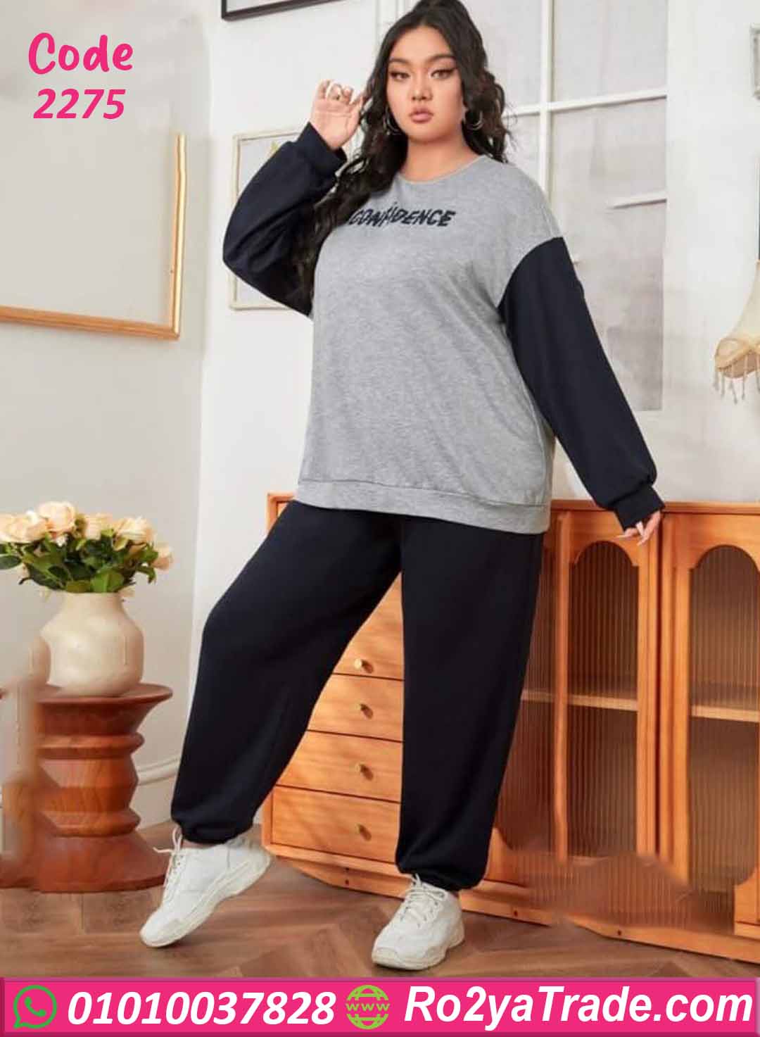للمقاسات الكبيرة. يتكون من سويت شيرت رمادي بكم كحلي مطبوع عليه كلمة Confidence، مع بنطال كحلي