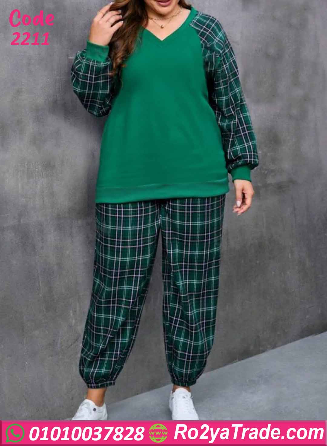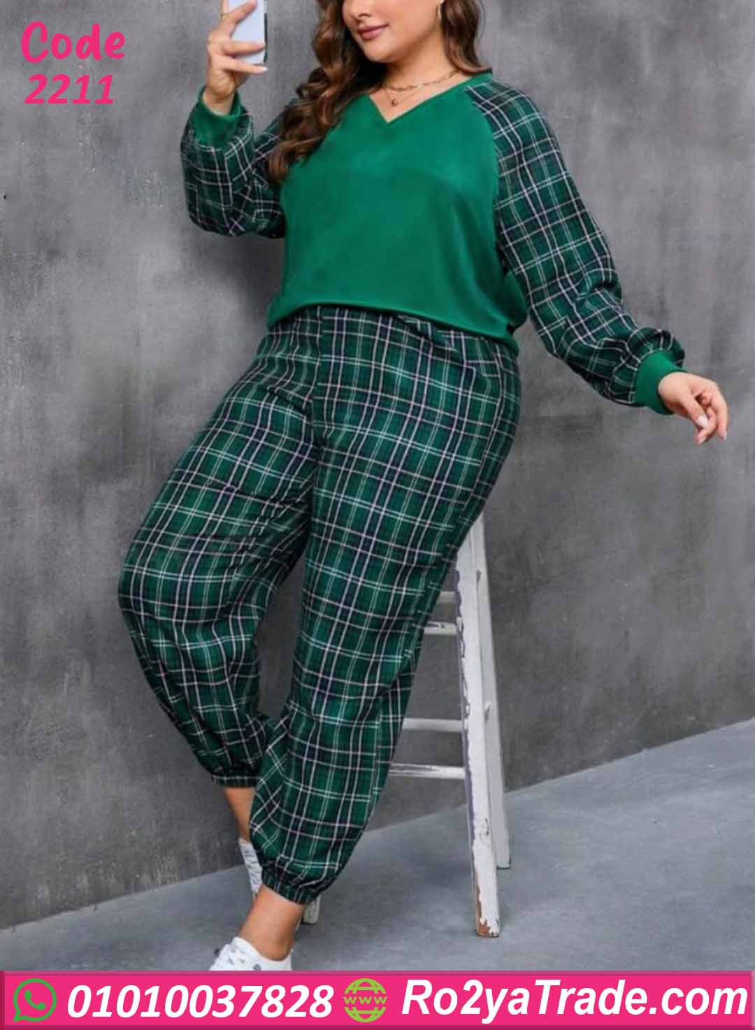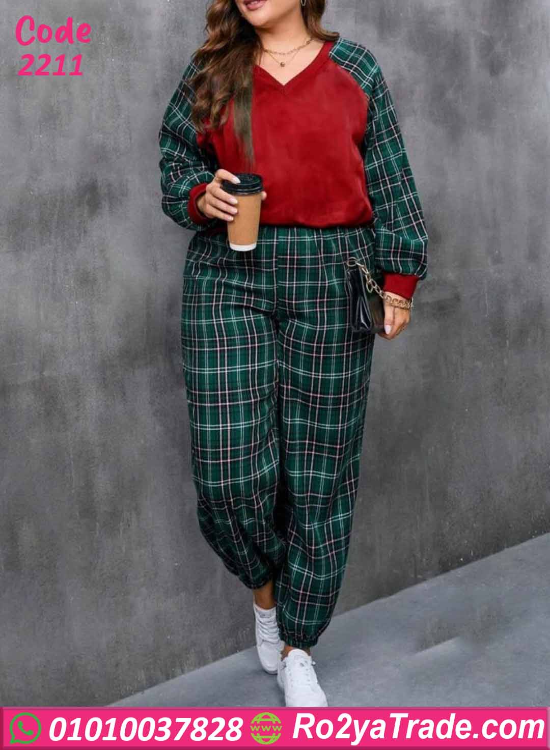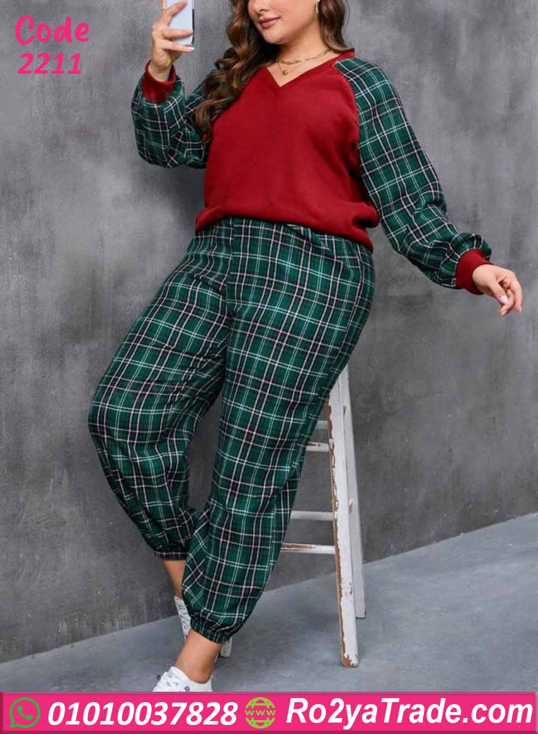 ✨ طقم مكون من (بلوزة كم طويل + بنطال كاروه)