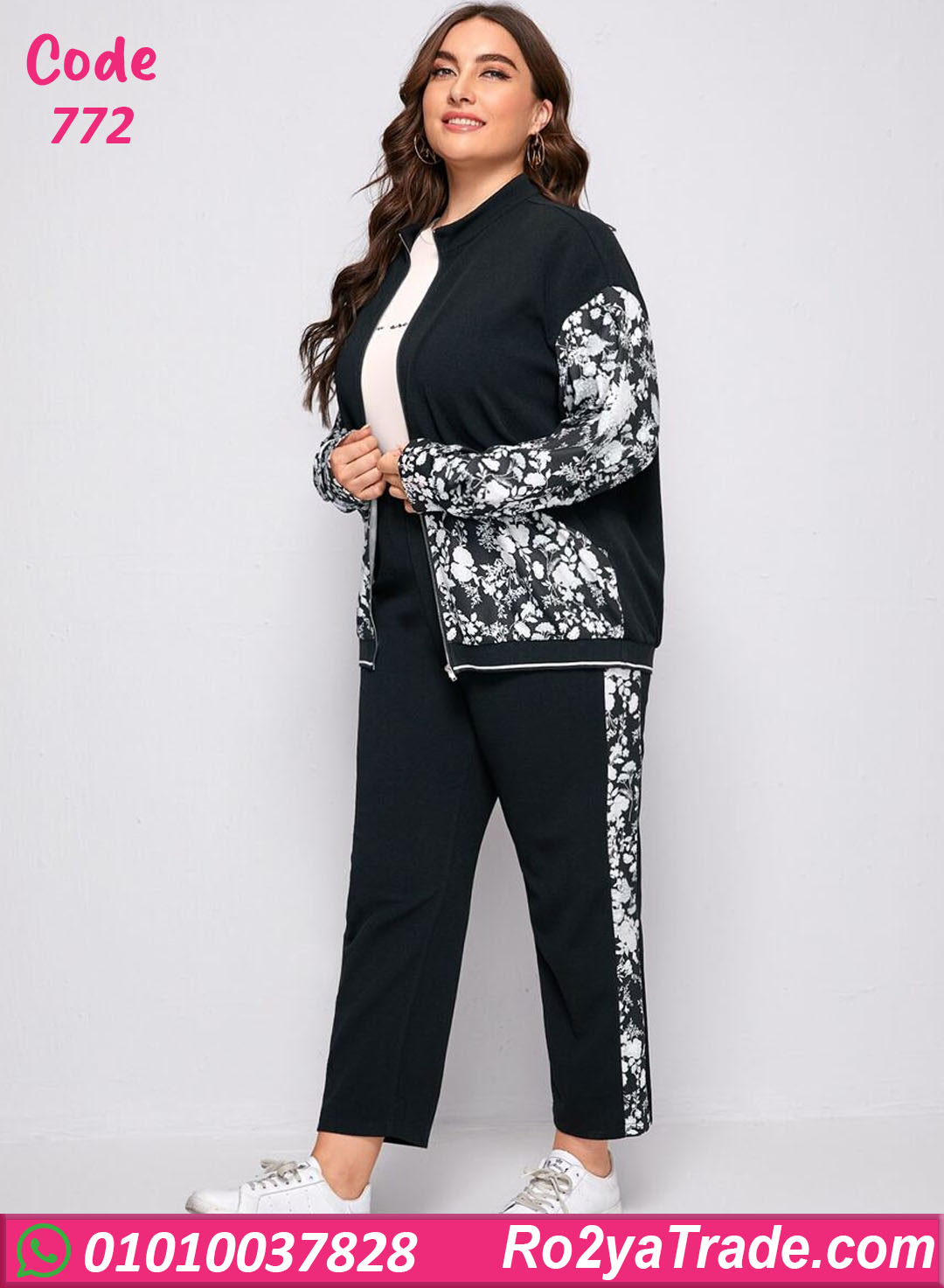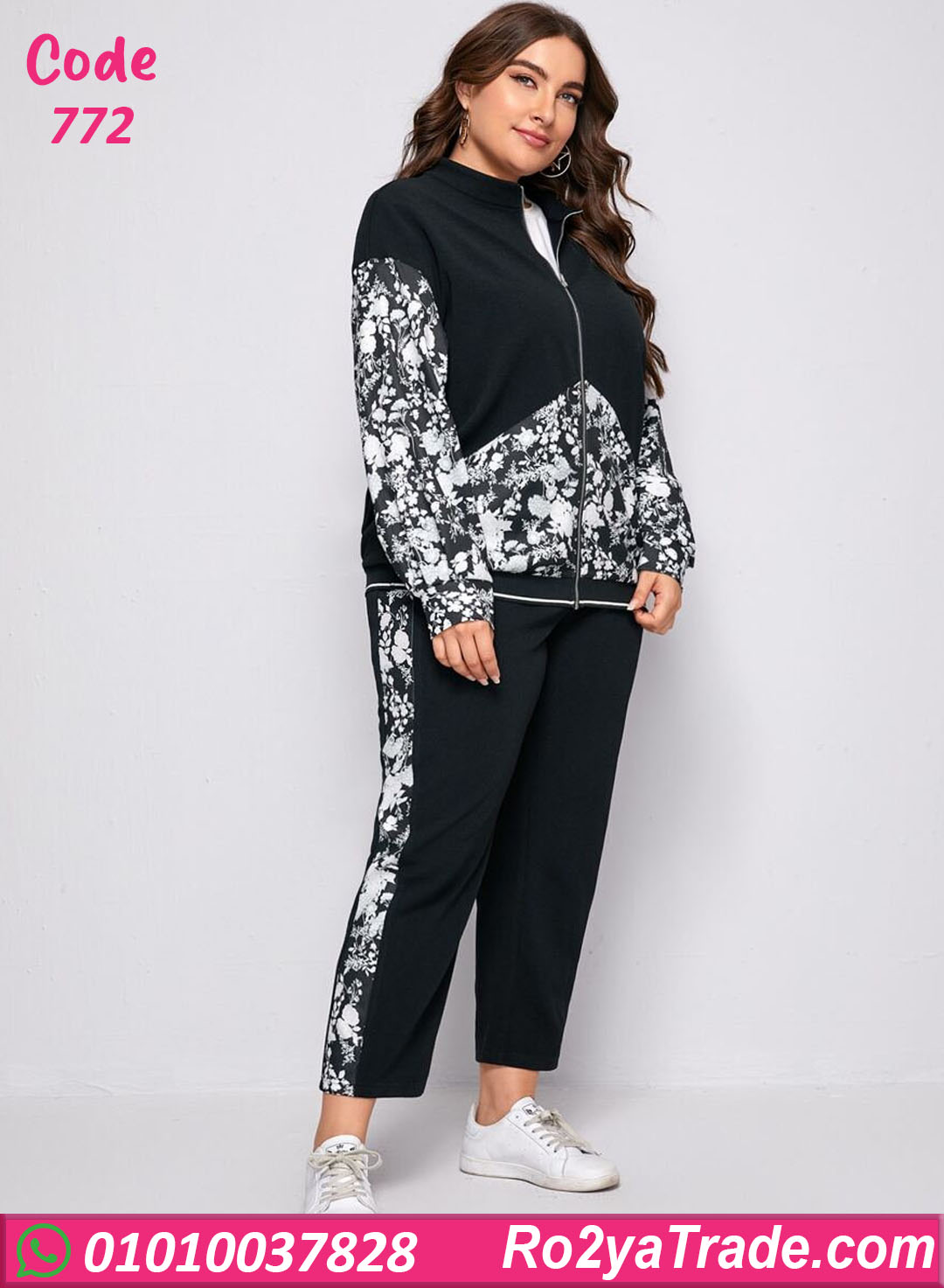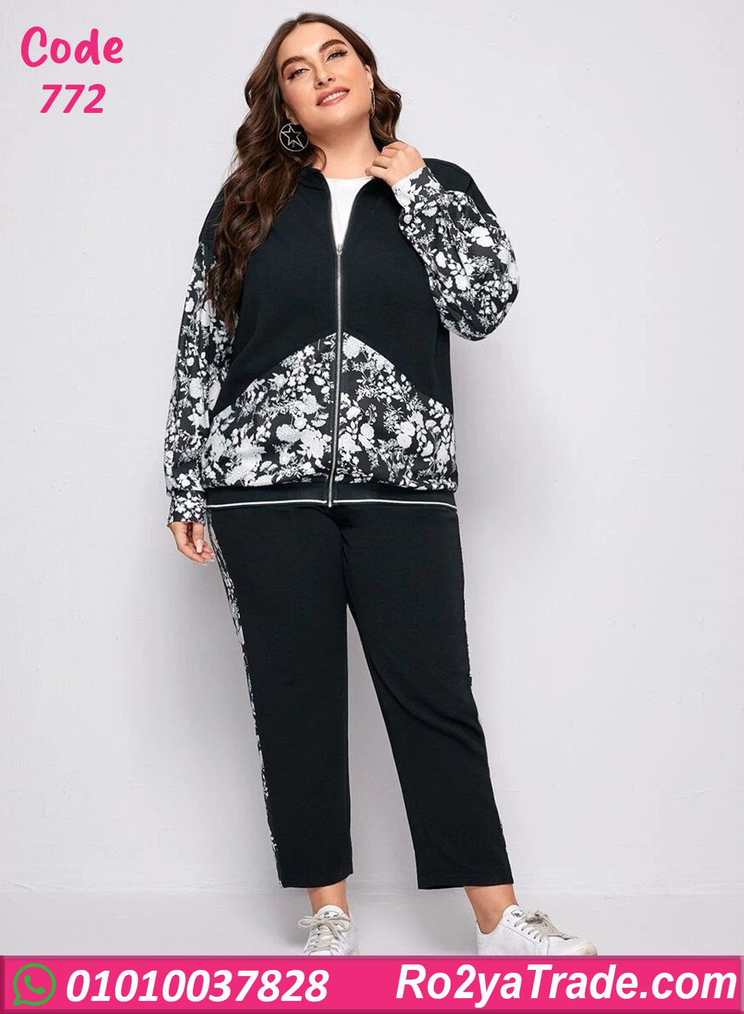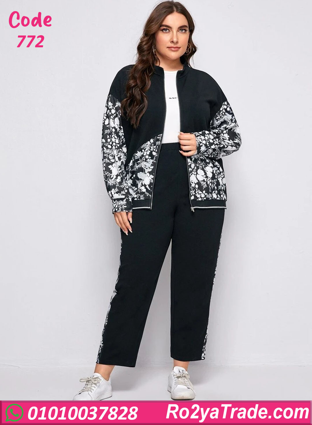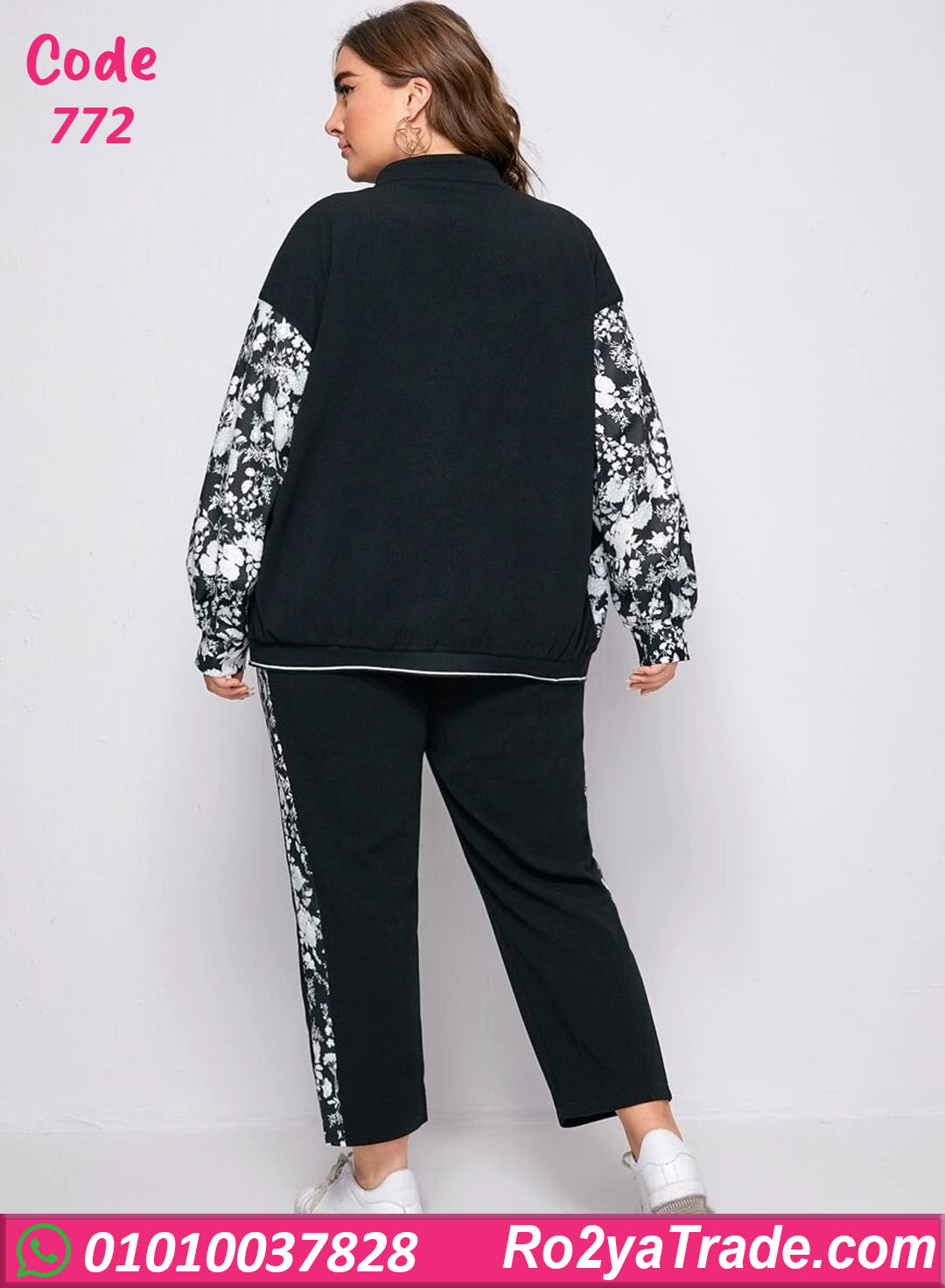 الطقم مكوّن من جاكيت بسوستة وبنطلون بقصة مريحة، مع دمج لون سادة مع نقشة وردي أنيقة بتدي شكل مختلف وجذاب.
