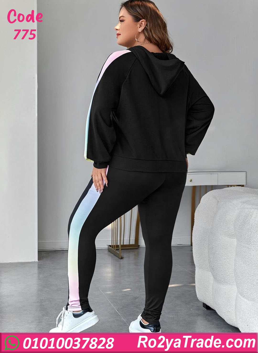 الطقم مكوّن من سويت شيرت بقبعة وبنطلون بتصميم جذاب، مع شريط جانبي ملون يدي شكل مميز وعصري.