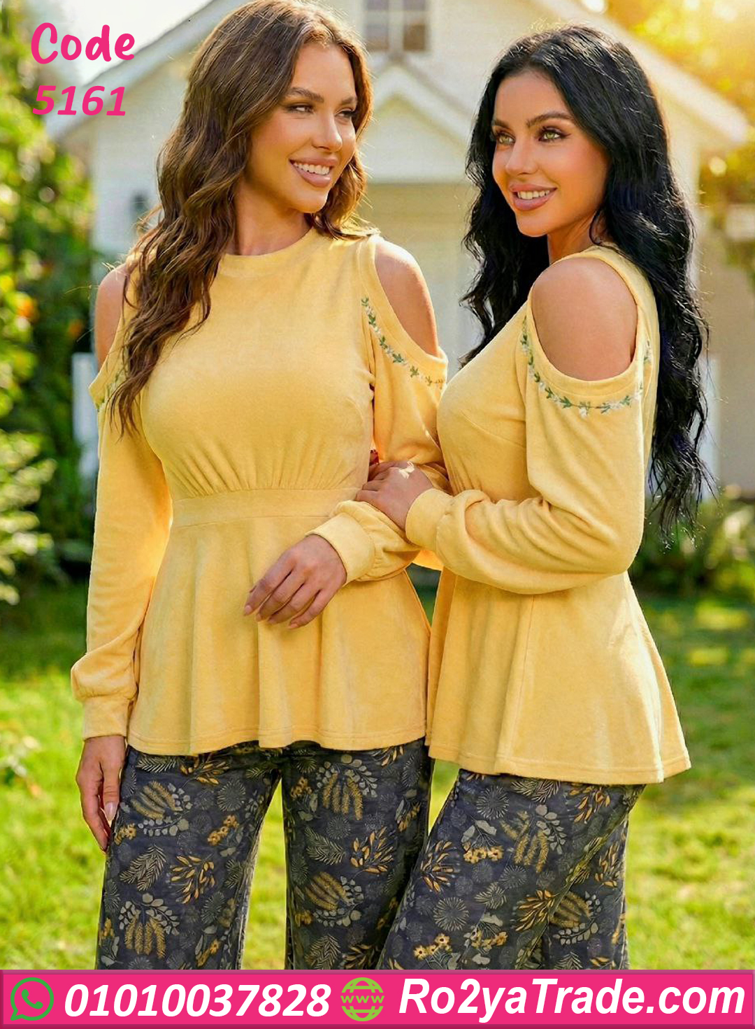 مكوّن من توب بكتف مفتوح وبنطلون مشجر، خامة ناعمة ومريحة جدًا، مناسب للّبس اليومي والخروجات الخفيفة في الجو المعتدل.