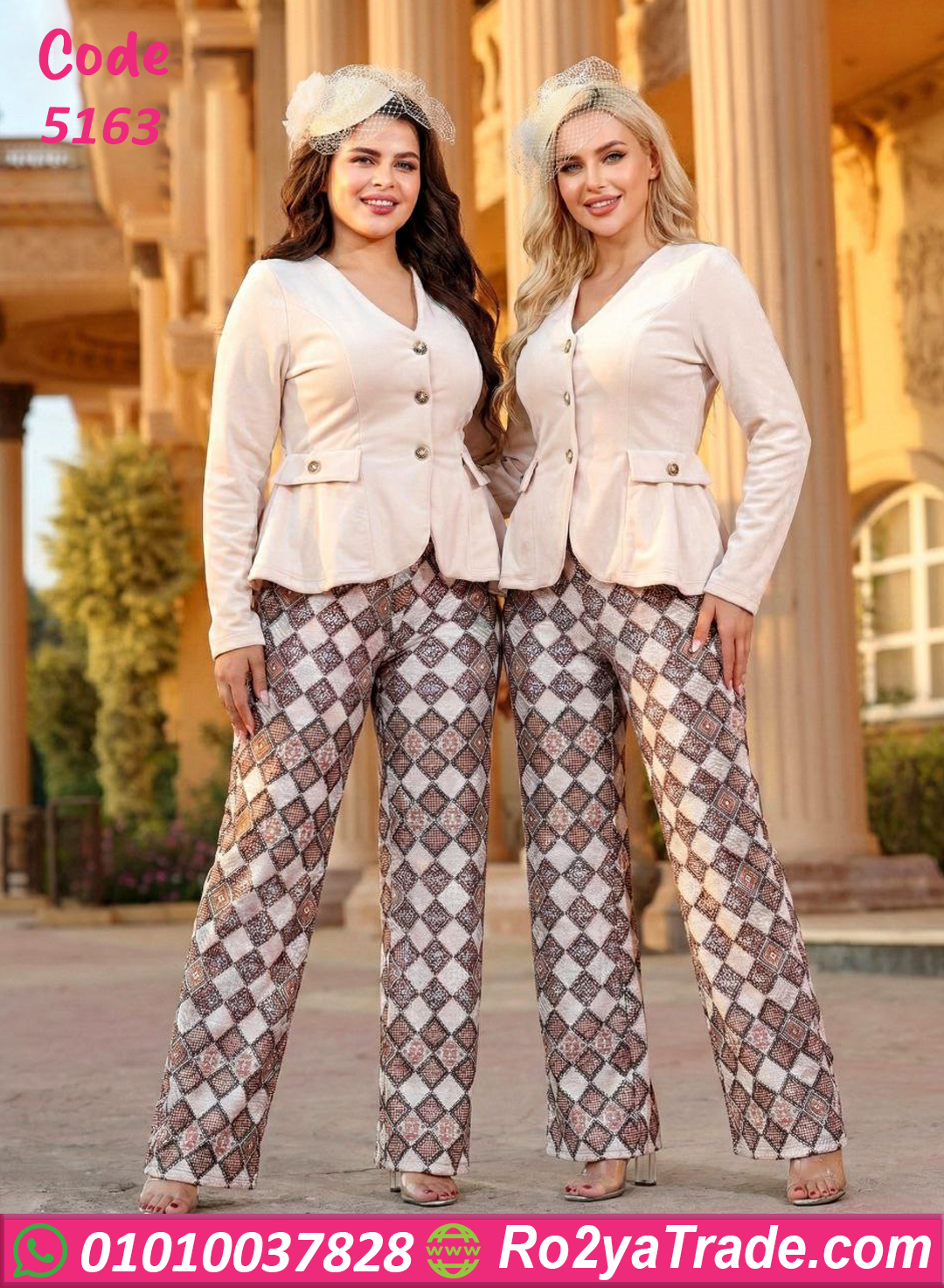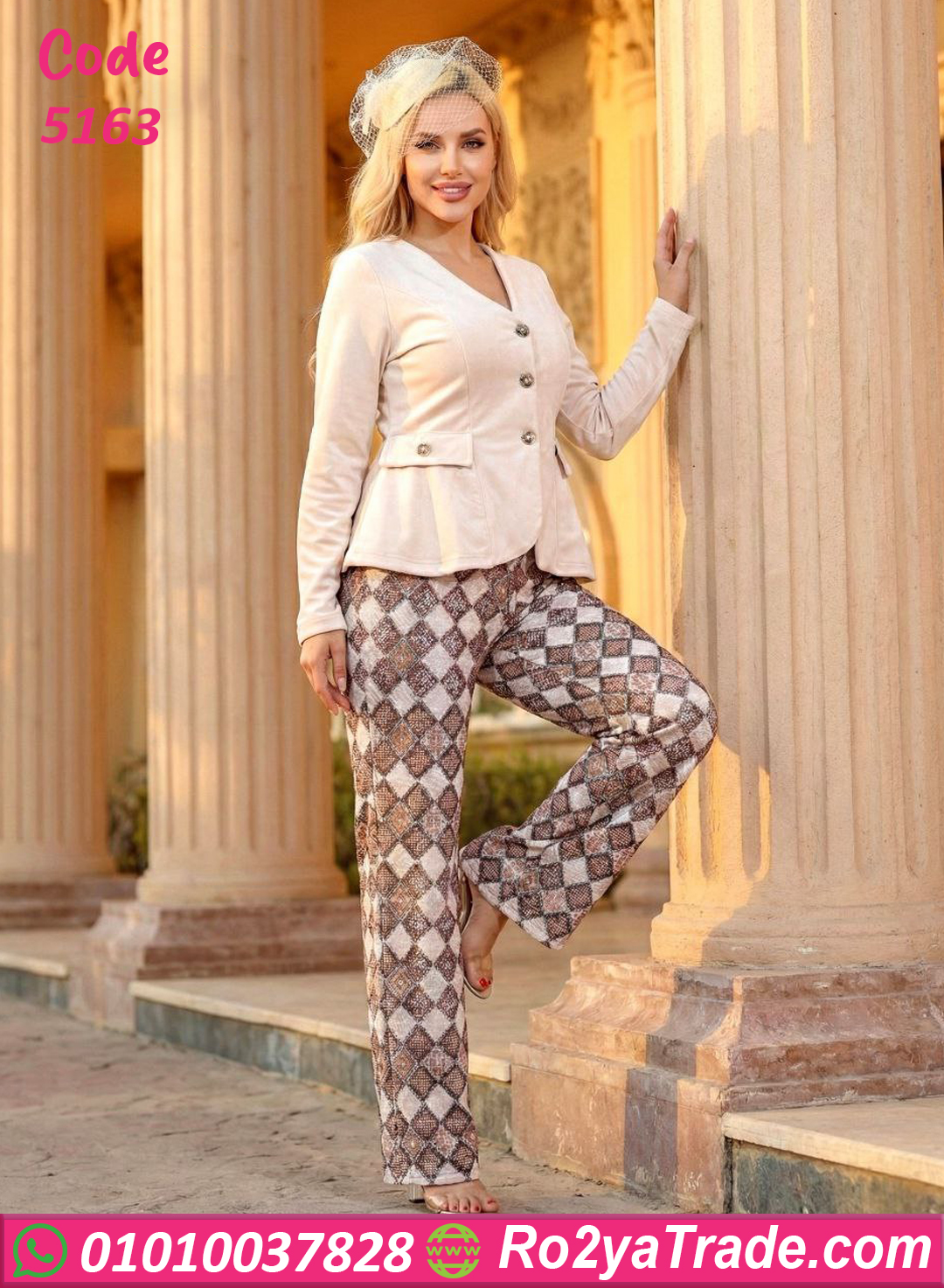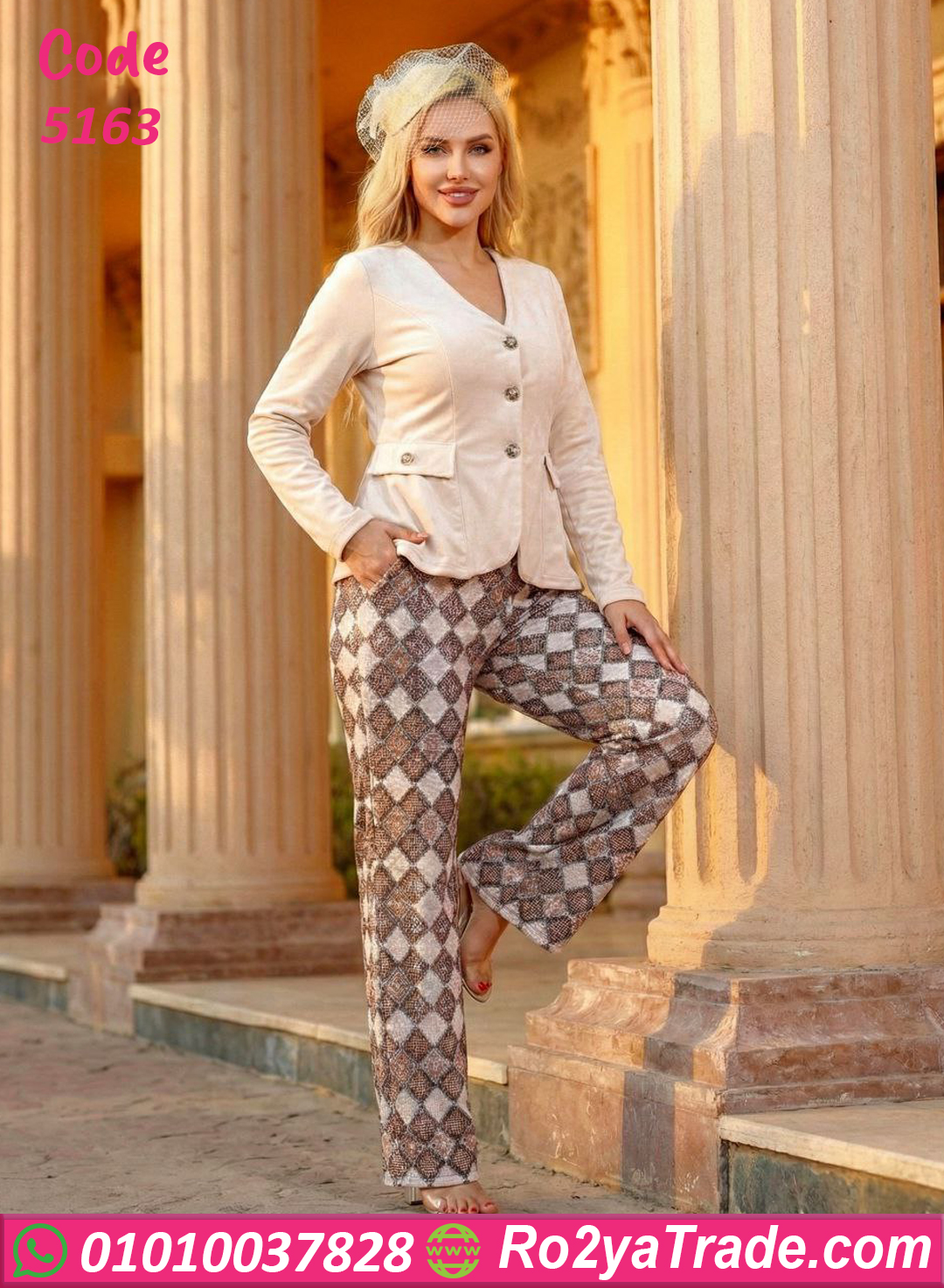 مكوّن من جاكيت بأزرار وبنطلون مشجر، خامة ناعمة ومريحة جدًا، مناسب للشتا والخروجات واللبس اليومي.
