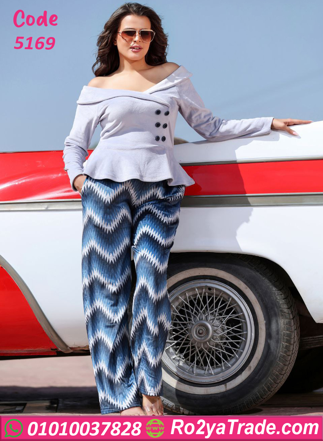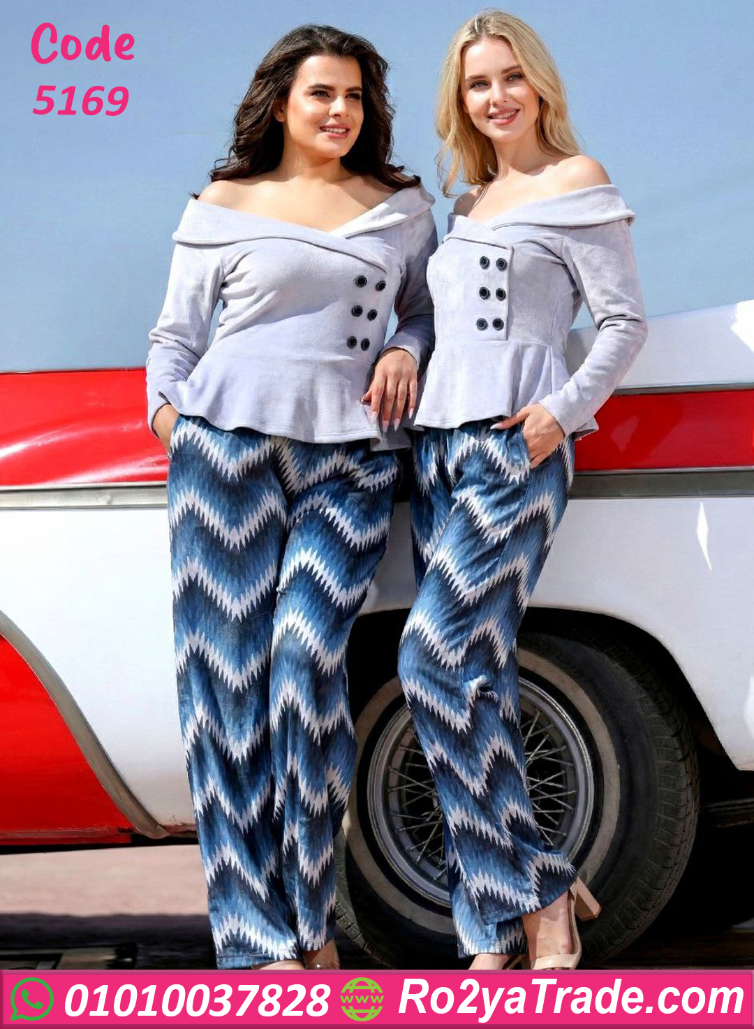 مكوّن من توب بكتف مفتوح وأزرار ديكورية وبنطلون واسع بنقشة مميزة، خامة ناعمة ودافية، مناسب للشتا والخروجات واللبس اليومي.