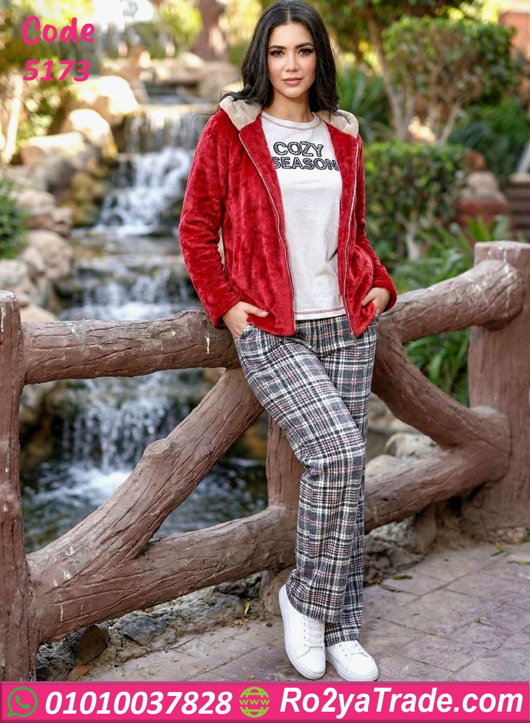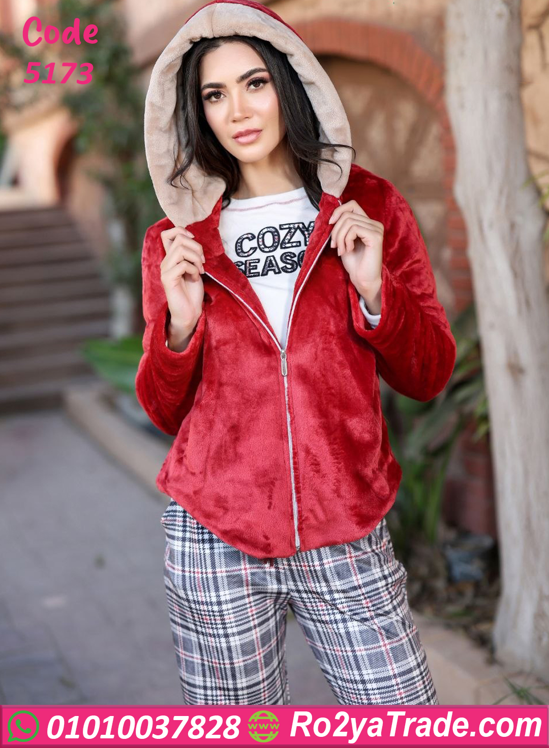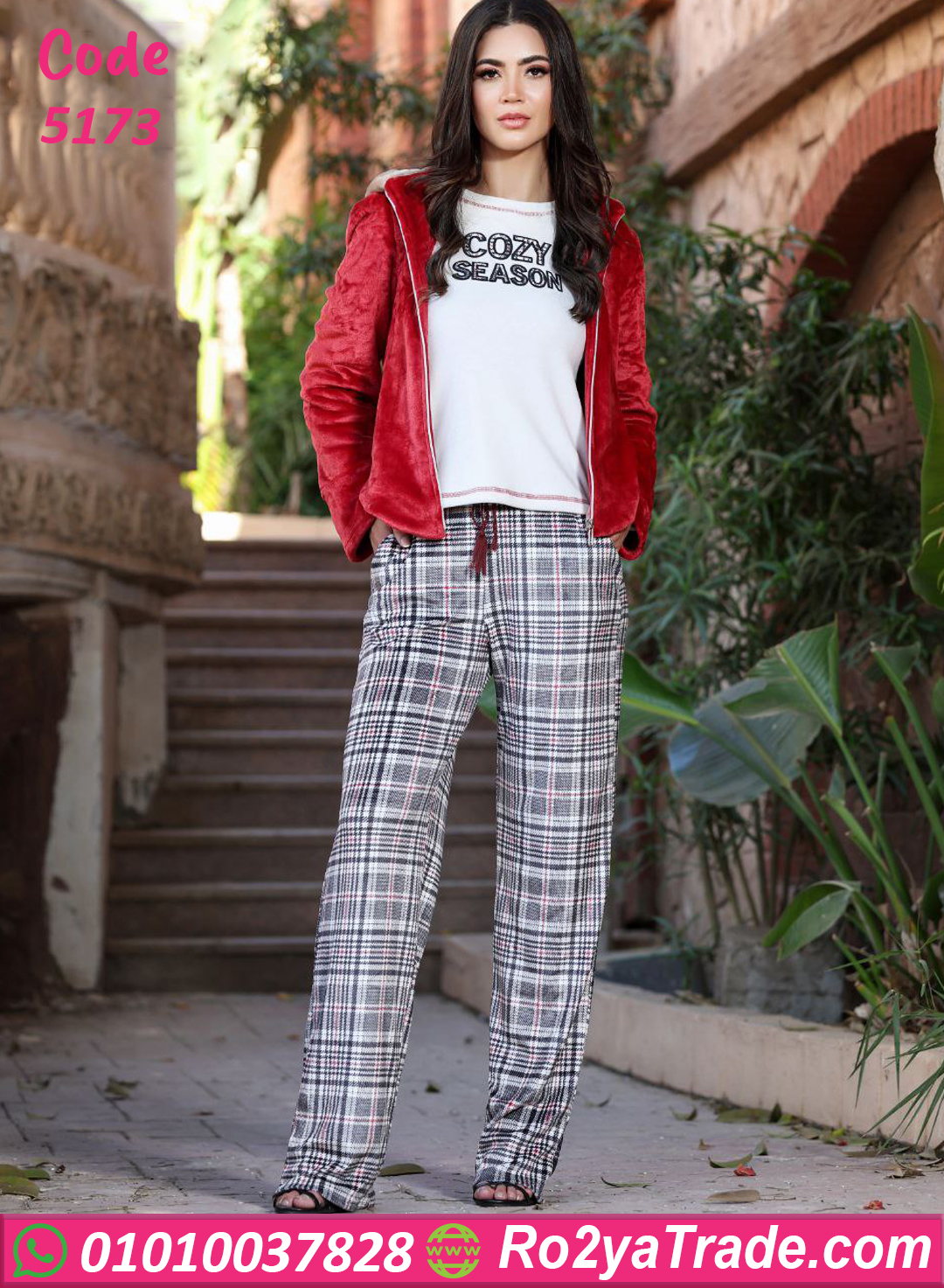 مكوّن من توب وبنطلون كاروهات مع جاكيت قطيفة بغطاء رأس (هودي)، خامة دافية وناعمة جدًا، مناسب للشتا والخروجات واللبس اليومي.