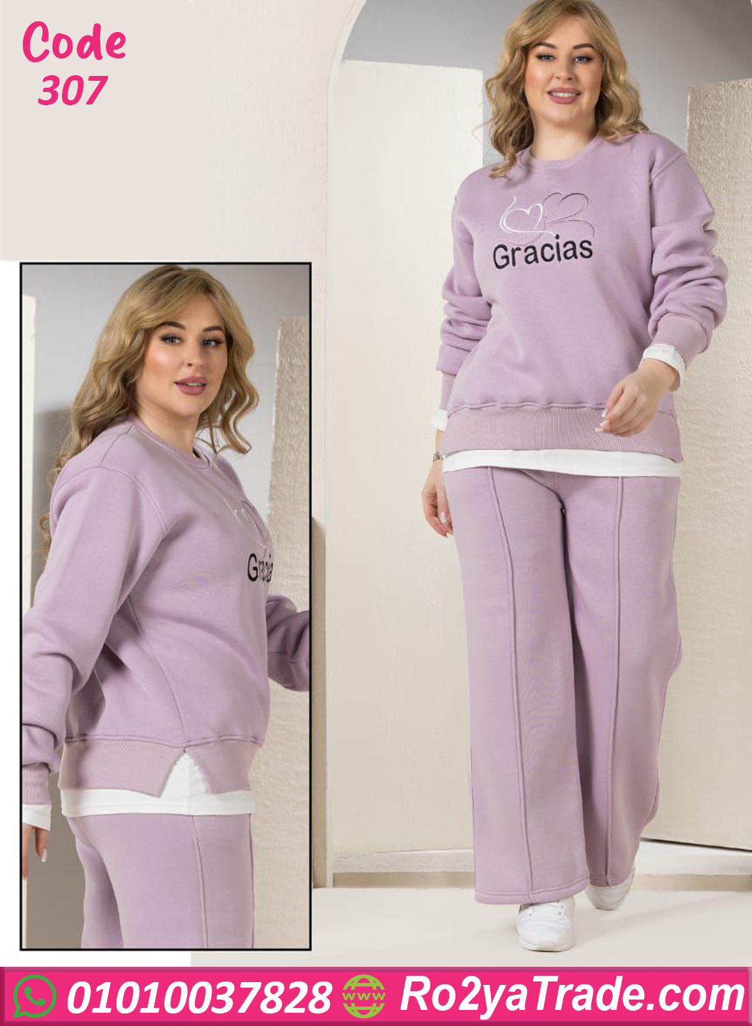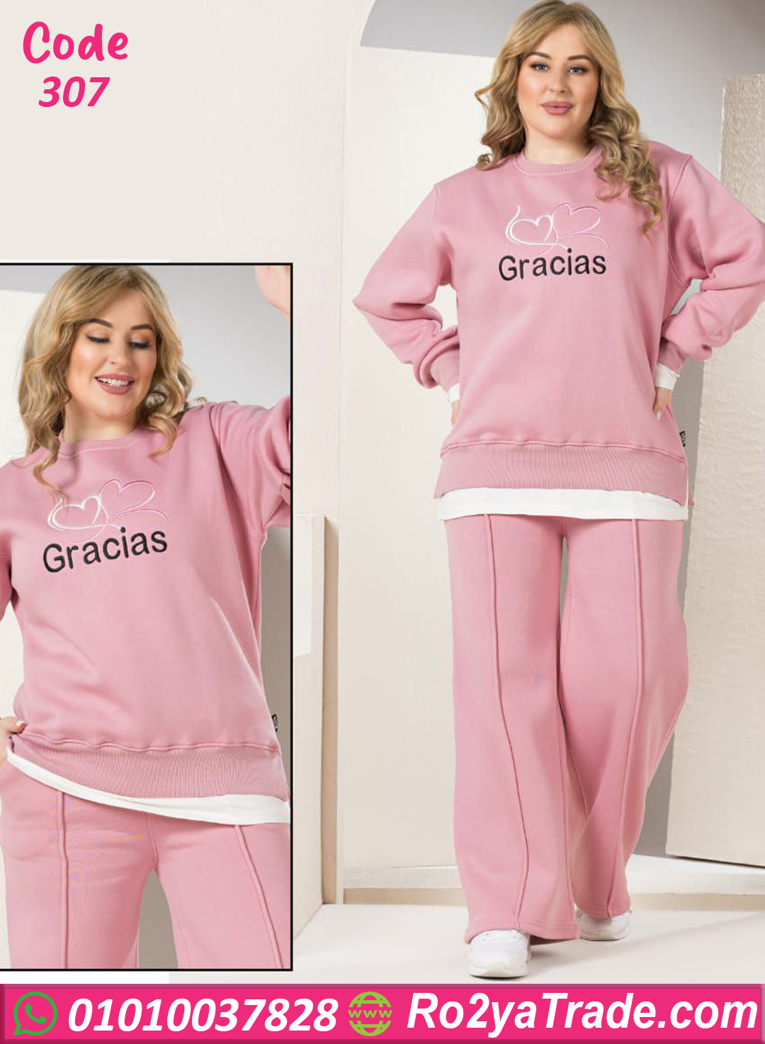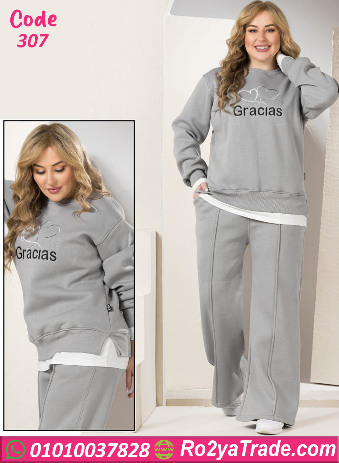 الترنج مكون من بلوزة بفتحة رقبة دائرية وطباعة Gracias بسيطة، مع بنطلون واسع بستايل مودرن بيجمع بين الراحة والأناقة ✨