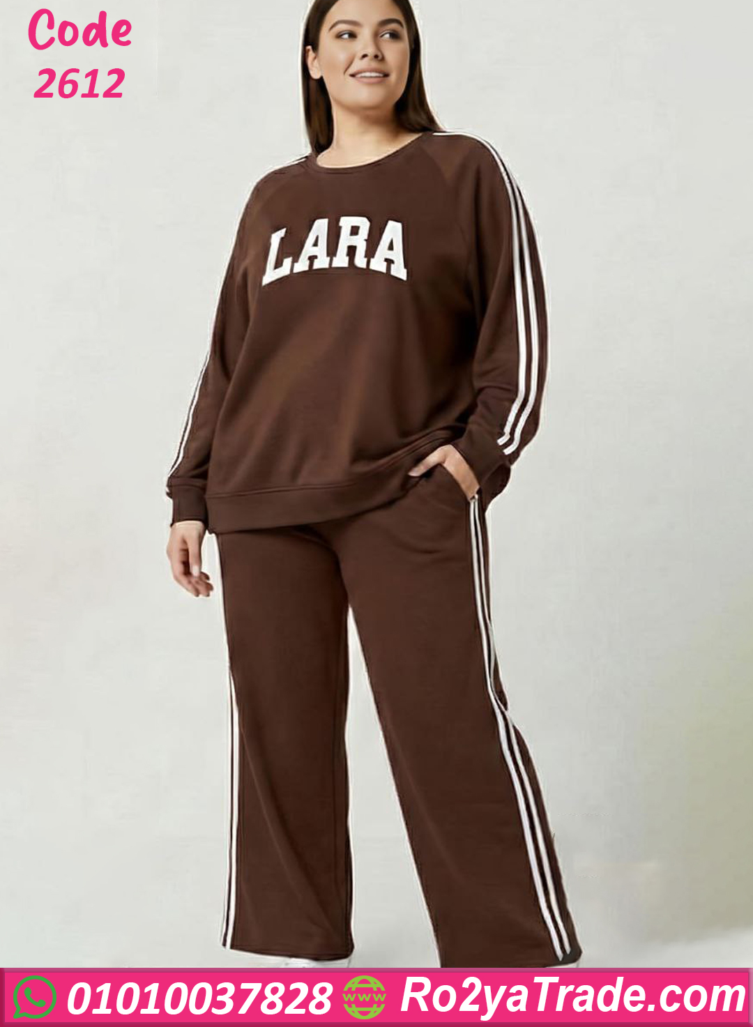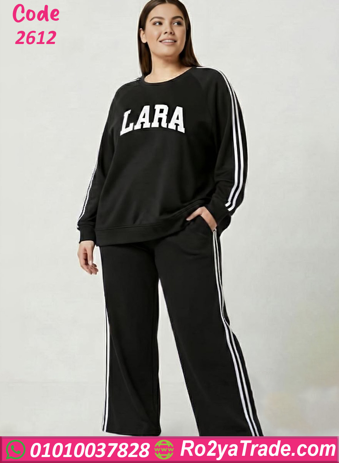 يتميز البلوفر بتصميم رياضي بسيط مع شعار LARA على الصدر، بالإضافة إلى خطوط جانبية على الأكمام تضيف لمسة أنيقة وعصرية. أما البنطلون فيأتي بقصة مريحة مع خطوط جانبية بنفس التصميم لتعطي مظهر متناسق وجذاب، مع خصر مطاطي لسهولة اللبس والراحة أثناء الحركة.