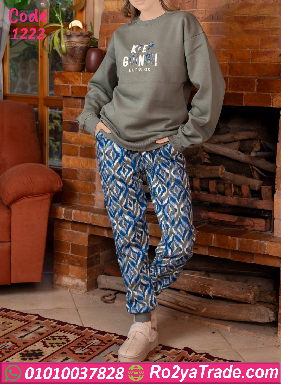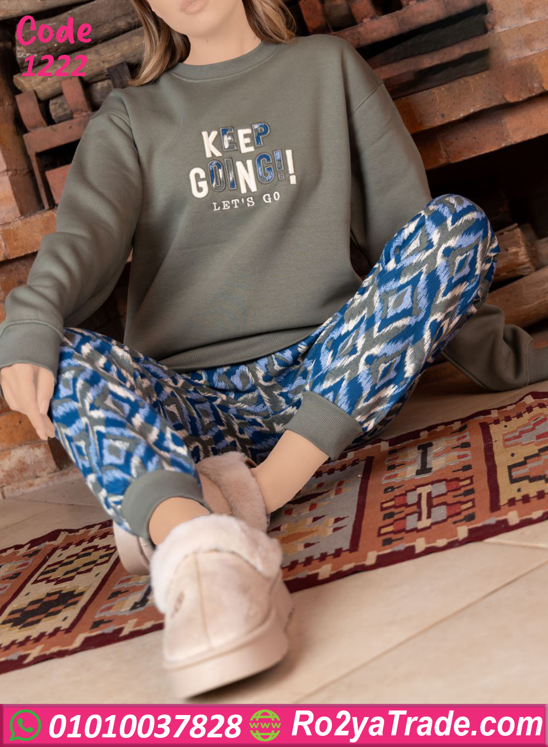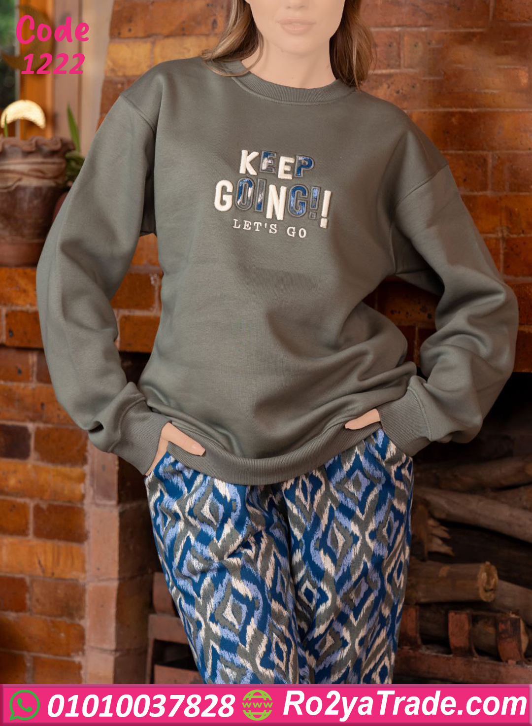 الخامة ميلتون ثقيلة وبتدي إحساس بالدفا من أول لبسة، البلوزة سادة بتطريزة أنيقة وكلمة (Keep Going) بتدي طاقة إيجابية، والبنطلون النقشة بتاعته شيك جدًا على الخامة 🤍