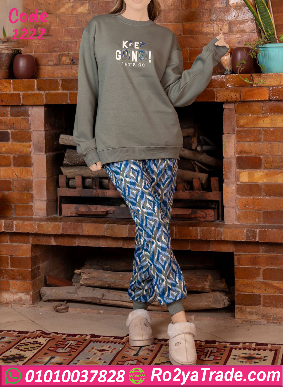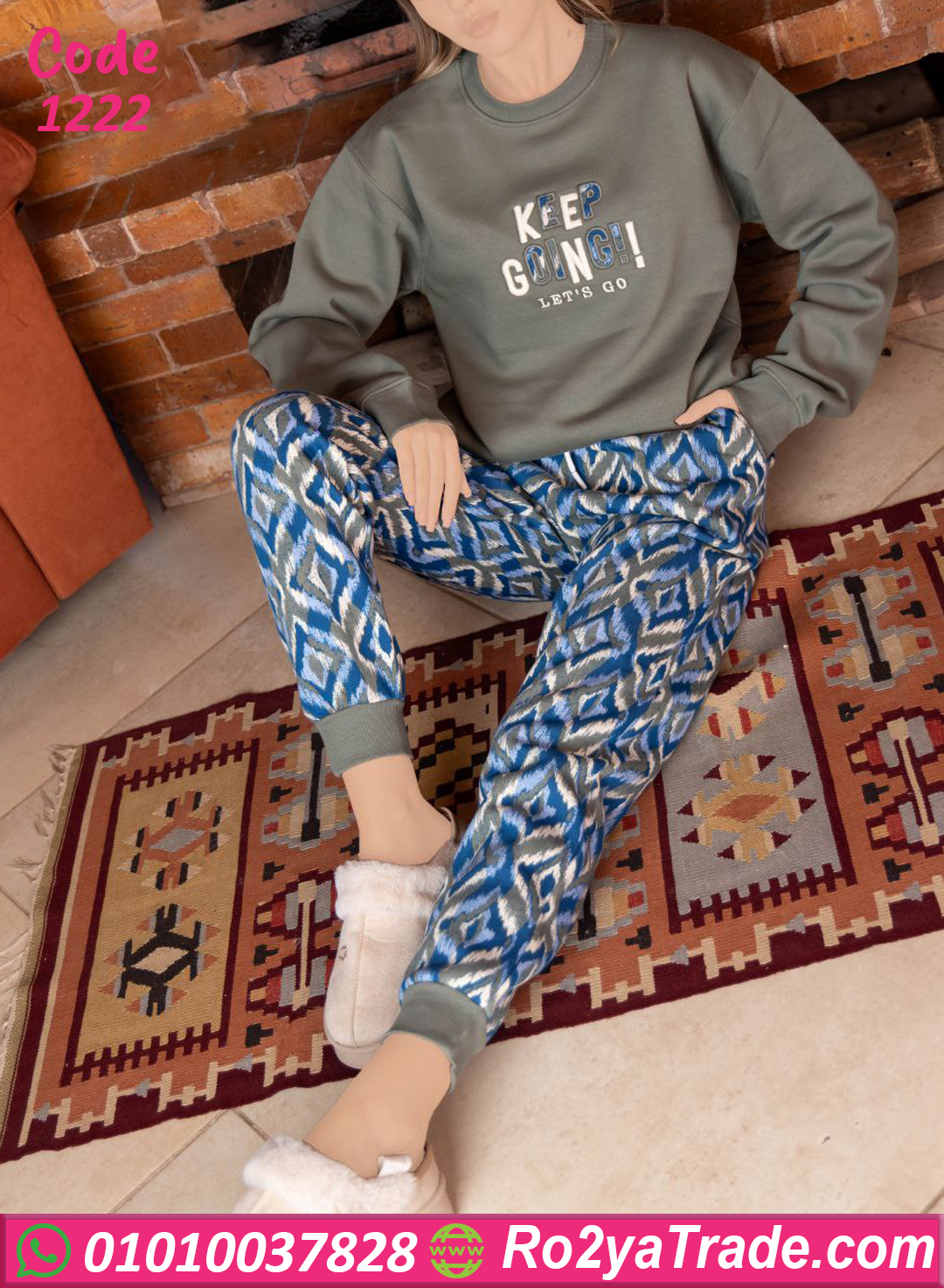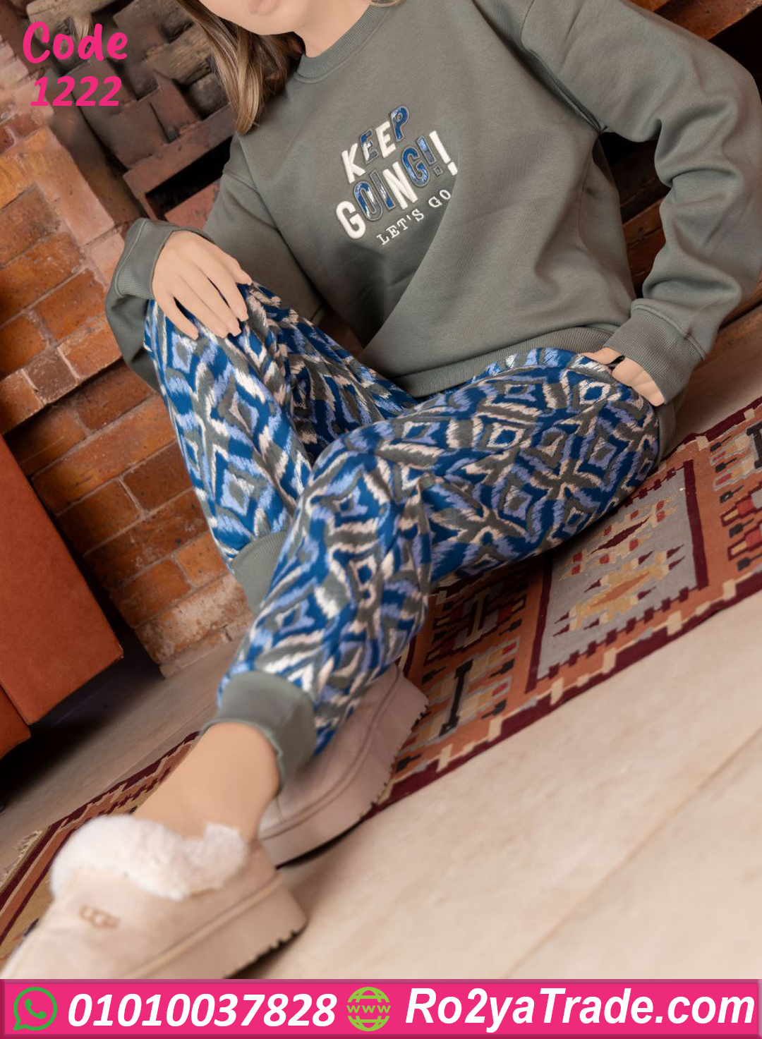 الخامة ميلتون ثقيلة وبتدي إحساس بالدفا من أول لبسة، البلوزة سادة بتطريزة أنيقة وكلمة (Keep Going) بتدي طاقة إيجابية، والبنطلون النقشة بتاعته شيك جدًا على الخامة 🤍