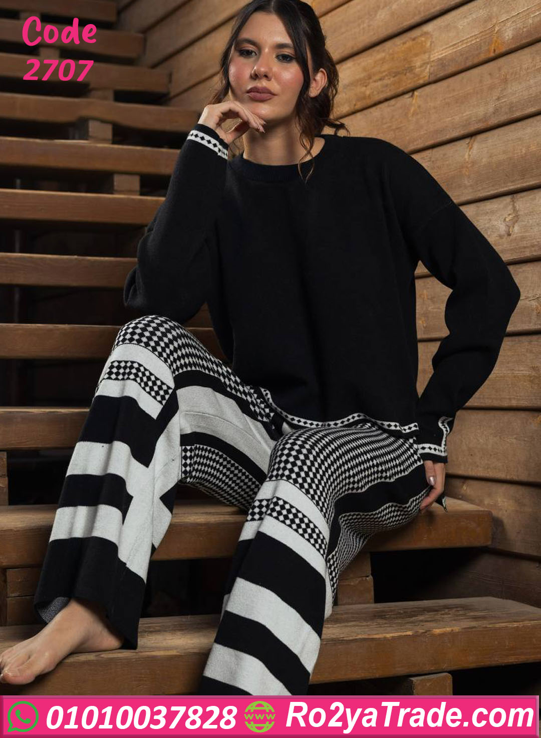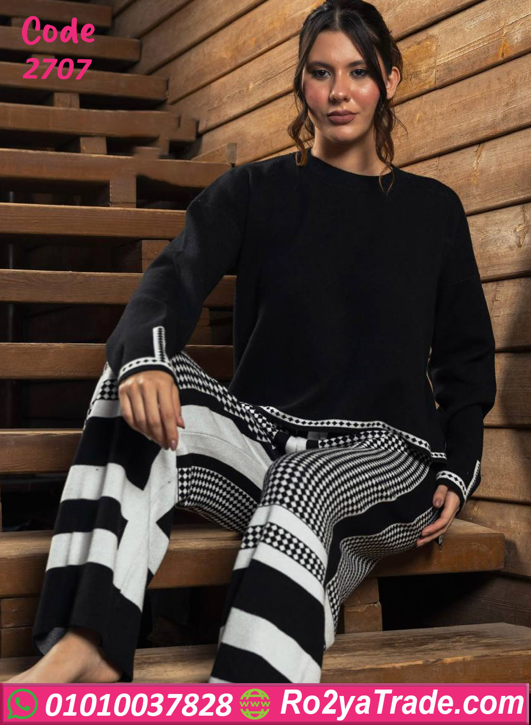 والبنطلون عليه نقشة كاروهات عريضة بخطوط هندسية جذابة بتدي شكل مودرن وأنيق. الترنج ده بيجمع بين البساطة والفخامة،