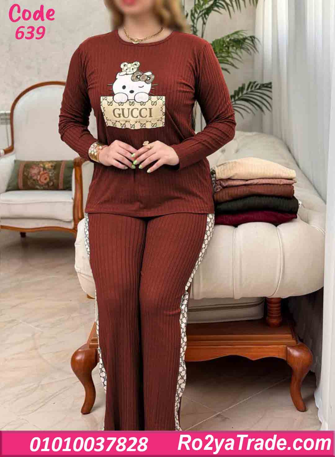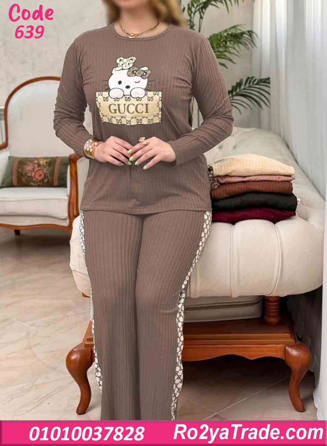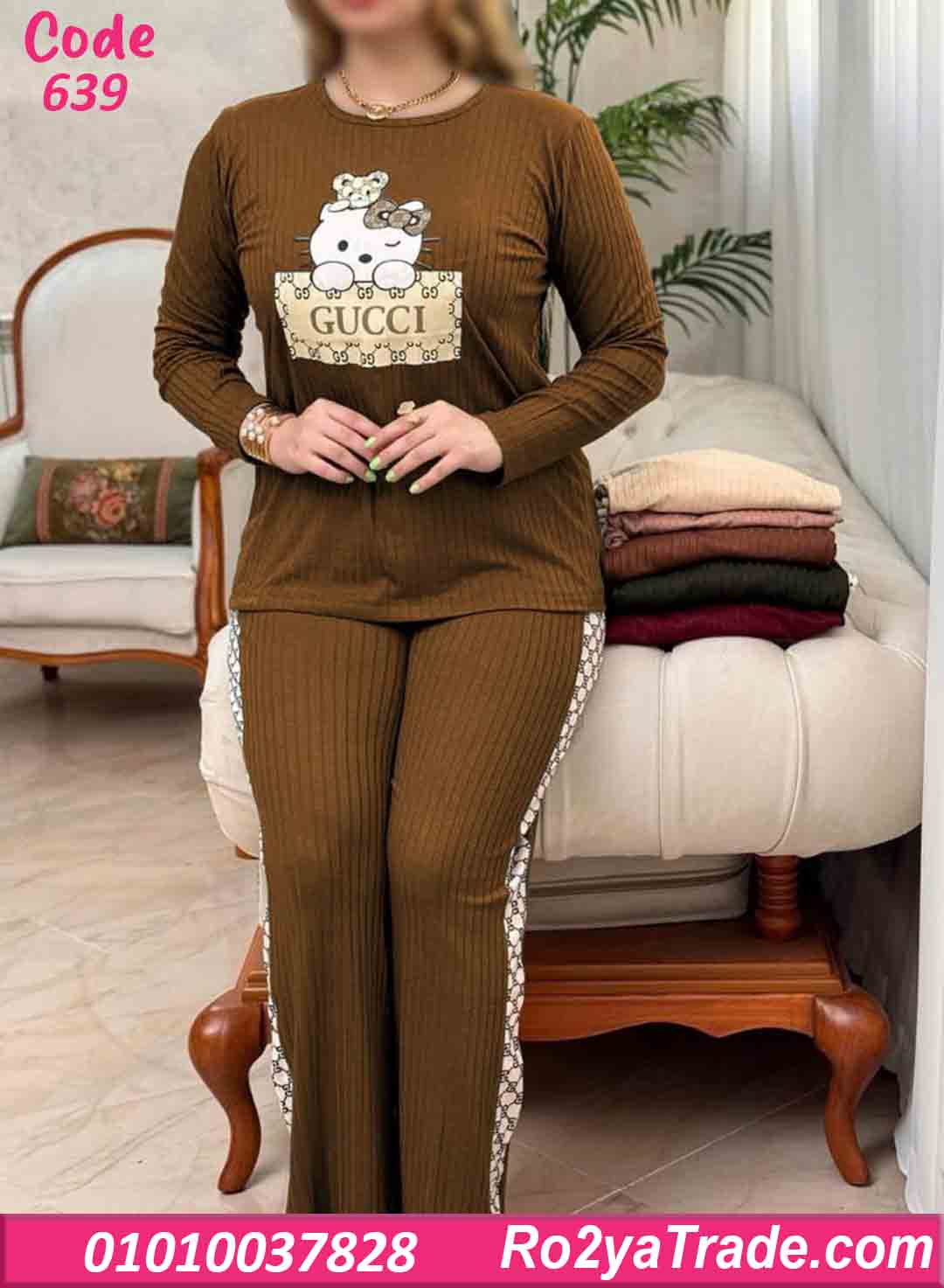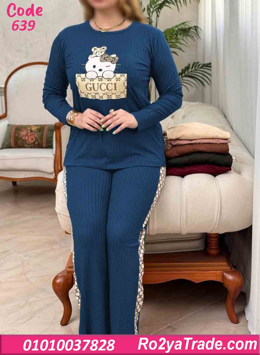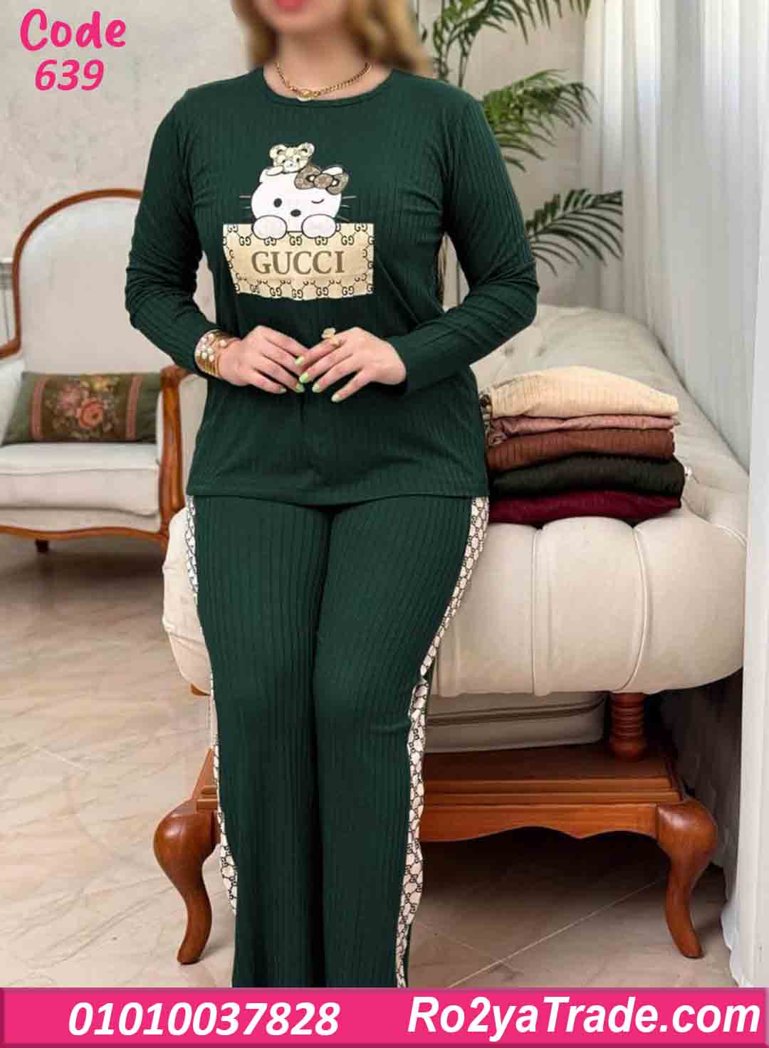 ترنج شتوي حريمي مميز بتصميم كاجوال أنيق مع رسمة كيوت مستوحاة من GUCCI على الصدر، مكون من بلوزة كم طويل وبنطلون مريح بخطوط جانبية أنيقة. خامة ناعمة ومريحة مناسبة للبيت والخروجات الخفيفة.