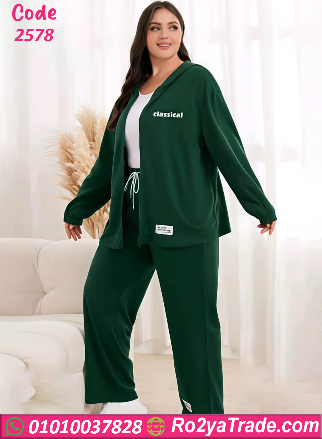 ترنج حريمي شتوي مكون من ثلاث قطع (جاكيت بغطاء رأس – تيشيرت داخلي – بنطلون) مصنوع من خامة قطنية ناعمة ومريحة تمنحك إحساس بالدفء والراحة طوال اليوم. يتميز التصميم بقصة مريحة تناسب الاستخدام اليومي.
