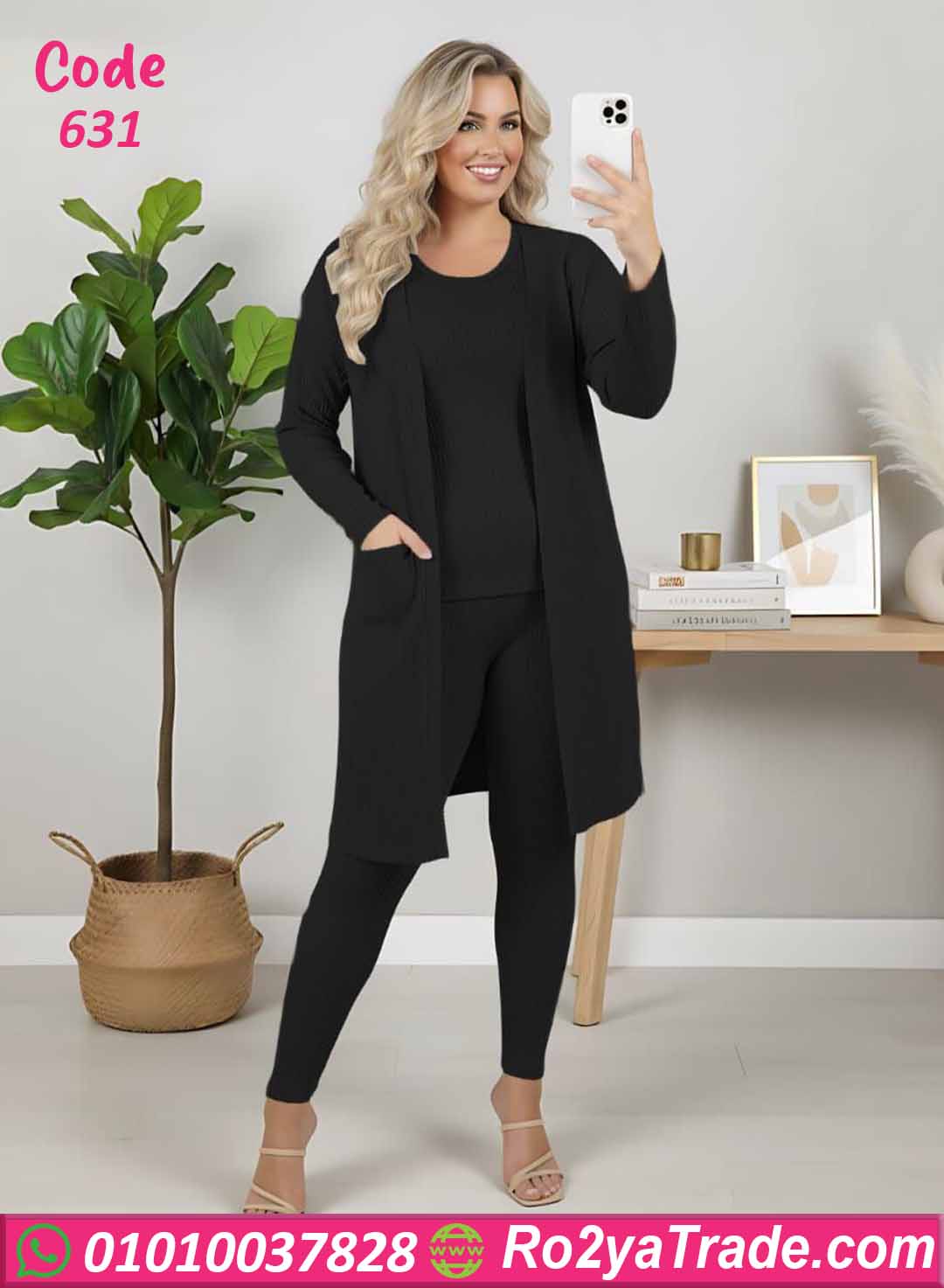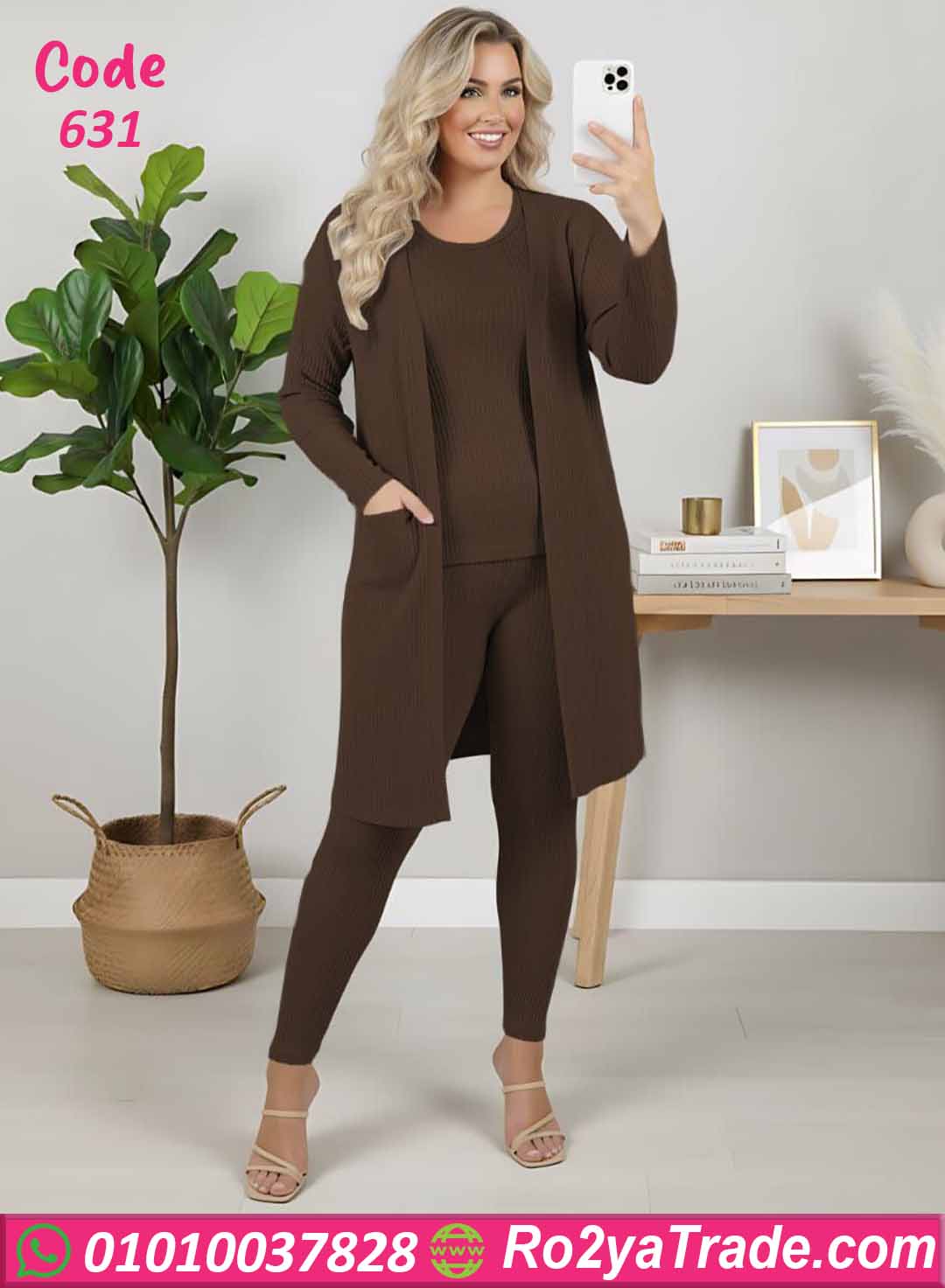 مكون من ثلاث قطع متناسقة (كارديجان طويل مفتوح + بلوزة داخلية + ليجن). الخامة مضلعة وناعمة تساعد على الاحتفاظ بالدفء
