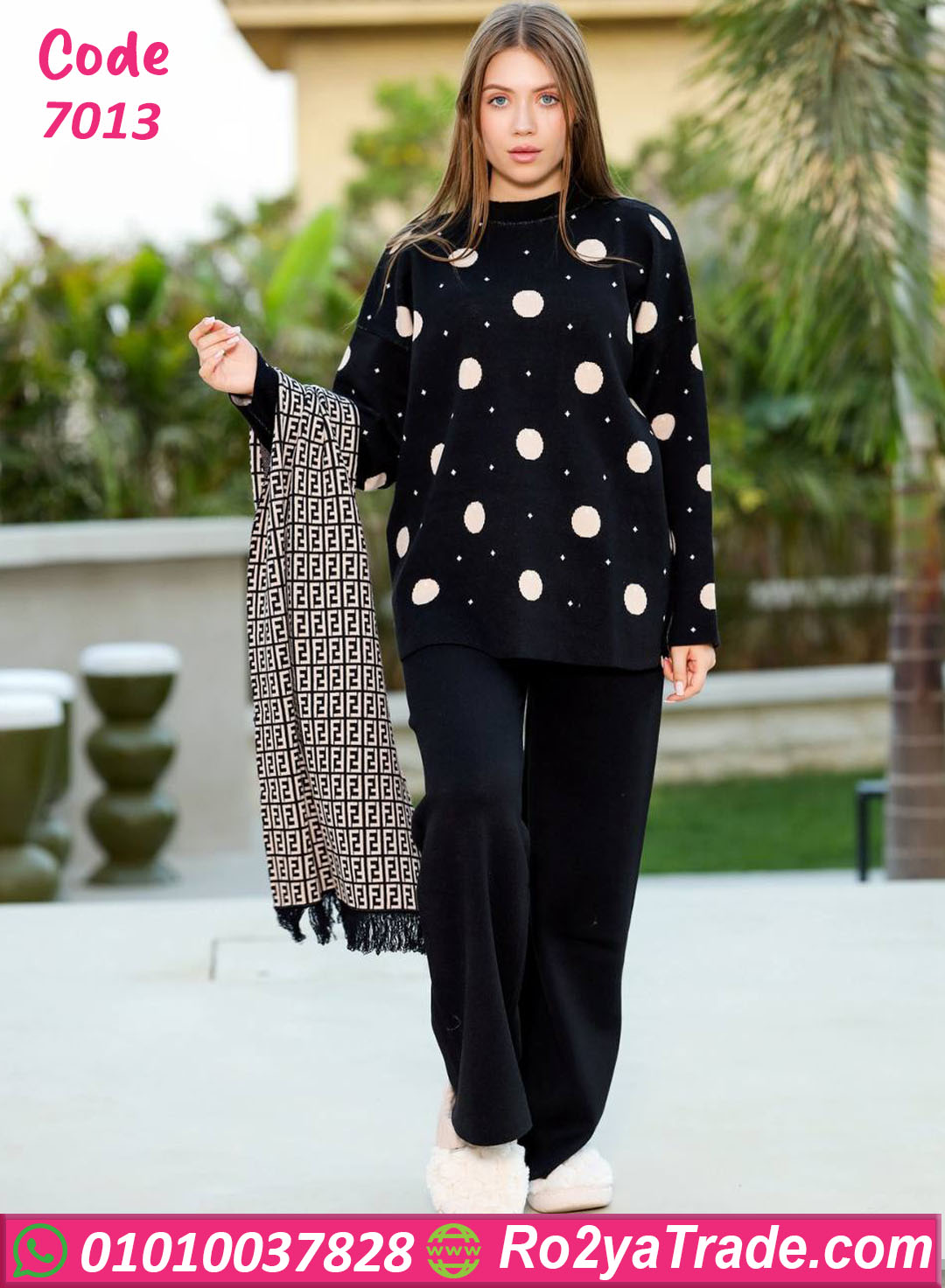 دلّعي نفسك في الشتاء بترنج حريمي أنيق بخامة صوف مريحة جدًا على الجسم، تصميم منقّط عصري باللون الأسود مع دوائر