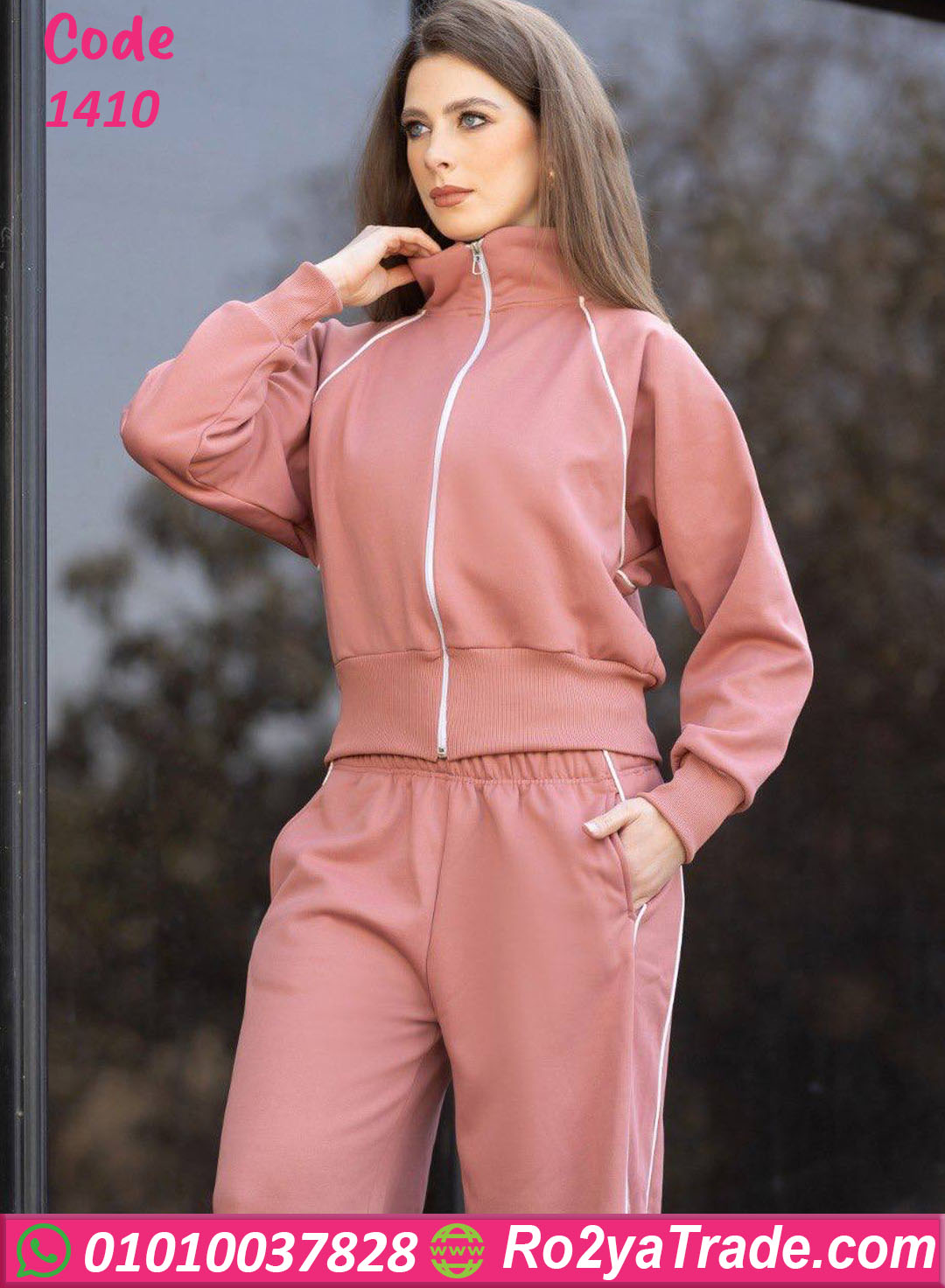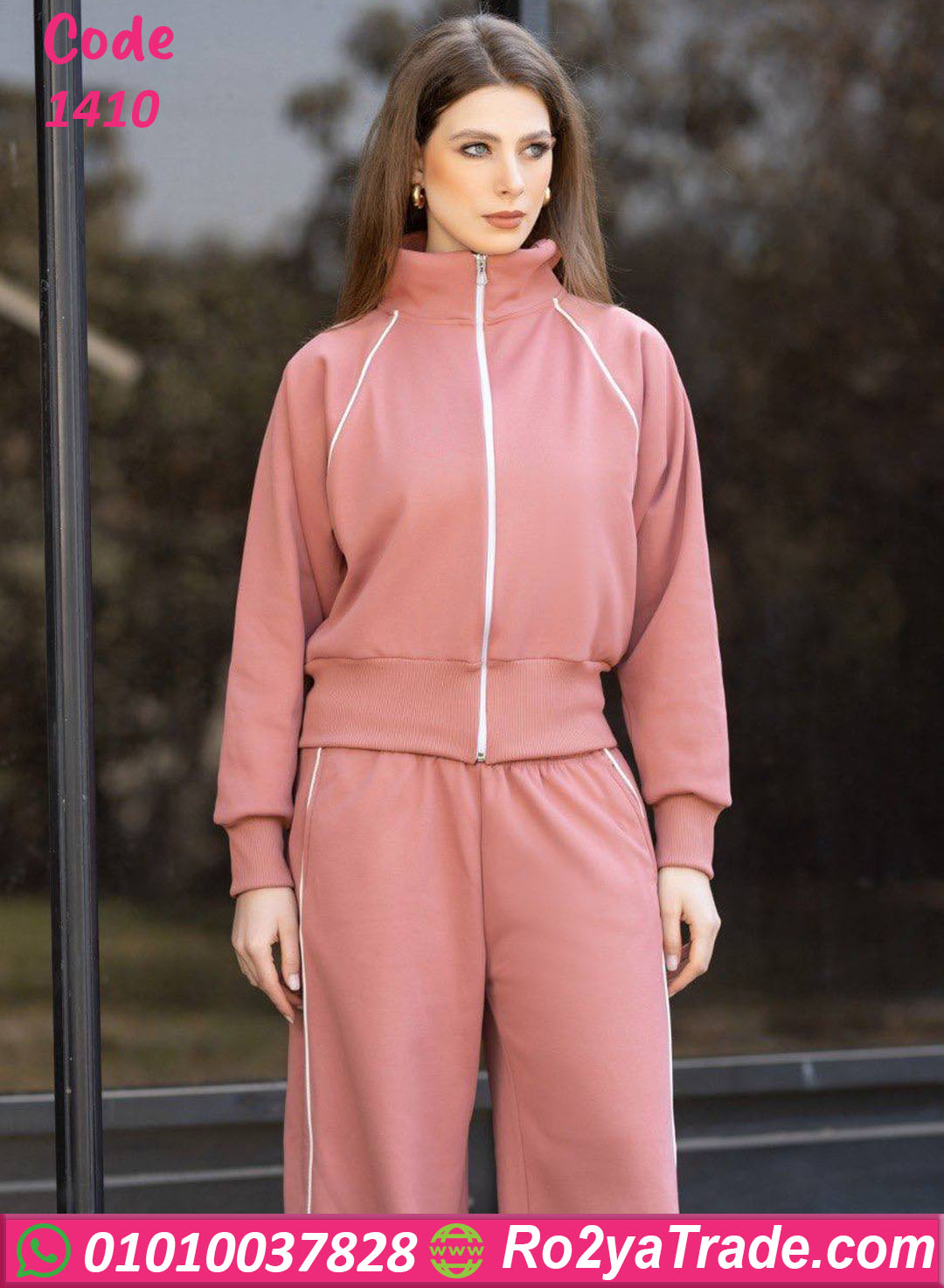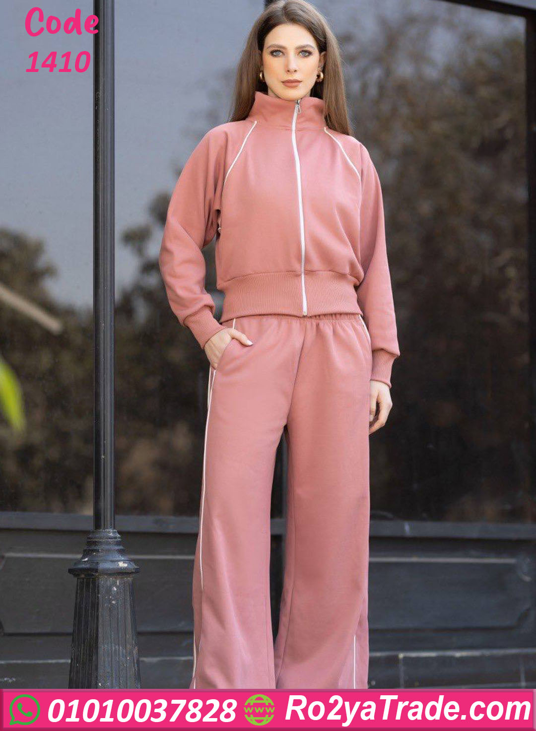 الترنج مكوّن من قطعتين؛ جاكيت بسوستة وبنطلون واسع مريح، تصميمه بسيط وأنيق يناسب كل الأذواق وسهل يتلبس في أي وقت خلال اليوم.