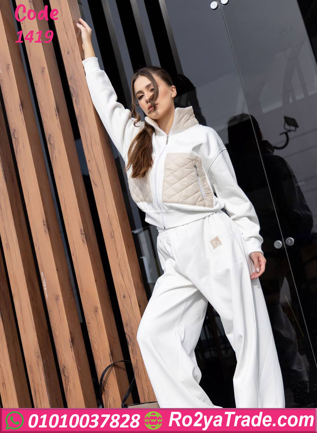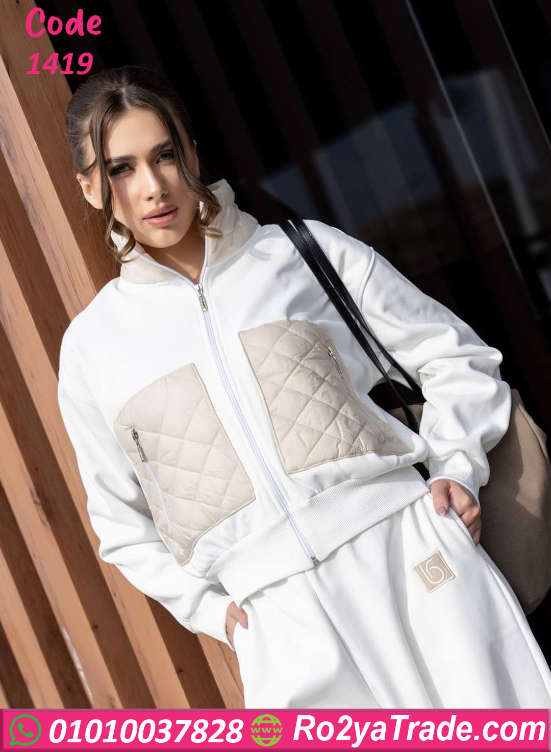 جاكيت بسوستة كاملة وبنطلون واسع مريح، والتصميم فيه لمسة عصرية بتخليه مناسب للستات اللي بتحب اللوك الكاجوال الأنيق.