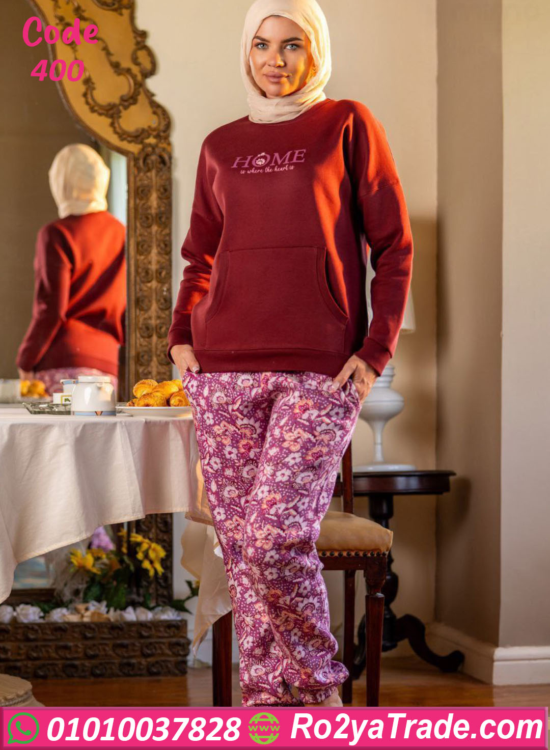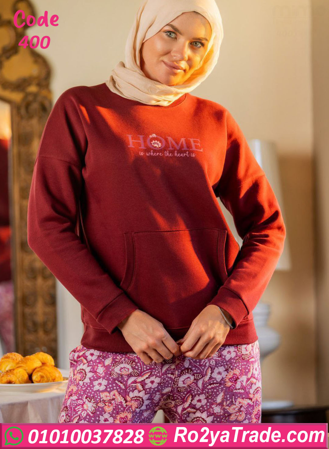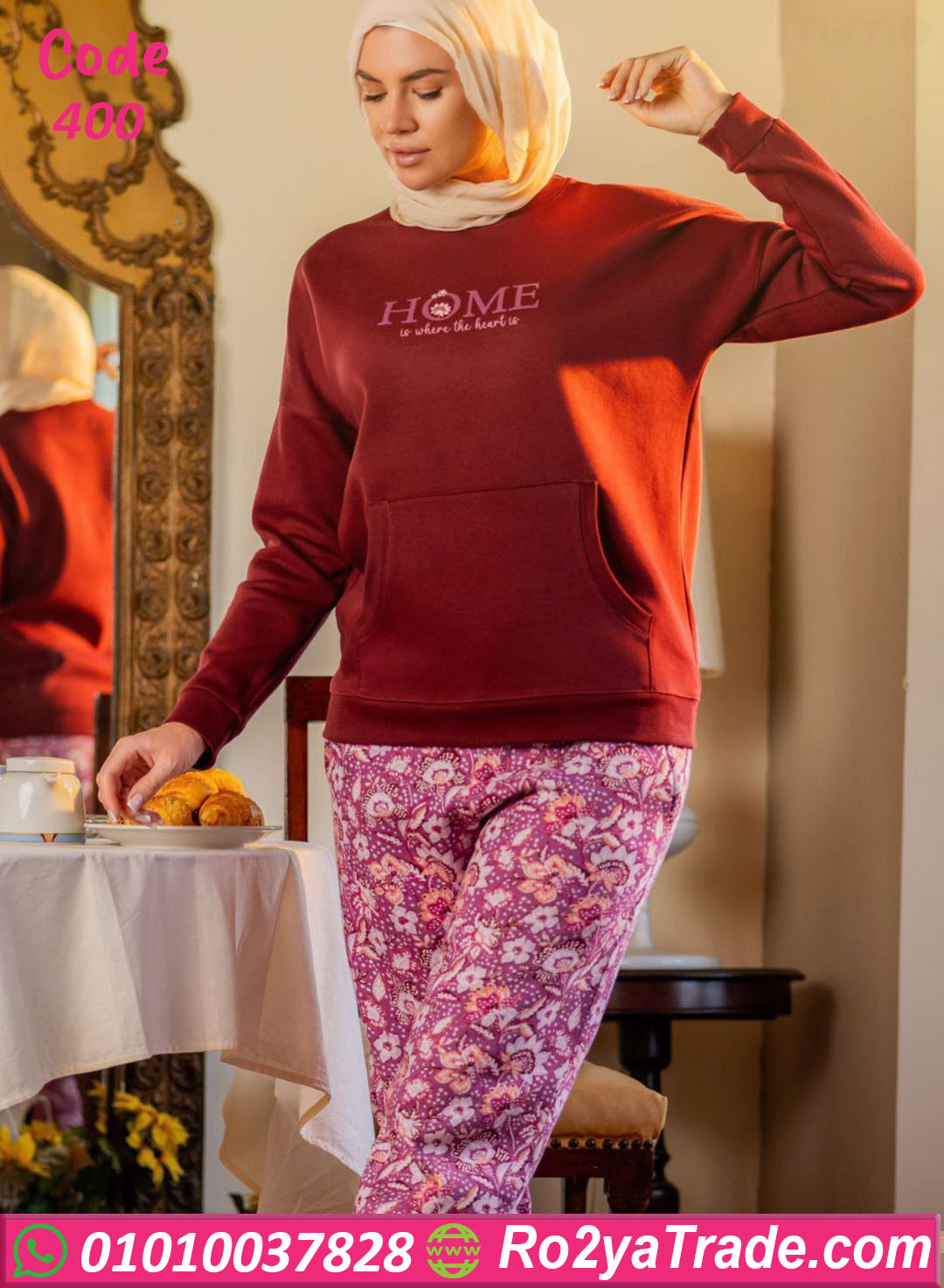 ترنج حريمي شتوي عملي ومريح جدًا، بلوزة برسمة HOME وبنطلون بطبعة فلاور مميزة. مناسب للبيت وللجو البارد ❄️
