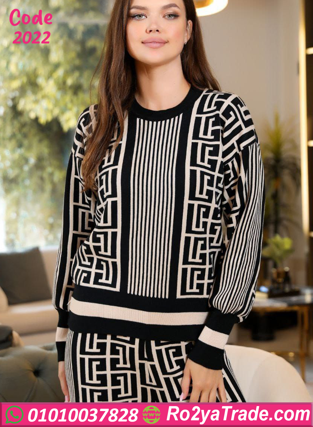 البلوفر مقفول من فوق بياقة دائرية مع بنطلون بنفس النقشة اللي بتكمل بعض بشكل مثالي، تقدر تلبسيه في البيت أو الخروج الكاجوال ويخليكي دايمًا ستايلش ومريحة في كل حركة 💫