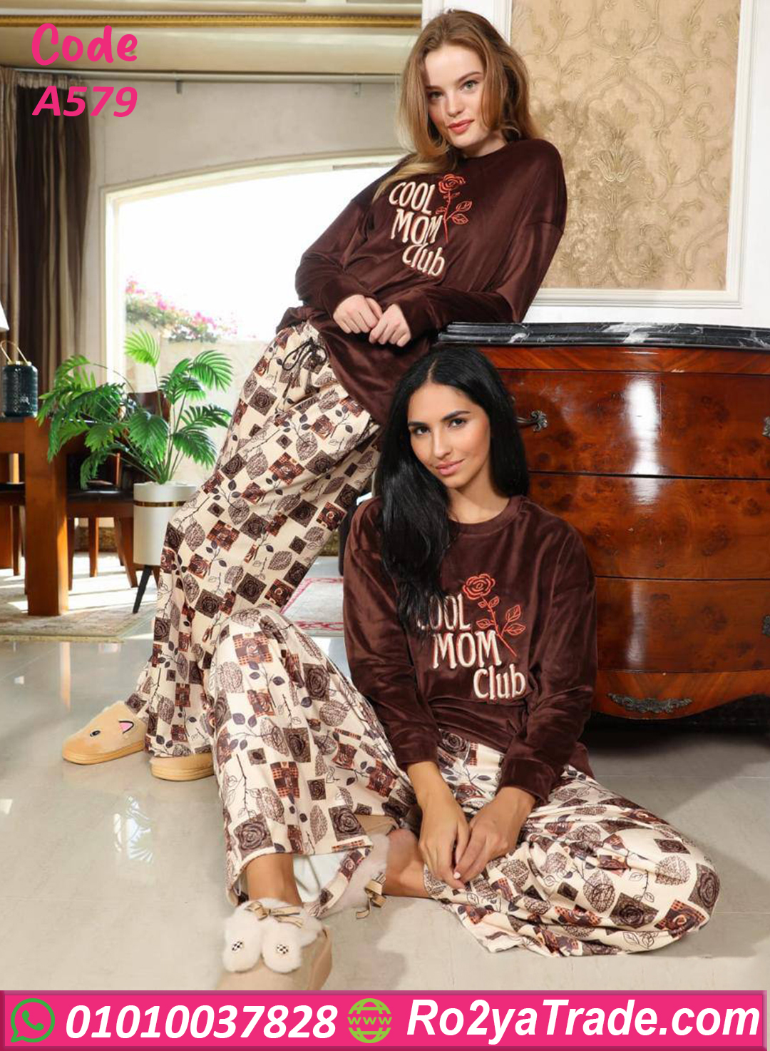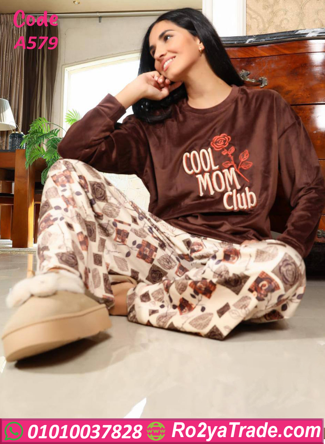 الترنج خامته قطيفة عالية الجودة بملمس ناعم جدًا على الجسم ودفا ممتاز في الشتاء، البلوزة بلون بني شيك ومكتوب عليها COOL MOM Club بتصميم لطيف يناسب كل الأذواق. البنطلون واسع ومريح بخامة ناعمة ونقشة مربعات بورود وأوراق شيك جدًا تدي شكل مختلف وجذاب.