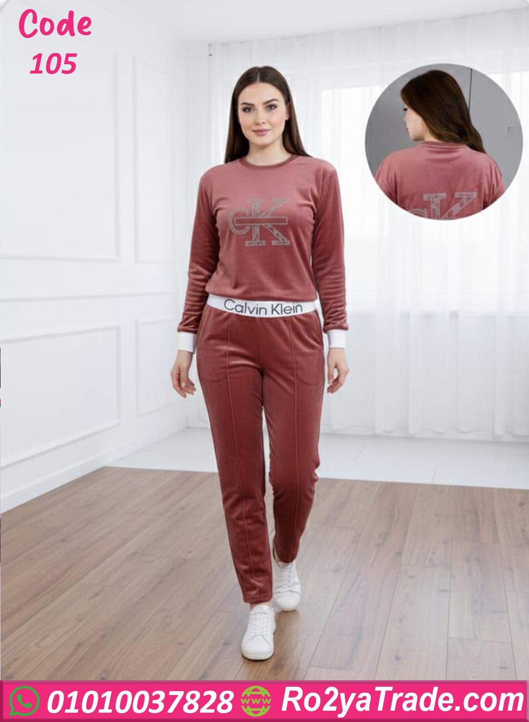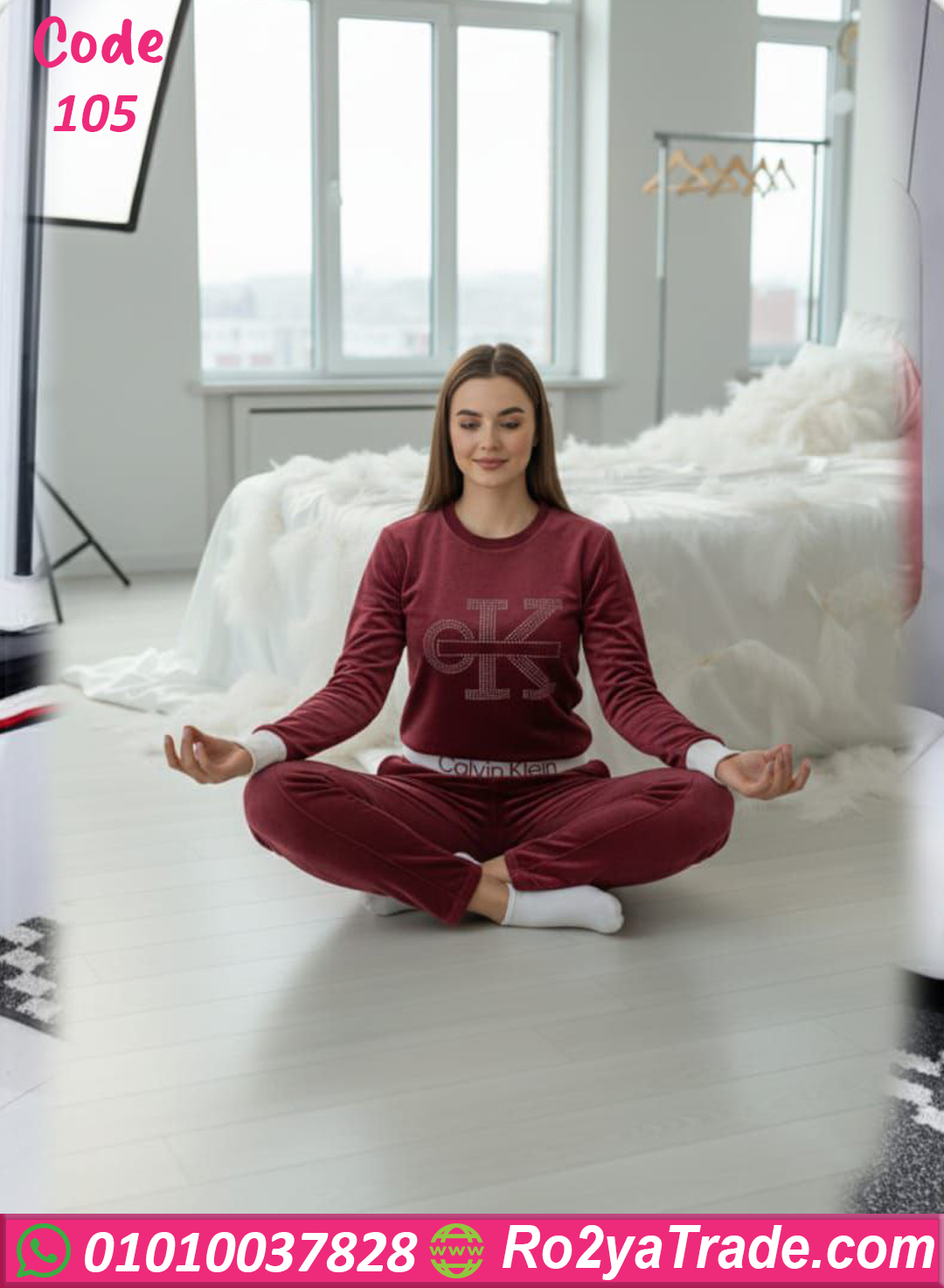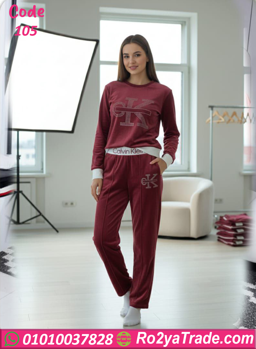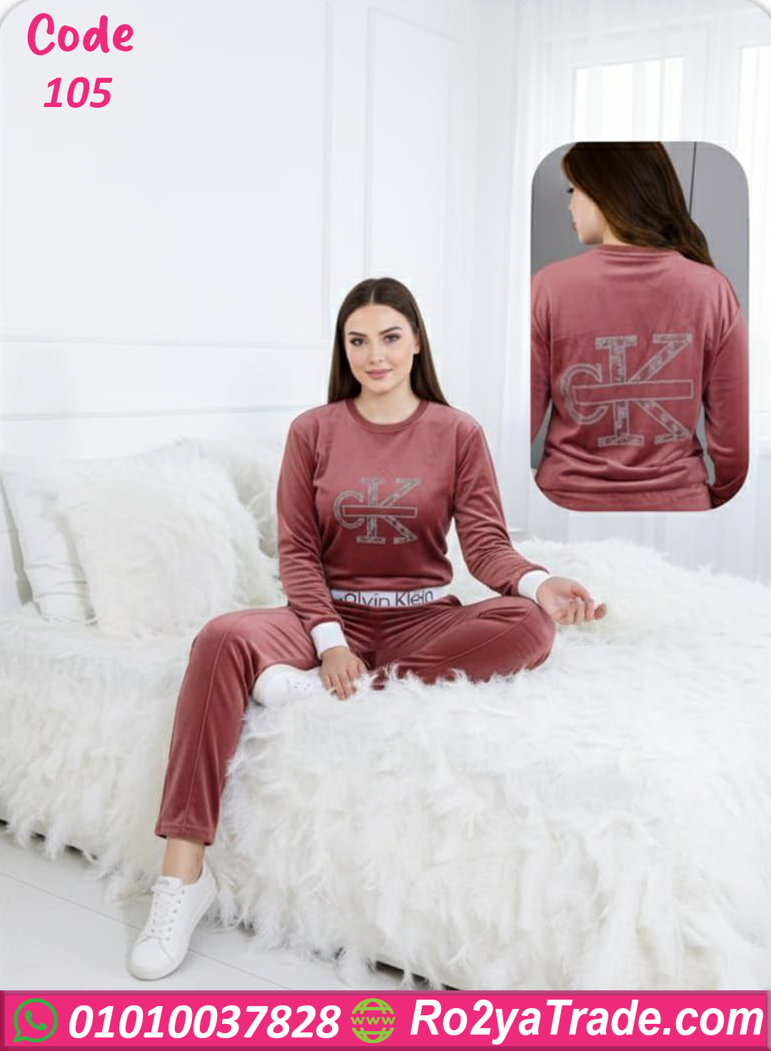 ترينج مخملي تحفة بخامة ناعمة ومريحة جدًا، قصته شيك ومرسوم CK على التيشيرت والبنطلون، مناسب للبيت والخروجات الكاجوال.