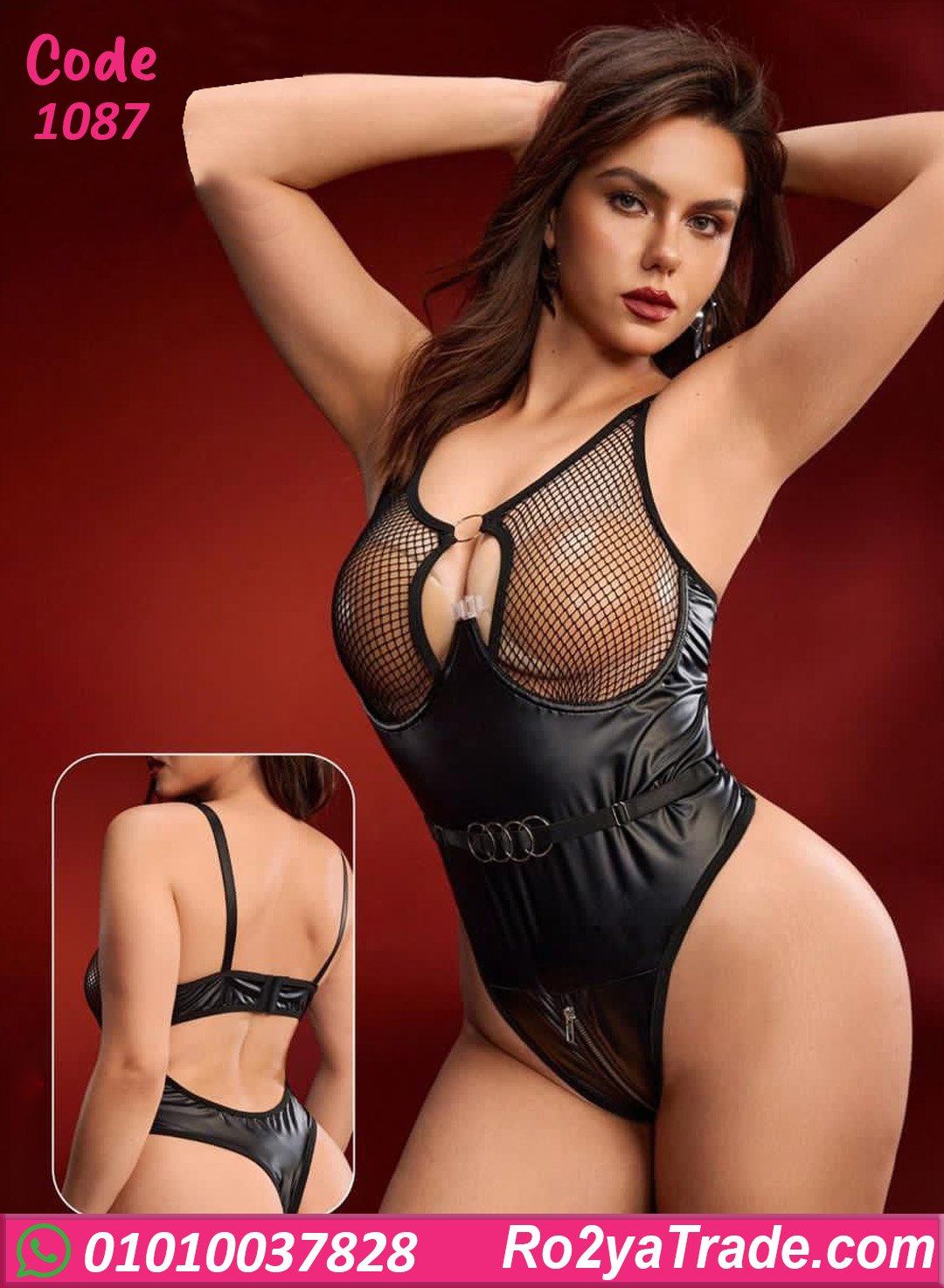 جمبسوت حريمي صيفي بخامة جلد لامعة مع شبك شفاف وقَصّة جريئة تبرز القوام بشكل أنثوي ملفت.