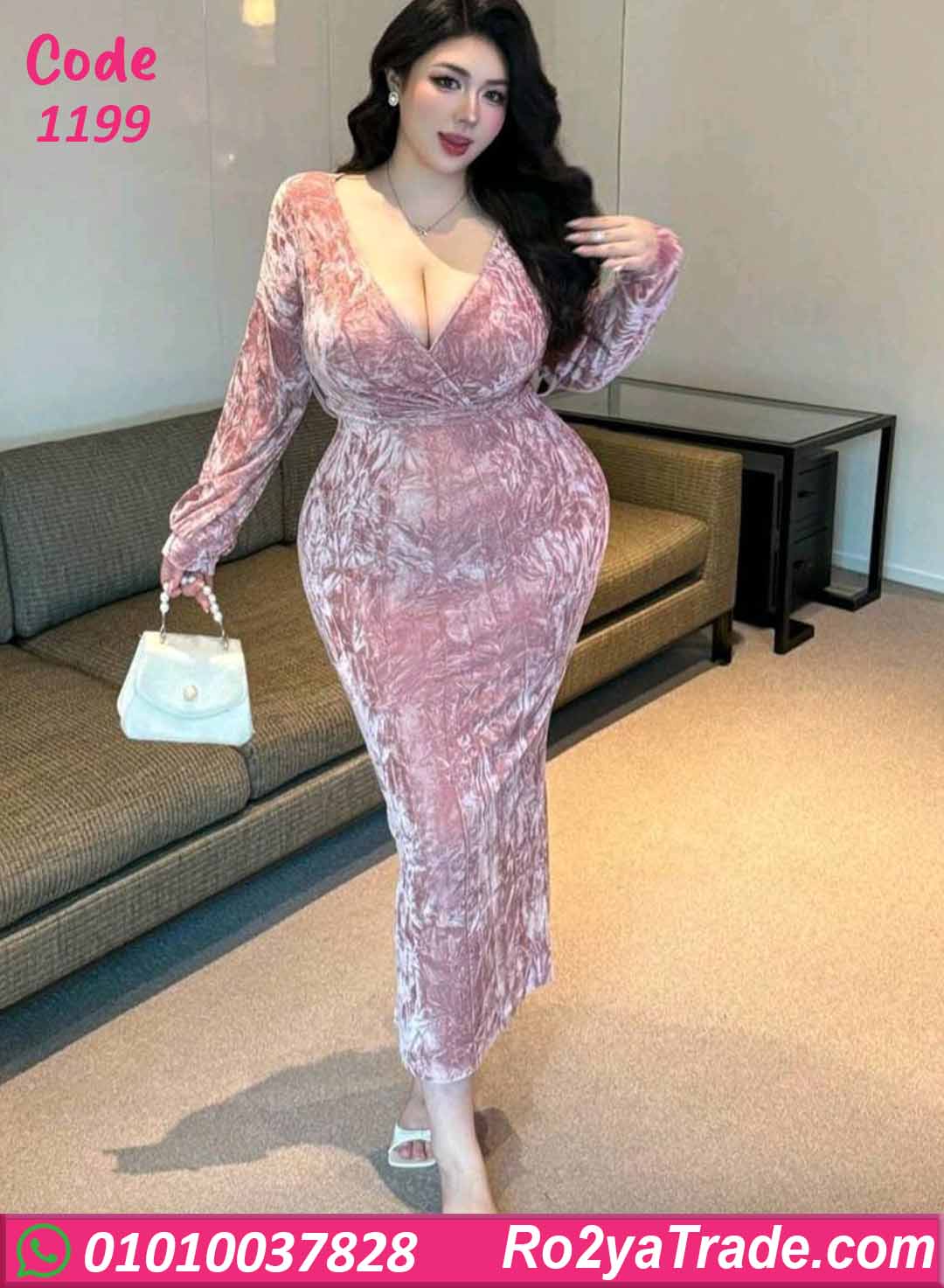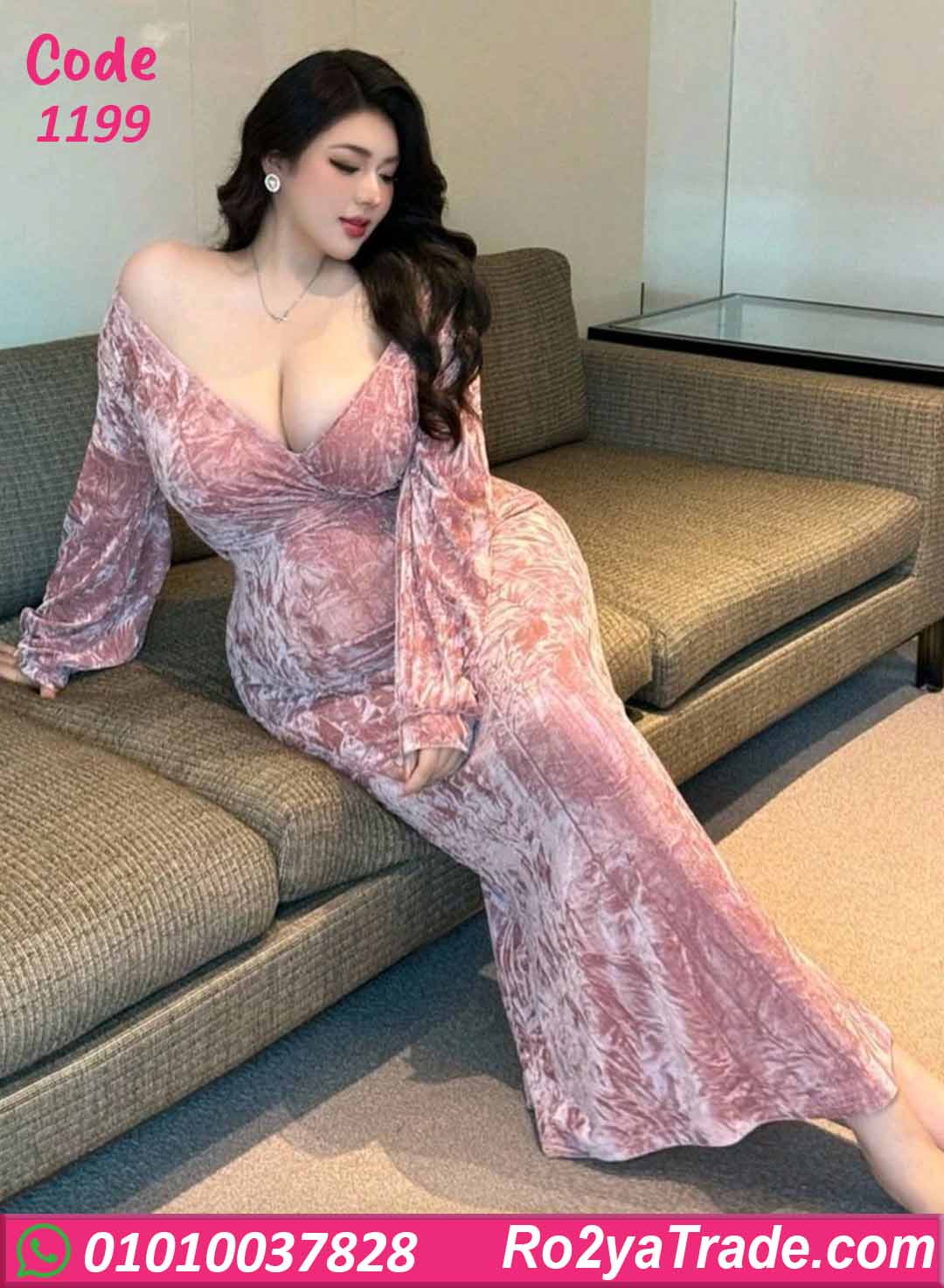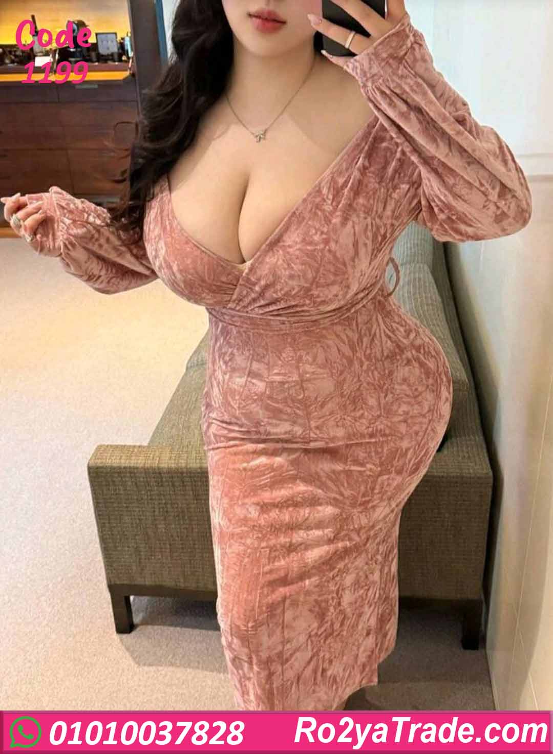 دريس شتوي طويل بخامة قطيفة فخمة بلون وردي ناعم، بقصة صدر متقاطعة بتبرز القوام وتدي شكل أنثوي شيك ومميز.