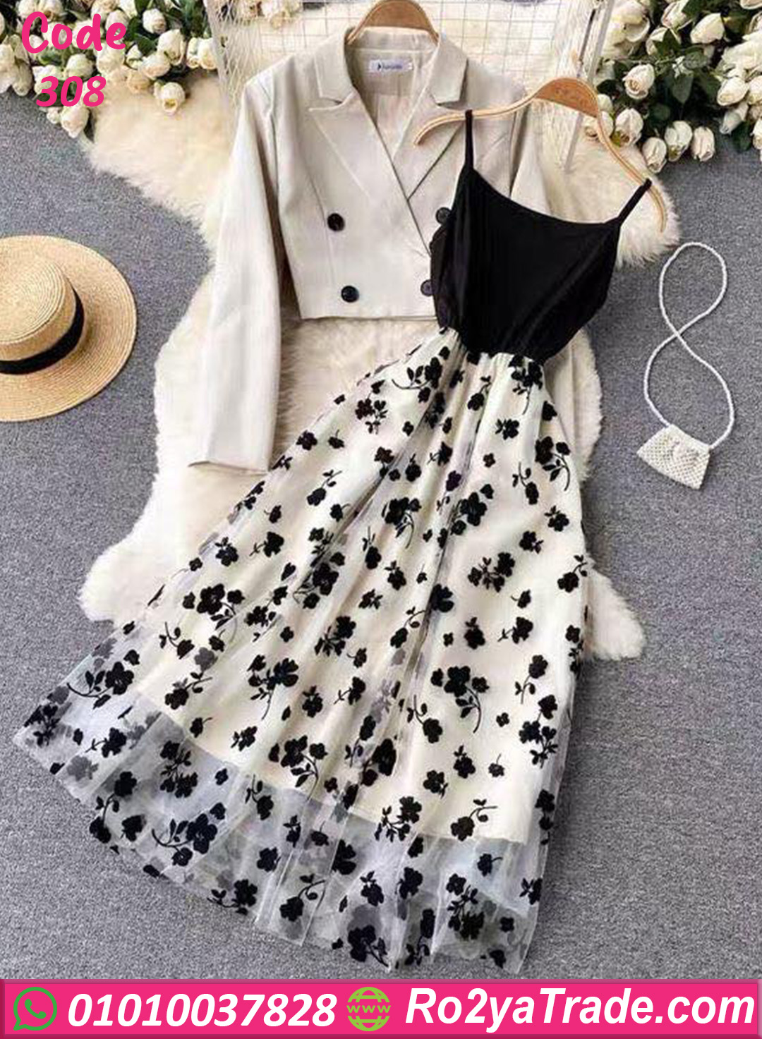 دريس حريمي كود 308 من ماركة Diana بتصميم صيفي أنيق يناسب الخروجات والمناسبات الخفيفة، حيث يجمع بين الفستان الطويل بنقشة ورد رقيقة والجاكيت القصير الذي يمنح الإطلالة لمسة عصرية مميزة.