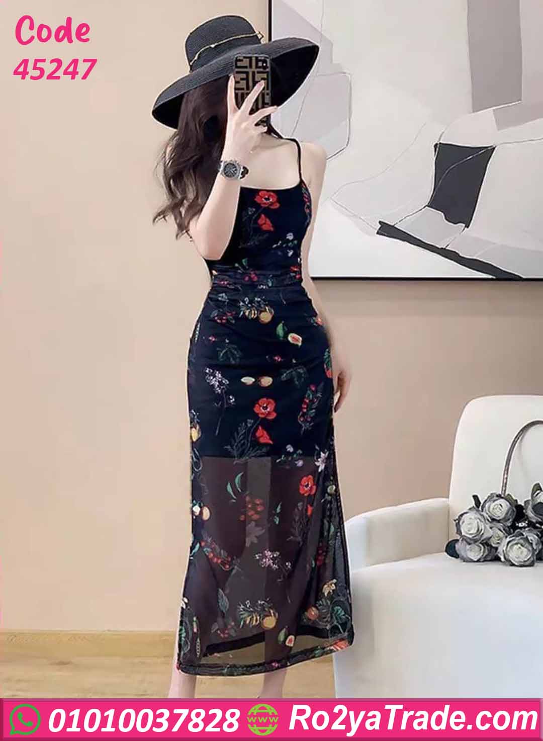 دريس صيفي طويل بتصميم حمالات رفيعة وقصة ضيقة على الجسم تبرز القوام بشكل أنيق، مع طبقة شيفون شفافة من أسفل تضيف لمسة جريئة وأنثوية. نقشة الورد الملونة على اللون الأسود بتدي لوك مميز ومختلف مناسب للسهرات، العزومات، والخروجات الصيفية الراقية. خامة خفيفة ومريحة في اللبس وتديكي حركة ناعمة أثناء المشي.