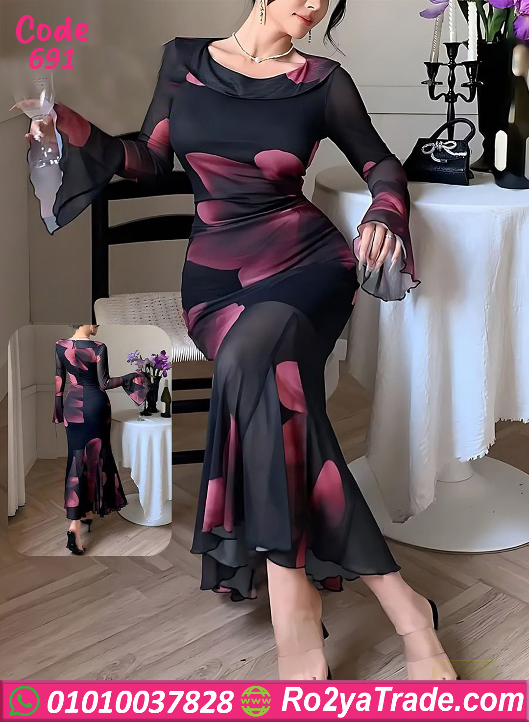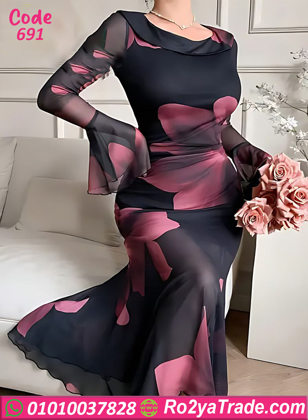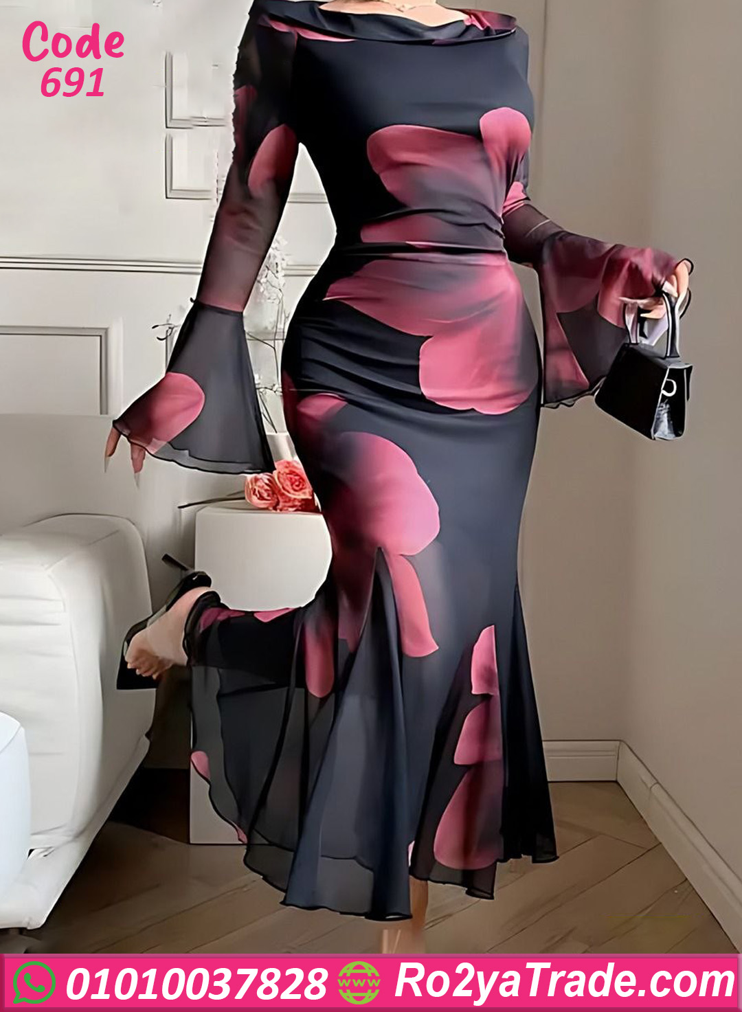 دريس صيفي أنيق بتصميم فخم ومطبوع وردات كبيرة بلون نبيتي على أرضية سودا شيك، خامته شيفون خفيفة وناعمة بتدي إحساس راقي ومريح، تصميم بأكمام طويلة واسعة ولمسة انسيابية بتبرز القوام وتدي أناقة مميزة، مناسب للسهرات، المناسبات الخاصة، والخروجات الراقية بإطلالة أنثوية جذابة.