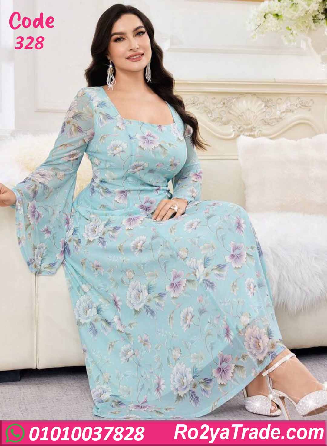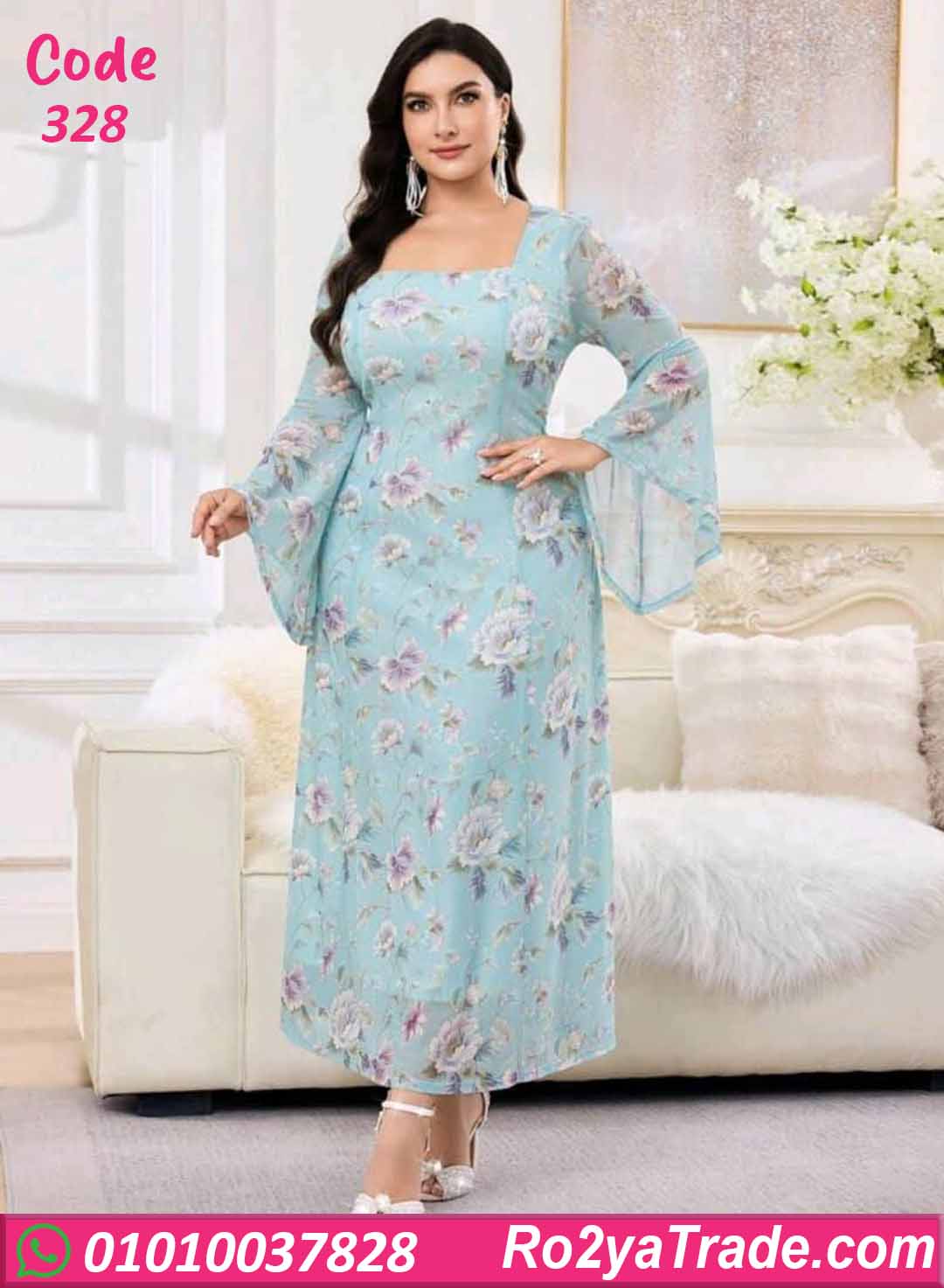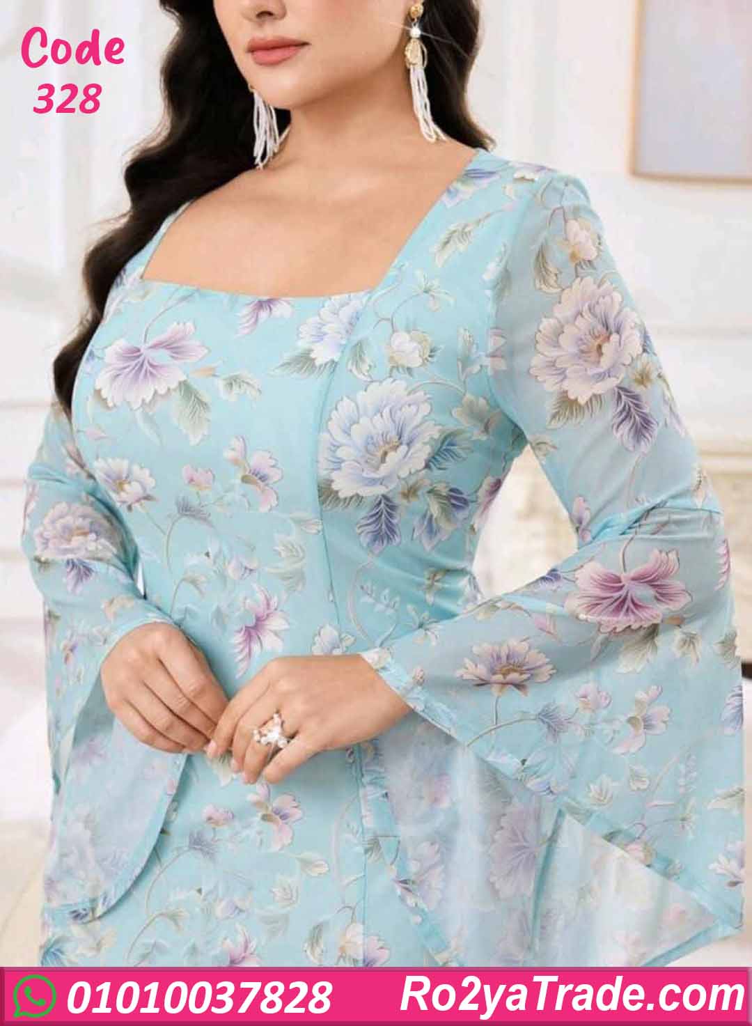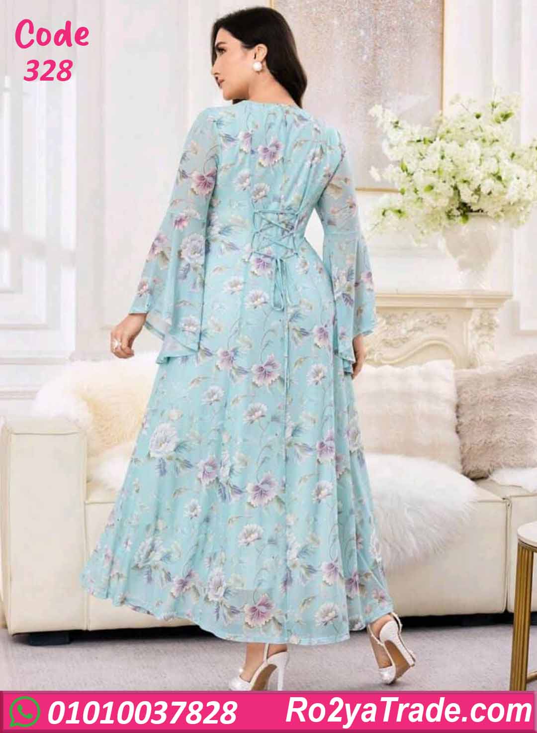 دريس صيفي طويل كود 328 بتصميم أنيق مع نقشة ورد هادية وأكمام شيفون واسعة تضيف