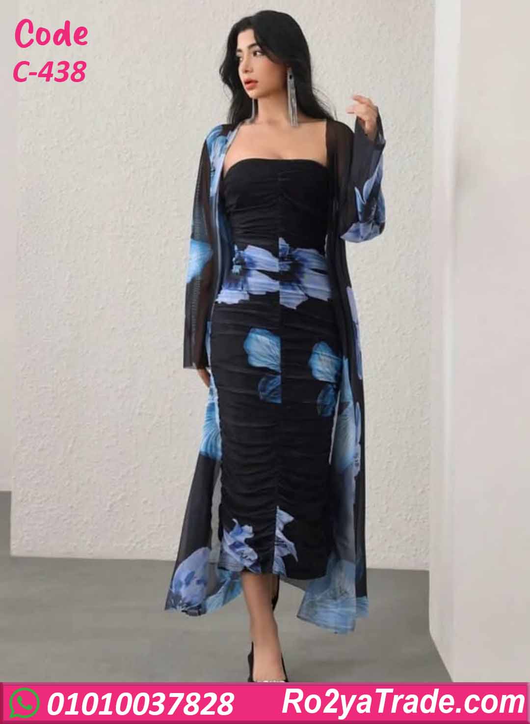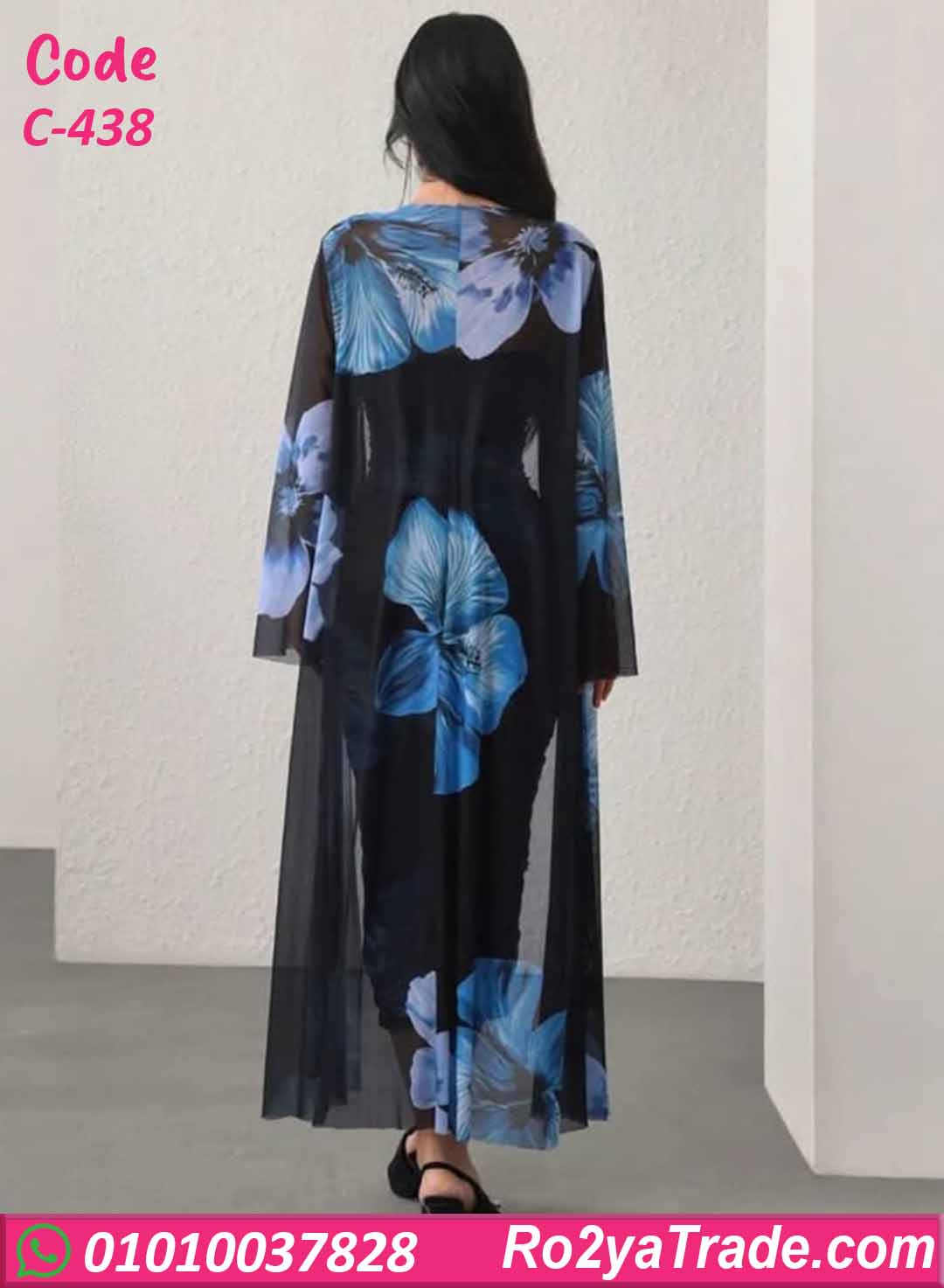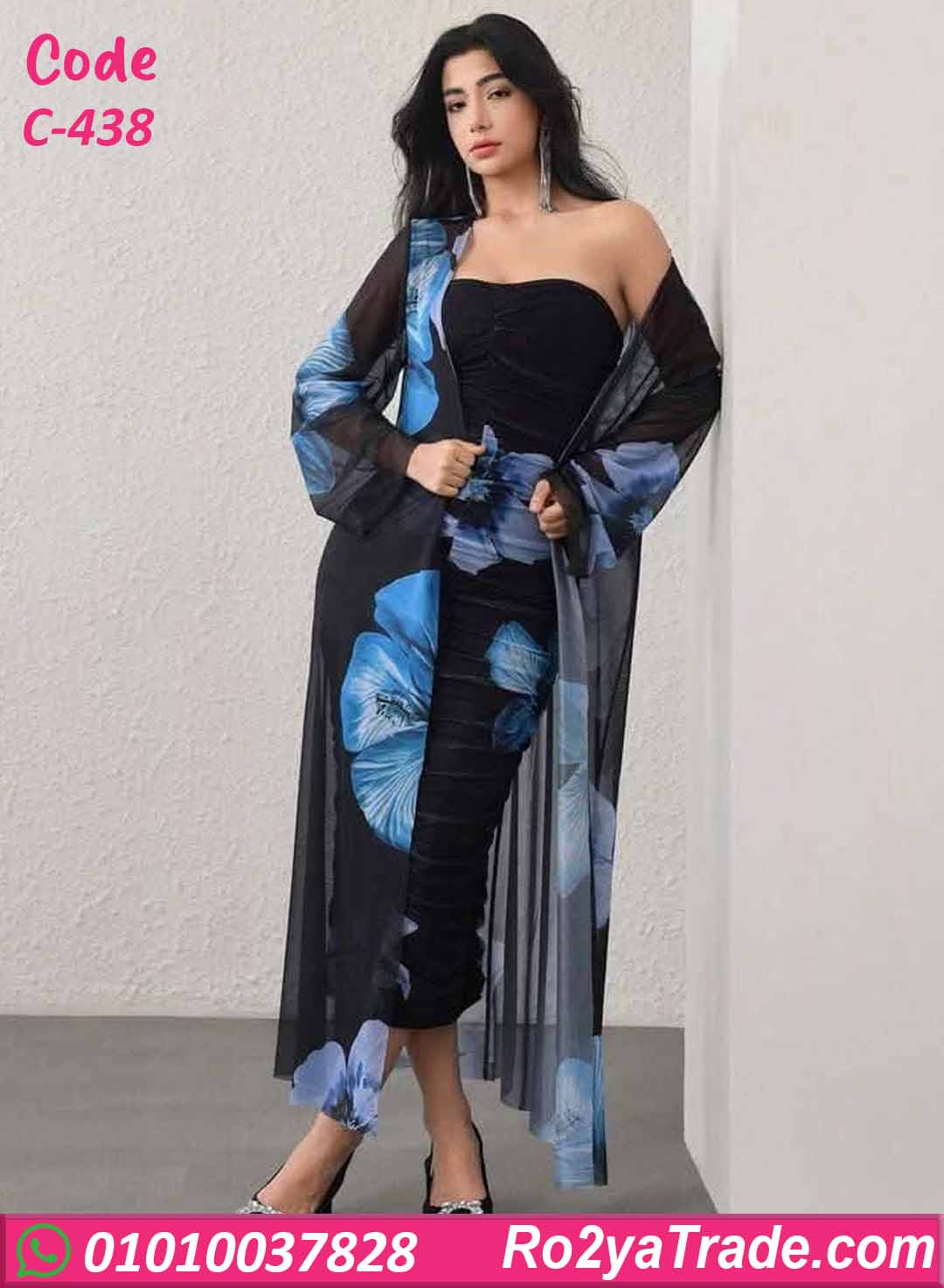 دريس صيفي طويل شيك بتصميم أنيق ونقشة مميزة، مع روب شفاف خفيف بيكمل اللوك ويدي شكل راقي وجذاب، مناسب للخروجات الصيفي والمناسبات الخفيفة.
