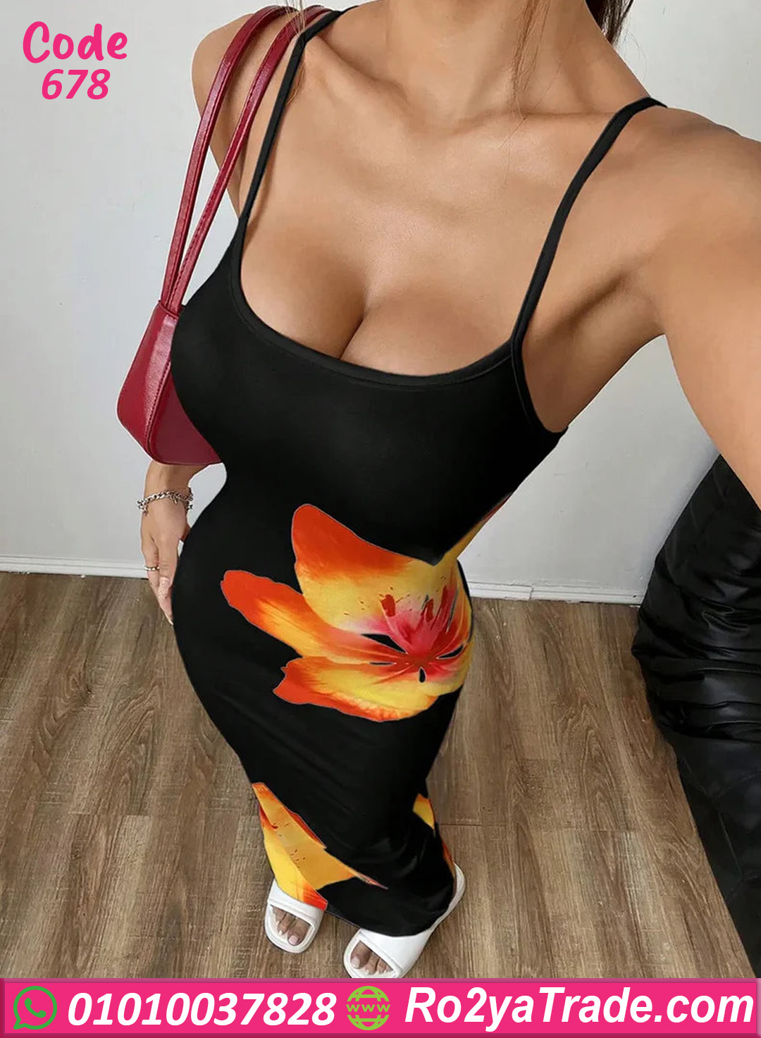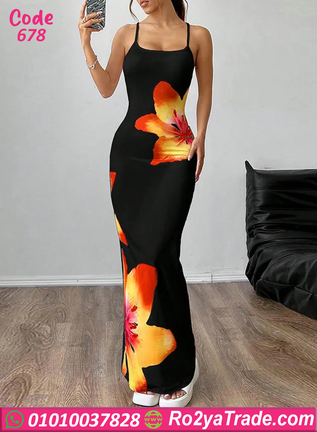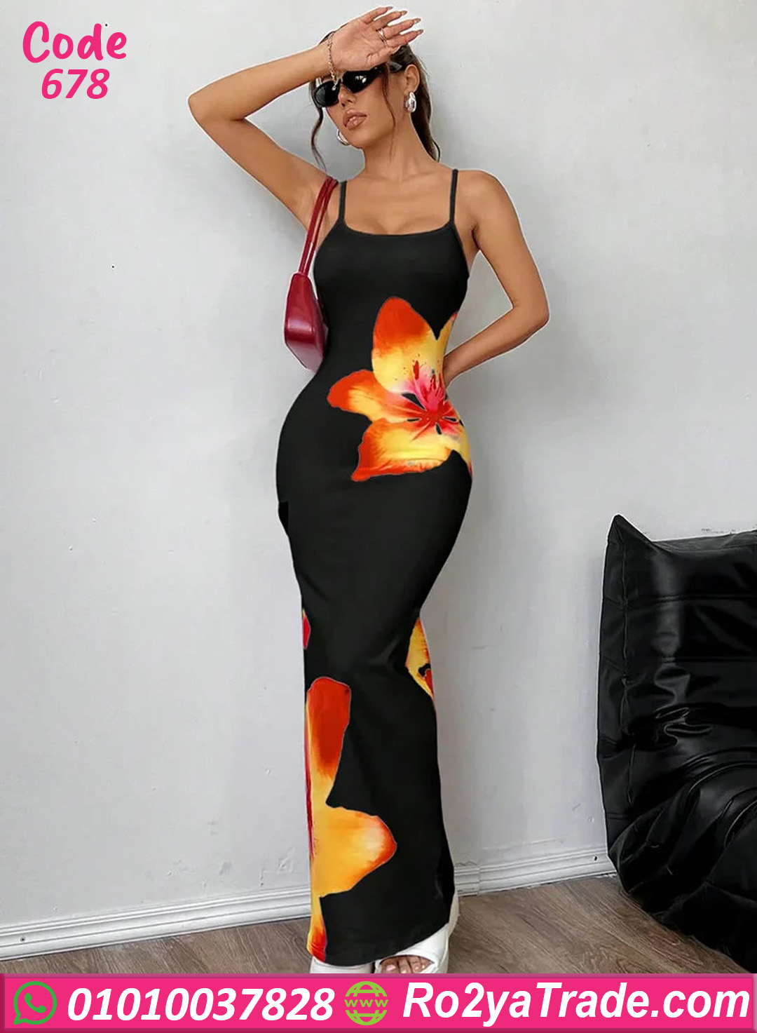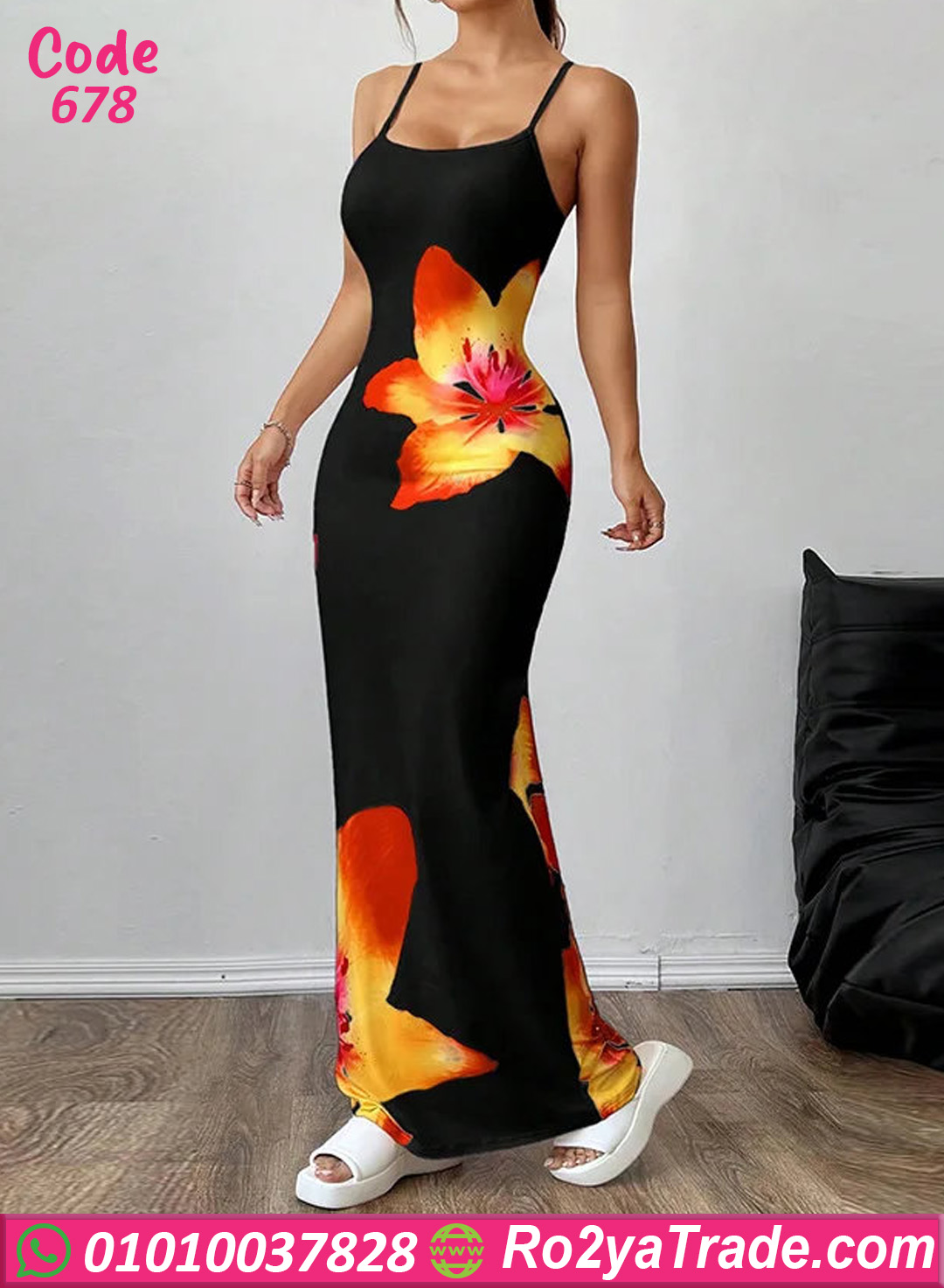 دريس صيفي أنيق بتصميم جذاب ومطبوع وردة كبيرة بألوان دافية على أرضية سودة شيك، خامته ناعمة ومطاطة بتبرز القوام وتدي إحساس بالراحة طول اليوم، تصميم بحمالات رفيعة وطول ماكسي يخليه اختيار مثالي للمشاوير، الخروجات الصيفي، أو إطلالة أنثوية بسيطة وشيك.