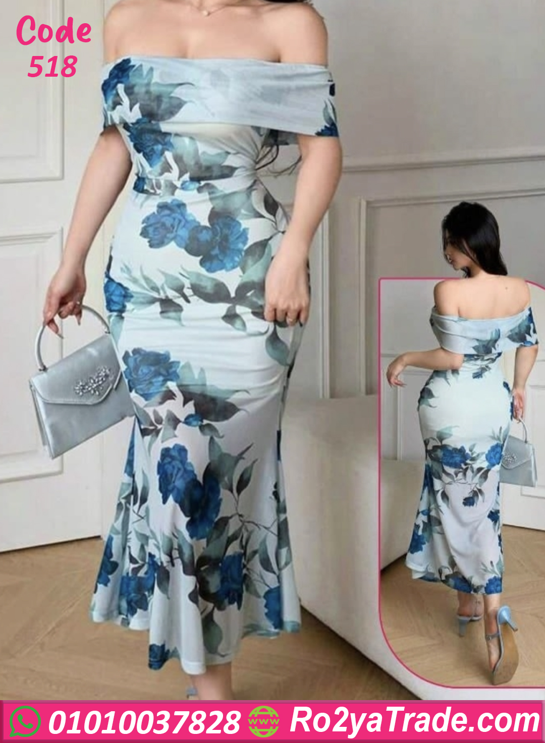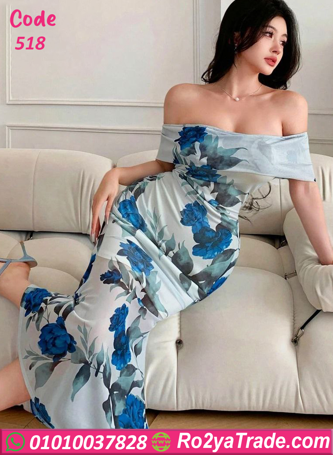 الخامة ناعمة وبتاخد شكل الجسم بنعومة، والتصميم الكتف الساقط مع نقشة الورود الزرقا بيدّوا لمسة فخامة وأنوثة.