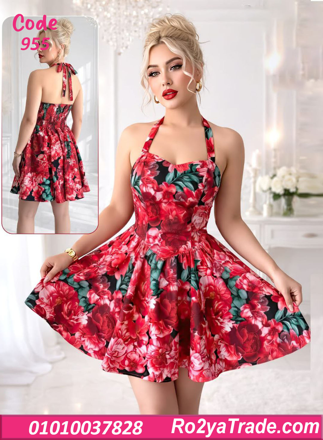 دريس صيفي قصير بنقشة ورد مميزة وألوان حيوية، تصميم صدر مشدود مع فتحة رقبة هالتر بتبرز القوام بشكل أنيق،