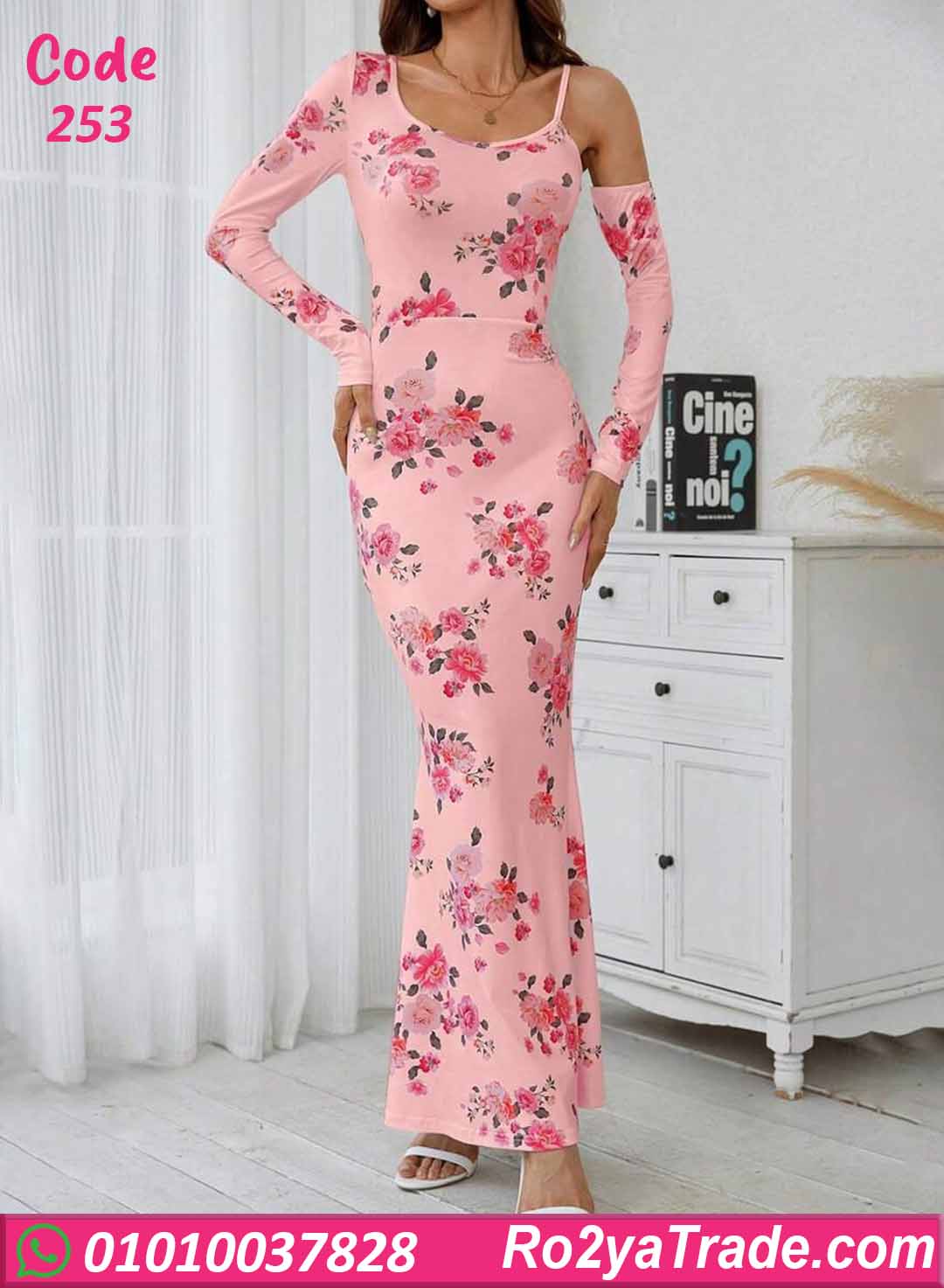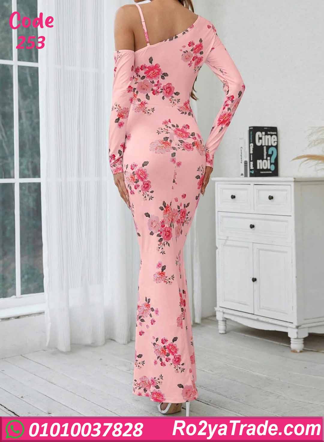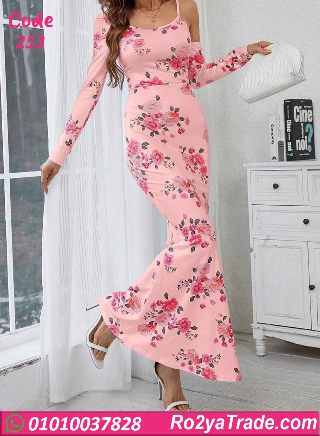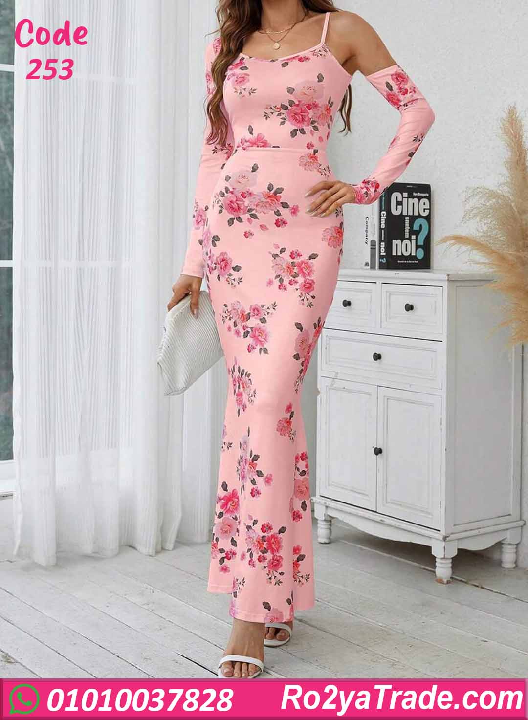 دريس صيفي طويل كود 253 بتصميم أنيق بطبعة ورد هادئة مع قصة شيك