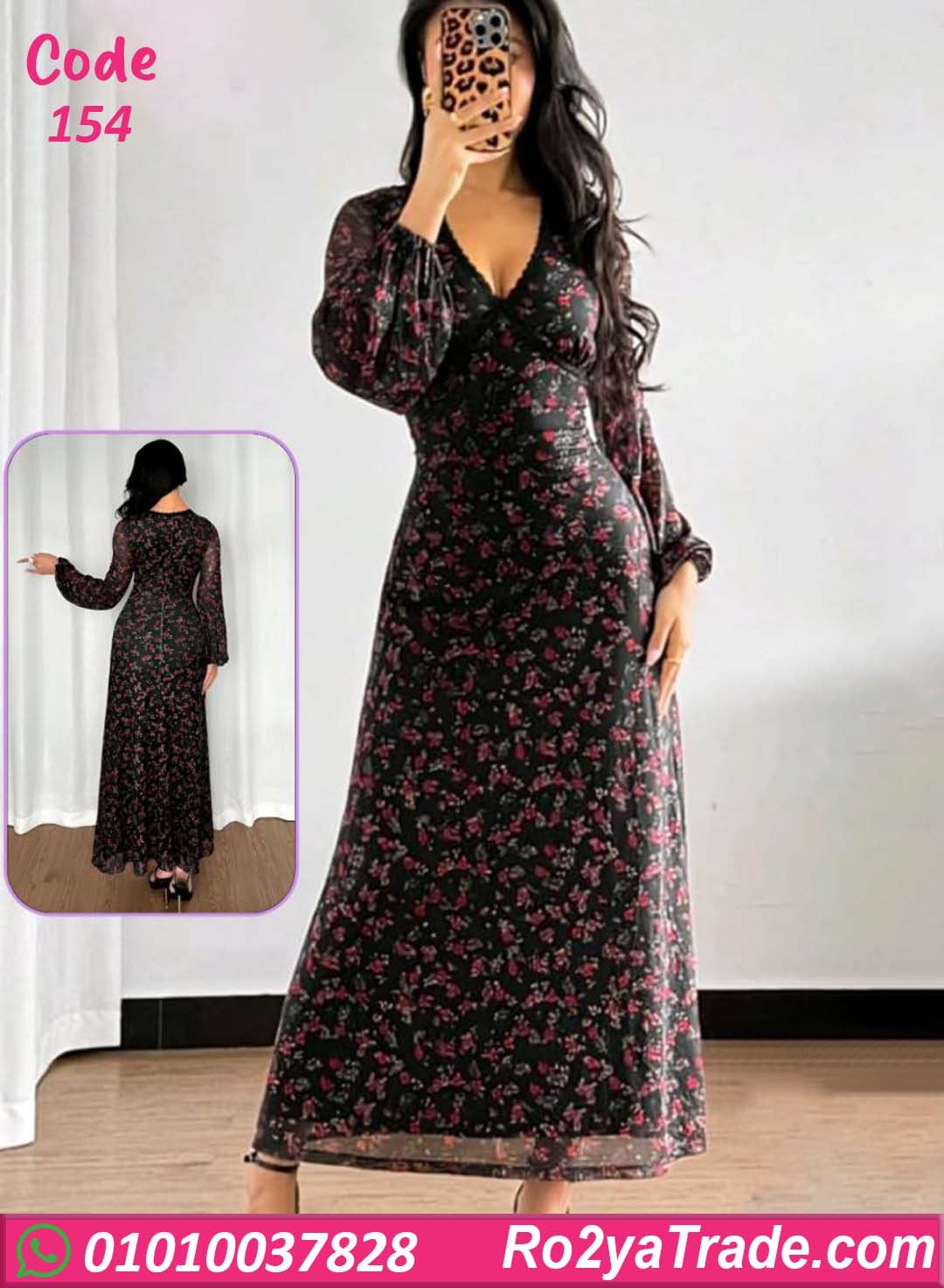 دريس صيفي طويل بتصميم أنثوي شيك ونقشة ورود رقيقة على أرضية سوداء بتدي شكل جذاب وراقي في نفس الوقت. الموديل بقَصّة محددة على الجسم من فوق مع فتحة صدر V ناعمة بتبرز جمال القوام، وأكمام طويلة خفيفة بتدي لمسة أنوثة وراحة في اللبس.