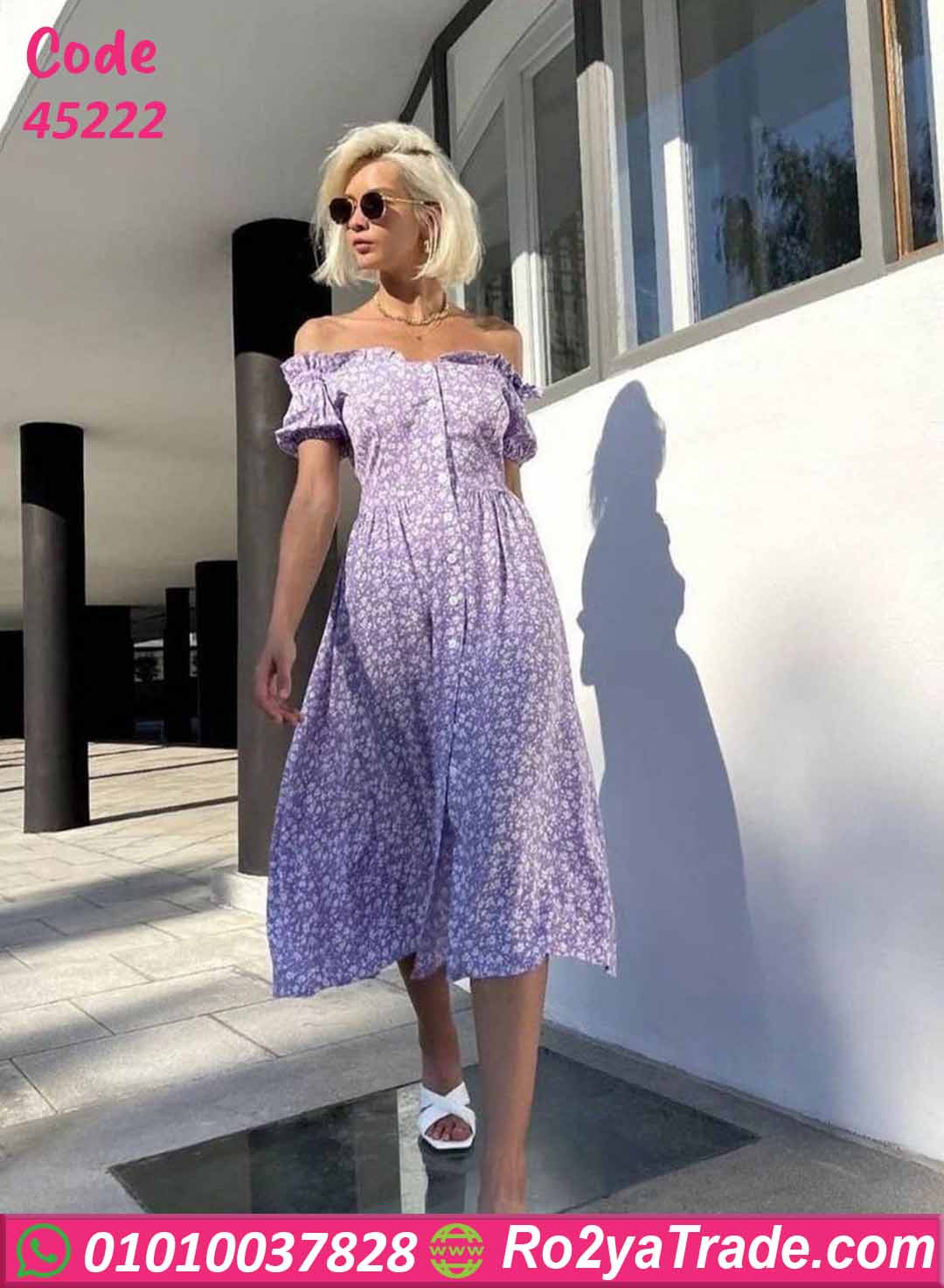 دريس صيفي قصير باللون الموف الفاتح بنقشة ورد صغيرة ناعمة تدي إحساس بالرقة والبساطة. تصميم أوف شولدر يبرز الكتفين بشكل أنثوي جذاب، مع أكمام قصيرة منفوشة ولمسة أزرار أمامية تضيف شكل شيك ومميز. خامة خفيفة ومريحة مناسبة للخروجات النهارية، المصايف، واللوك الكاجوال الأنيق.