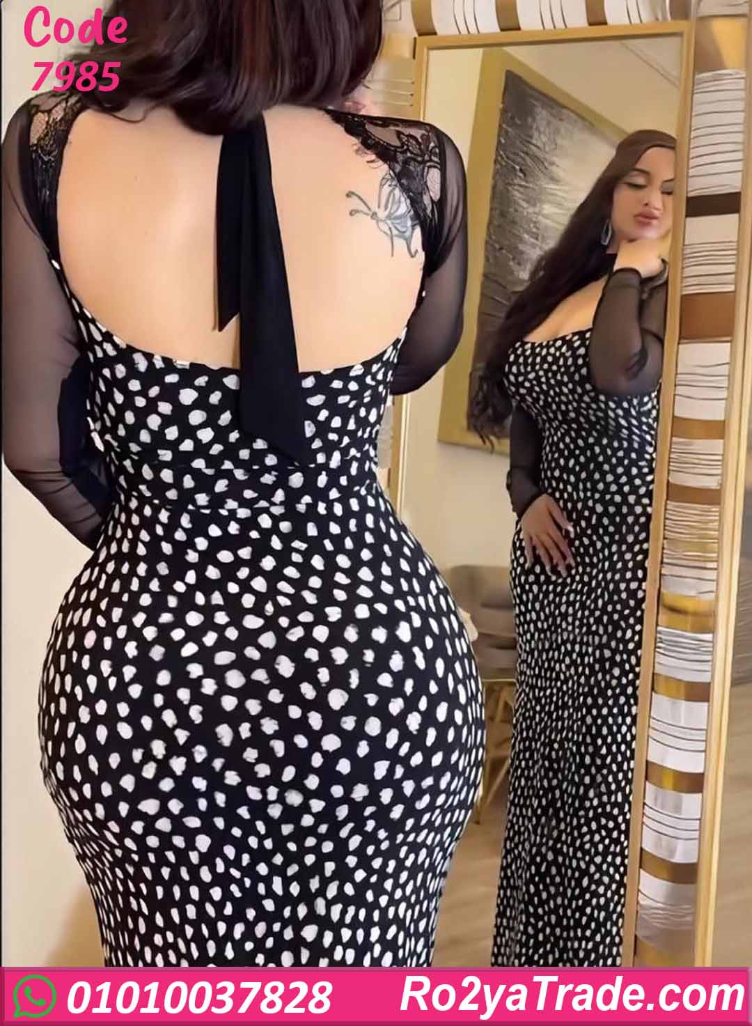 الفستان بنقشة منقطة أبيض في أسود بتدي طابع كلاسيكي راقي، مع قصة ضيقة على الجسم بتبرز القوام بشكل أنيق جدًا.