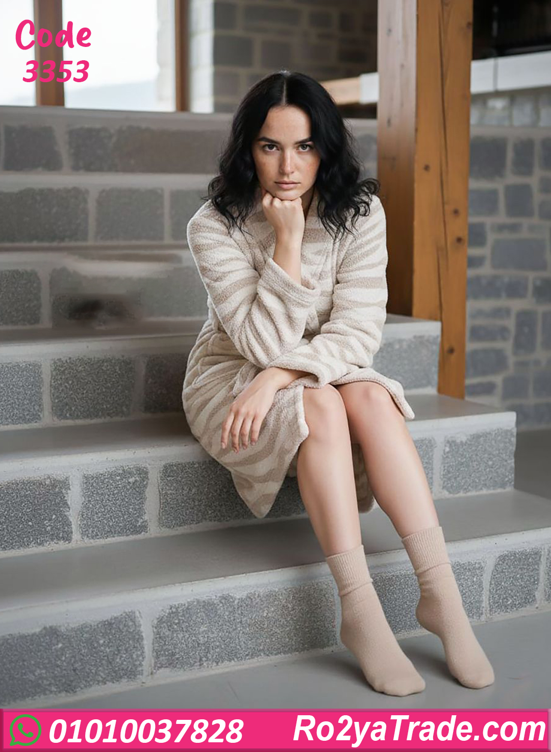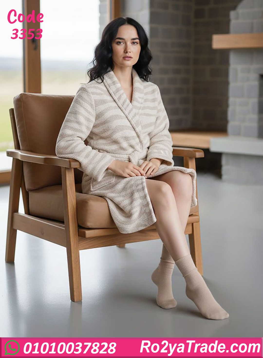 روب شتوي حريمي أنيق بخامة دافية وناعمة، تصميم عملي بقصة مريحة مع حزام على الوسط، مناسب للبيت وبيوفر إحساس دفـا وراحة في أيام الشتا.