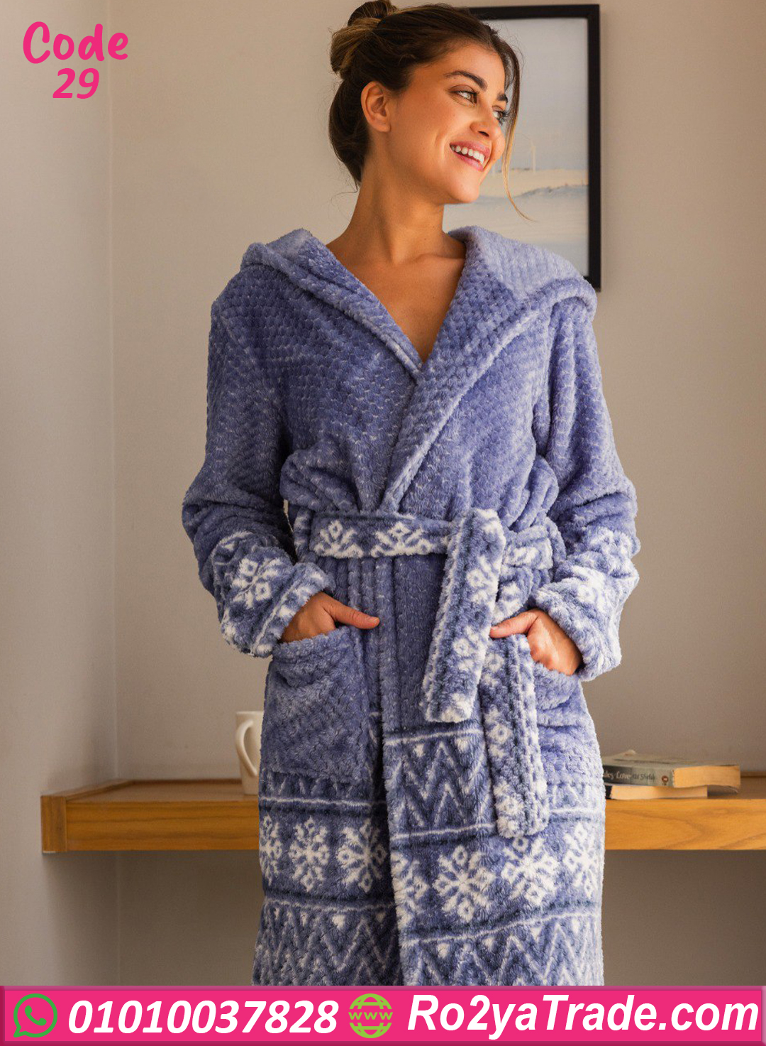 دلّعي نفسك في الشتاء بروب كود 29 من ALMA اللي هيدفيكي بإحساس الفرو الناعم ✨ تصميمه شيك وعصري بلون أزرق غامق ونقشة بيضاء مميزة، برباط خصر لتحديد الجسم وجيوب جانبية للراحة. الخامة فرو سوفت عالية الجودة، مريحة جدًا على الجلد ومناسبة لجو الشتاء البارد. هتقدري تلبسيه فوق البيجامة أو لوحده وتستمتعي بإحساس الفخامة والراحة في نفس الوقت.