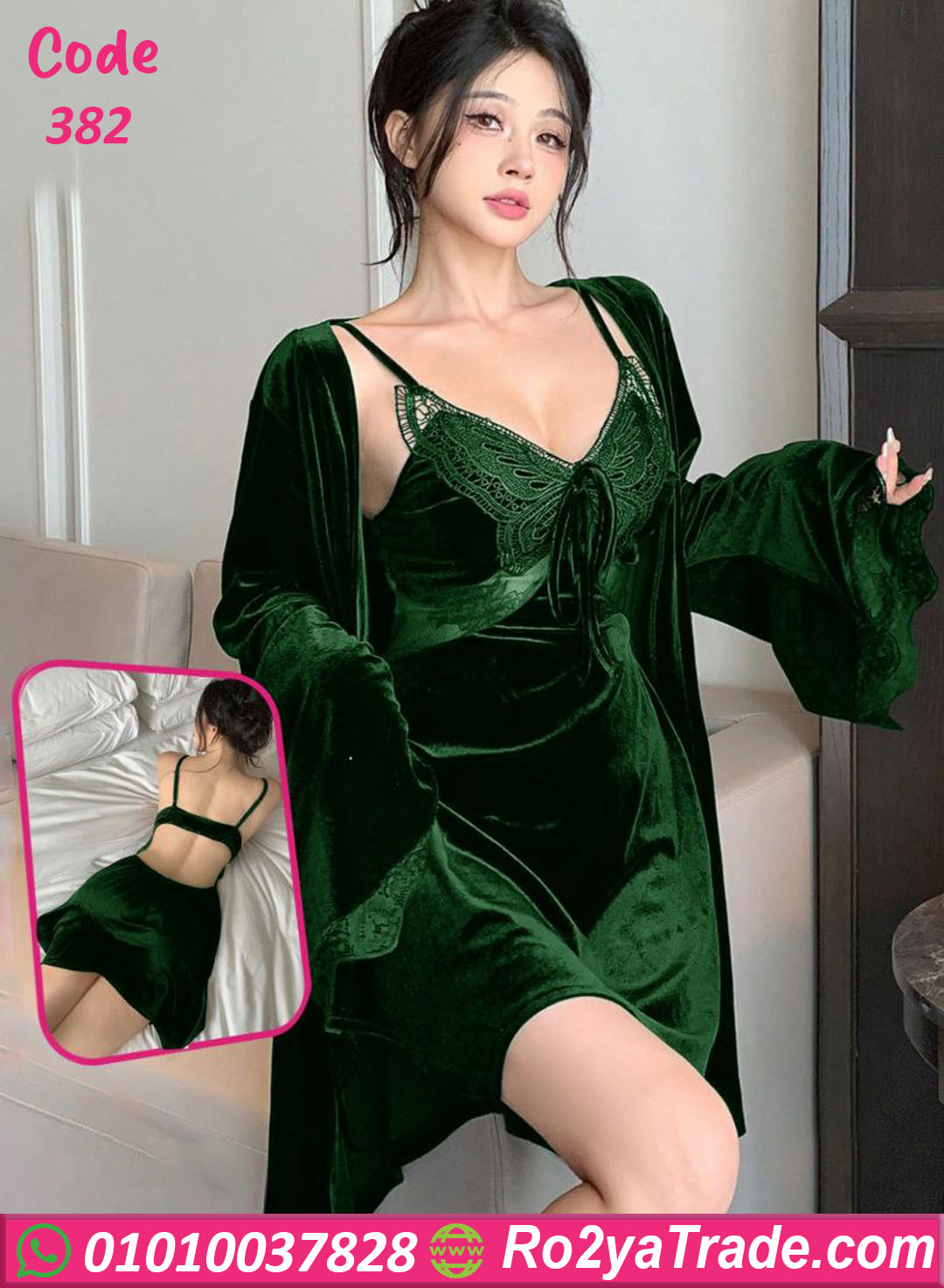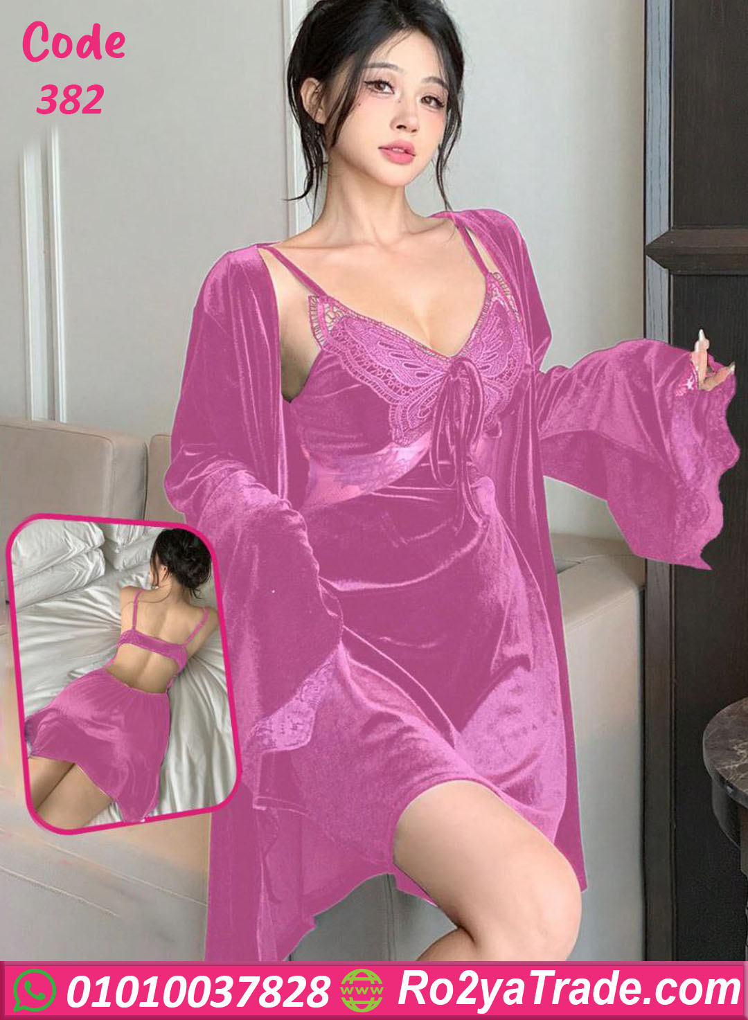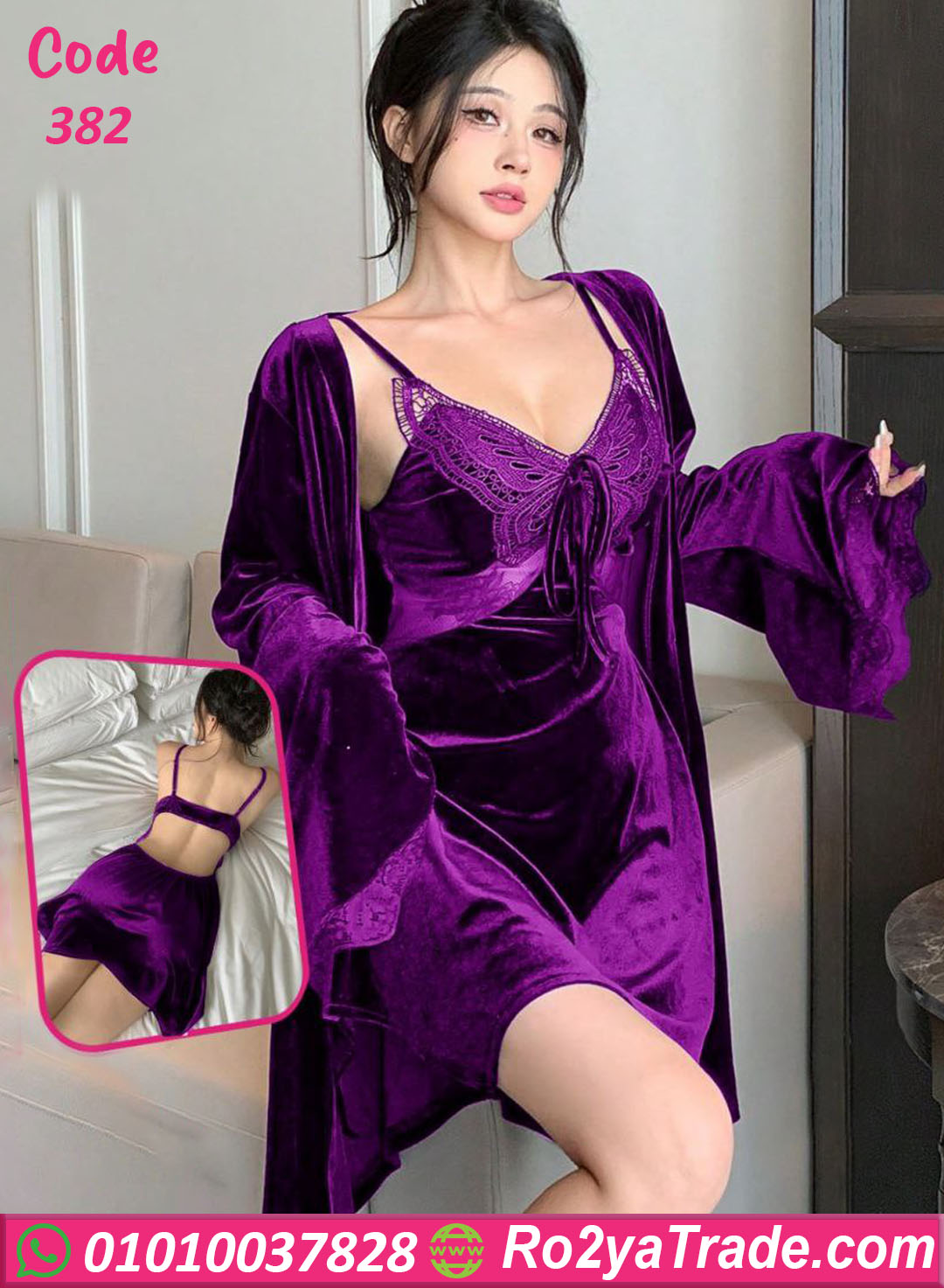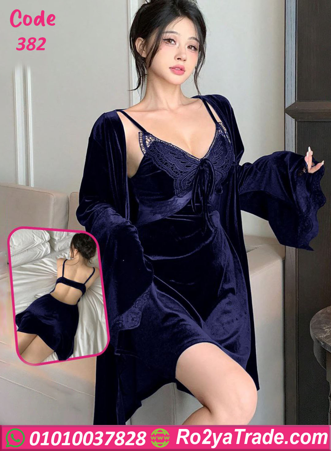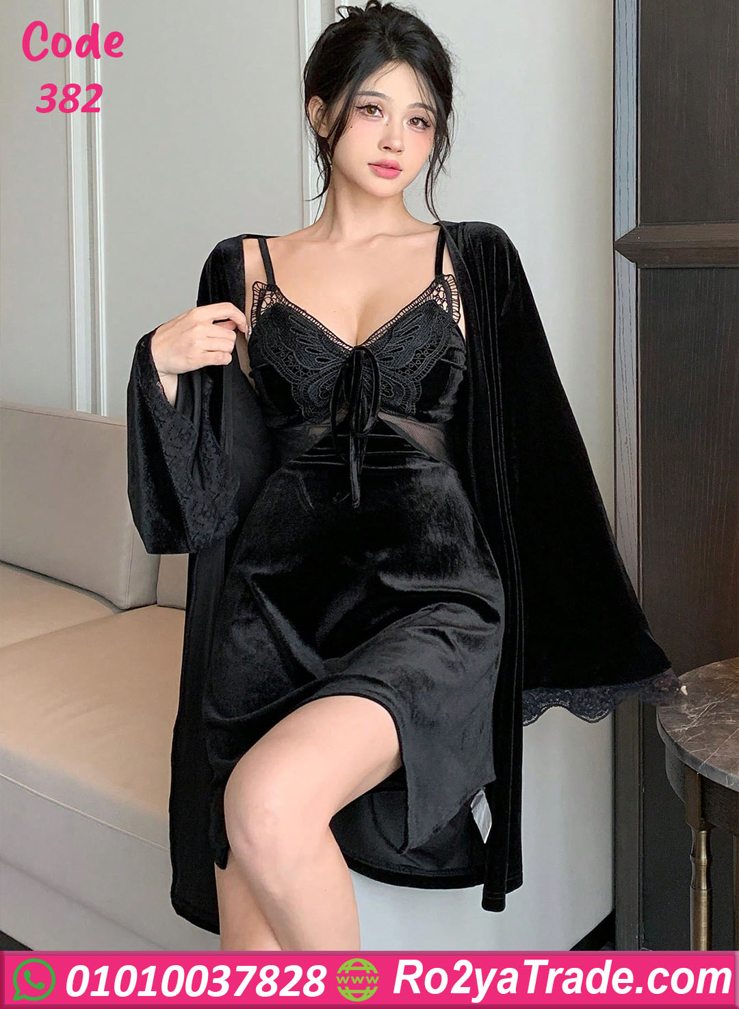 التصميم المكون من قطعتين (فستان لانجري + روب طويل) بيجمع بين الدلع والفخامة، والجزء العلوي مطرز بدانتيل راقي بيدي لمسة أنوثة ساحرة ✨