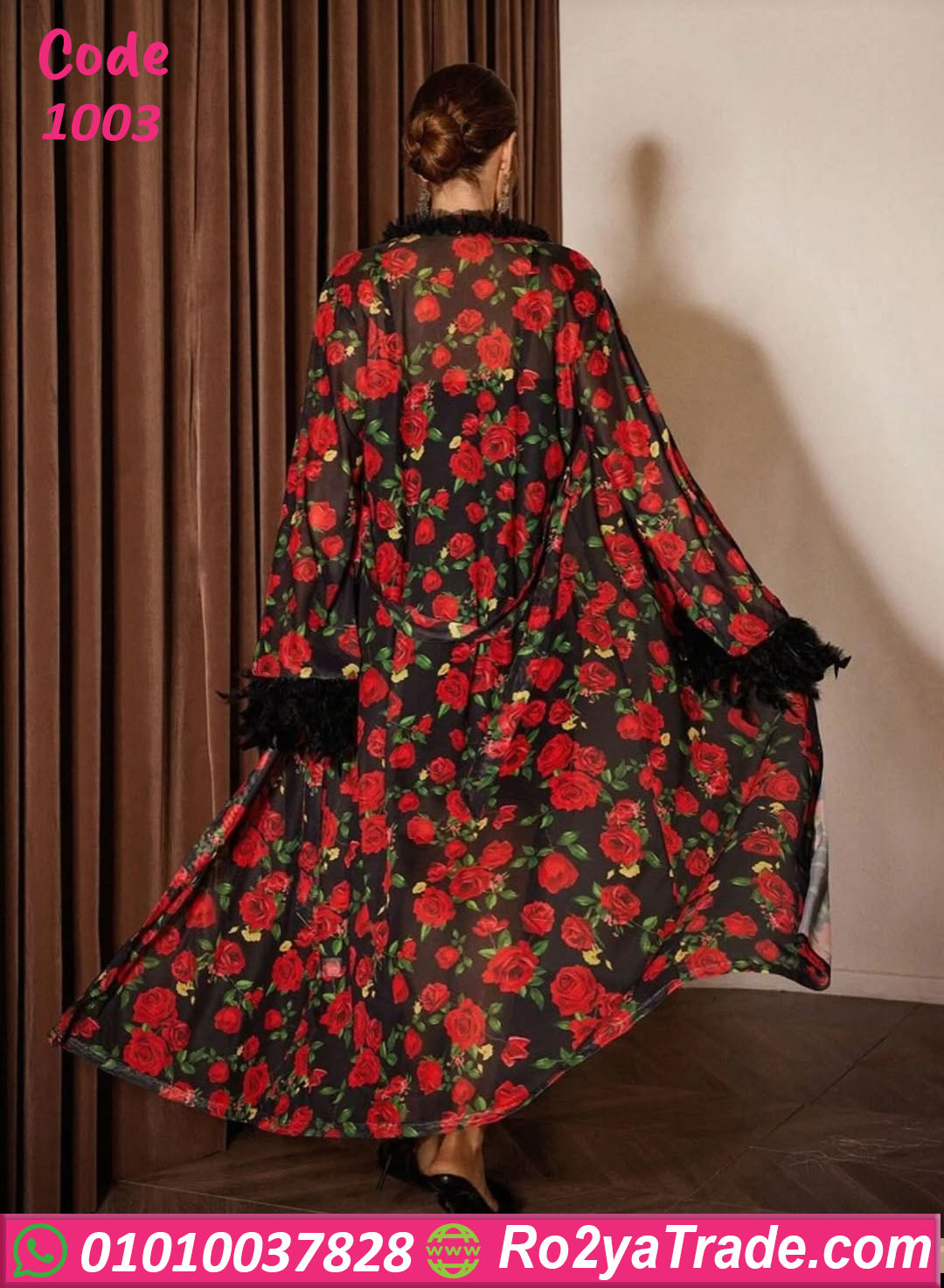 دلّعي نفسك بإطلالة أنثوية جذابة مع روب لانجري شيفون بنقشة الورد الأحمر على أرضية سوداء فخمة. الموديل مكوّن من روب خفيف شفاف بأكمام طويلة منتهية بريش ناعم،