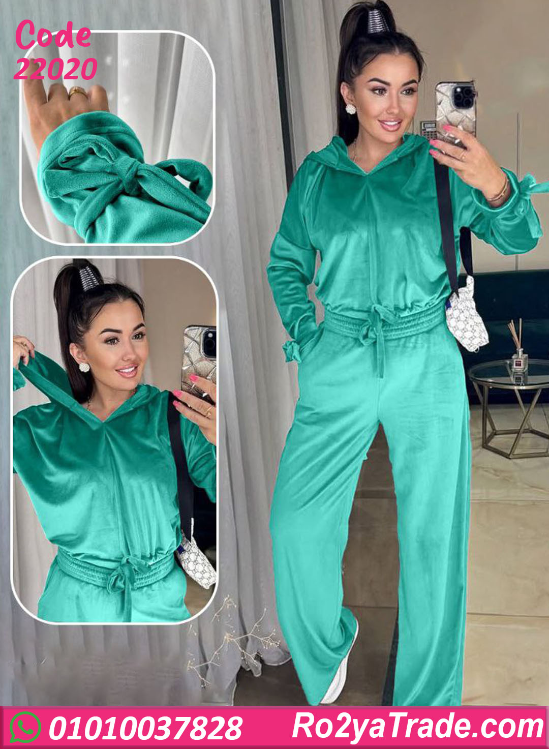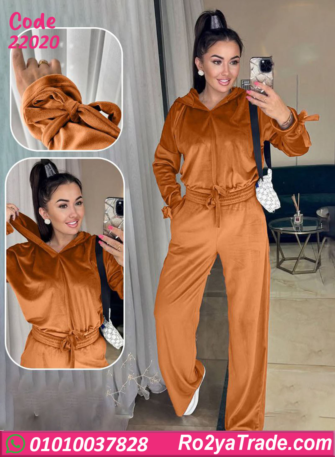 طقم بيجامة شتوي حريمي خامة قطيفة ناعمة ودافية جدًا، تصميم عملي بكابيشو ورباط على الوسط يدي راحة وأناقة في اللبس البيتي.