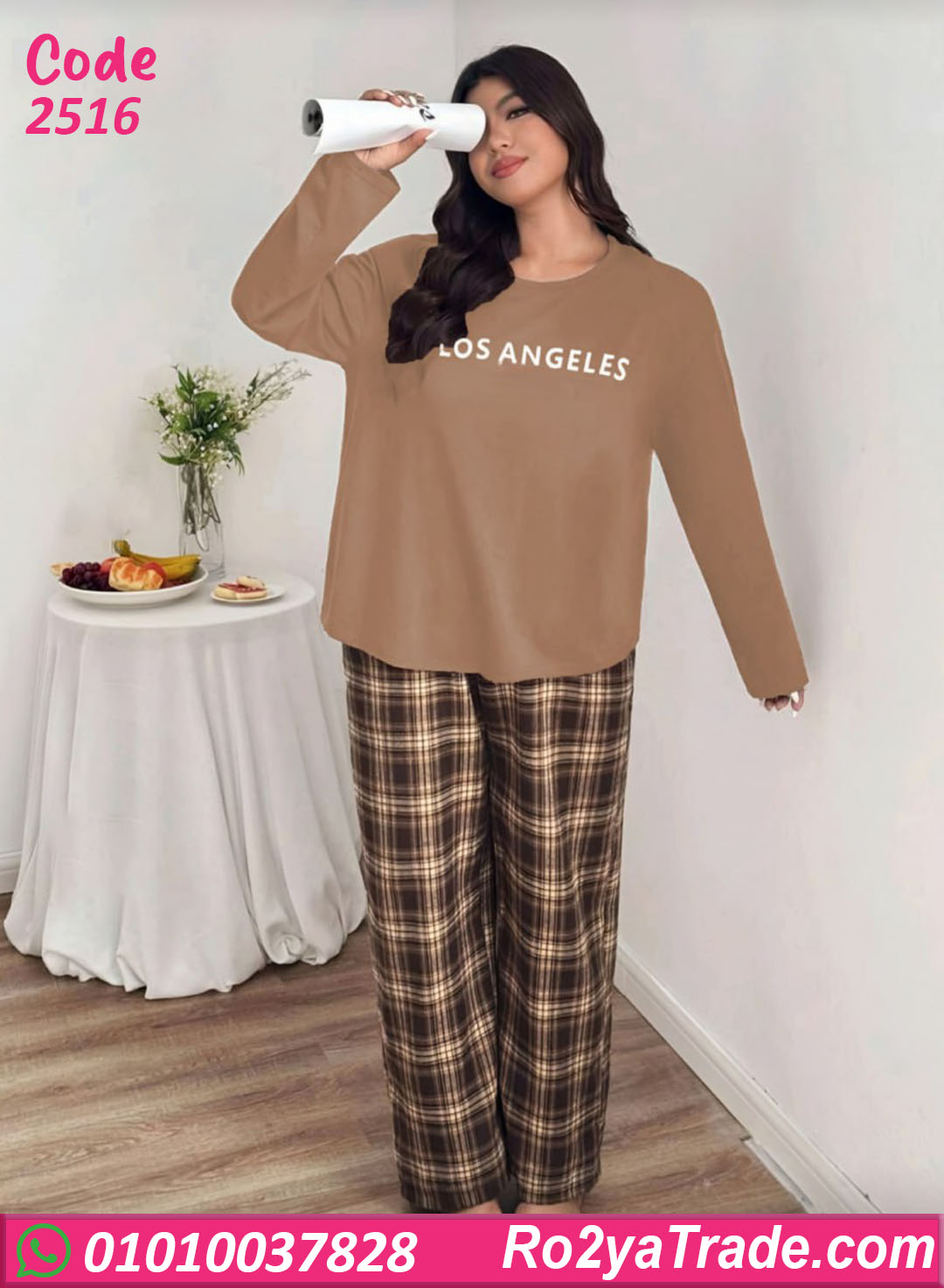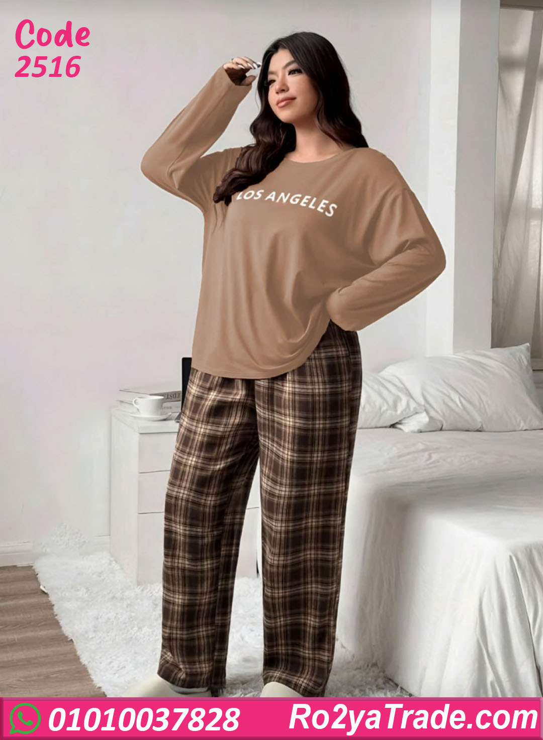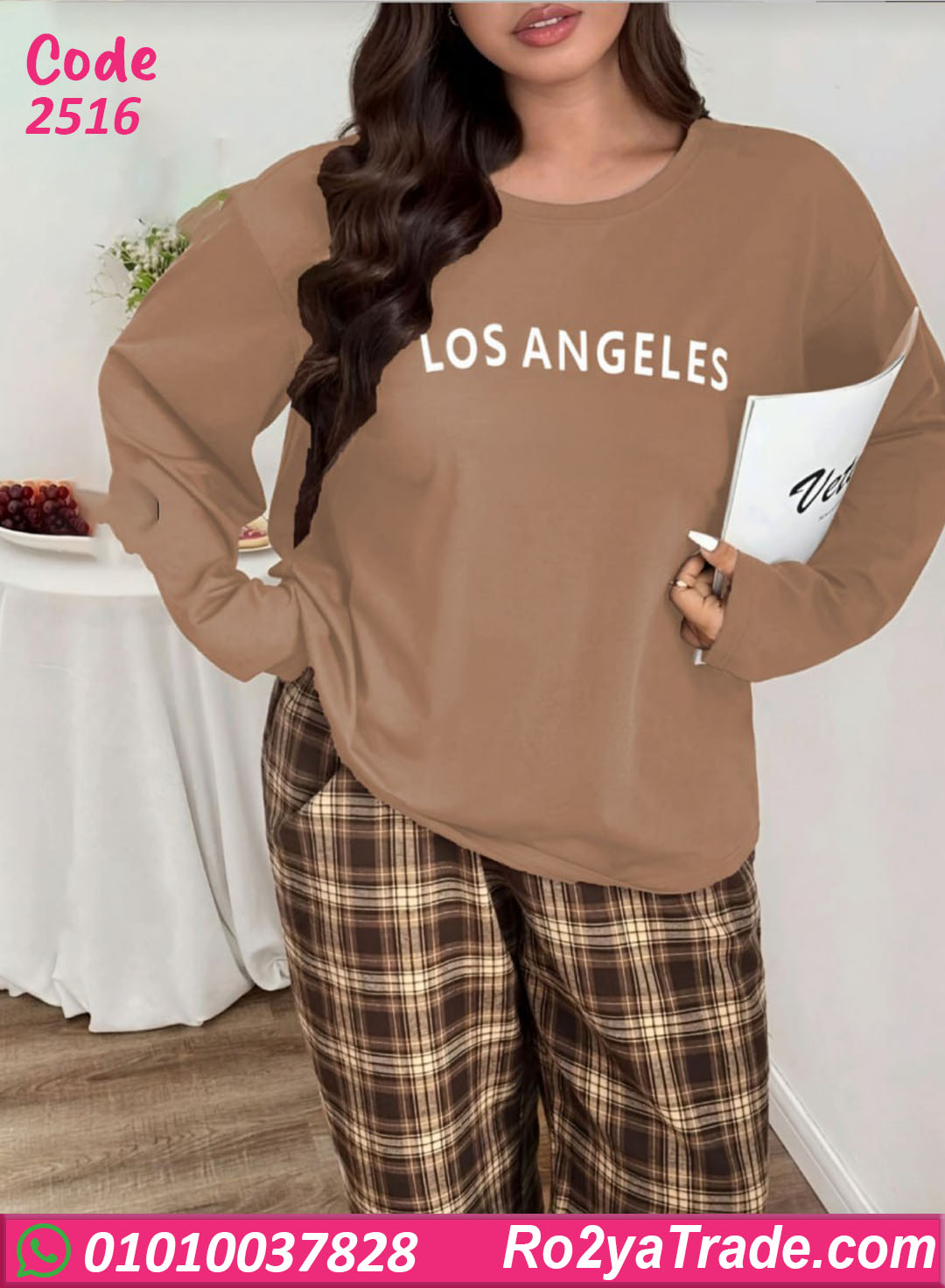 طقم بيجامة شتوي حريمي بيج سايز بتصميم عملي ومريح، مكوّن من بلوزة سادة مطبوع عليها Los Angeles وبنطلون كاروه بقصة واسعة،