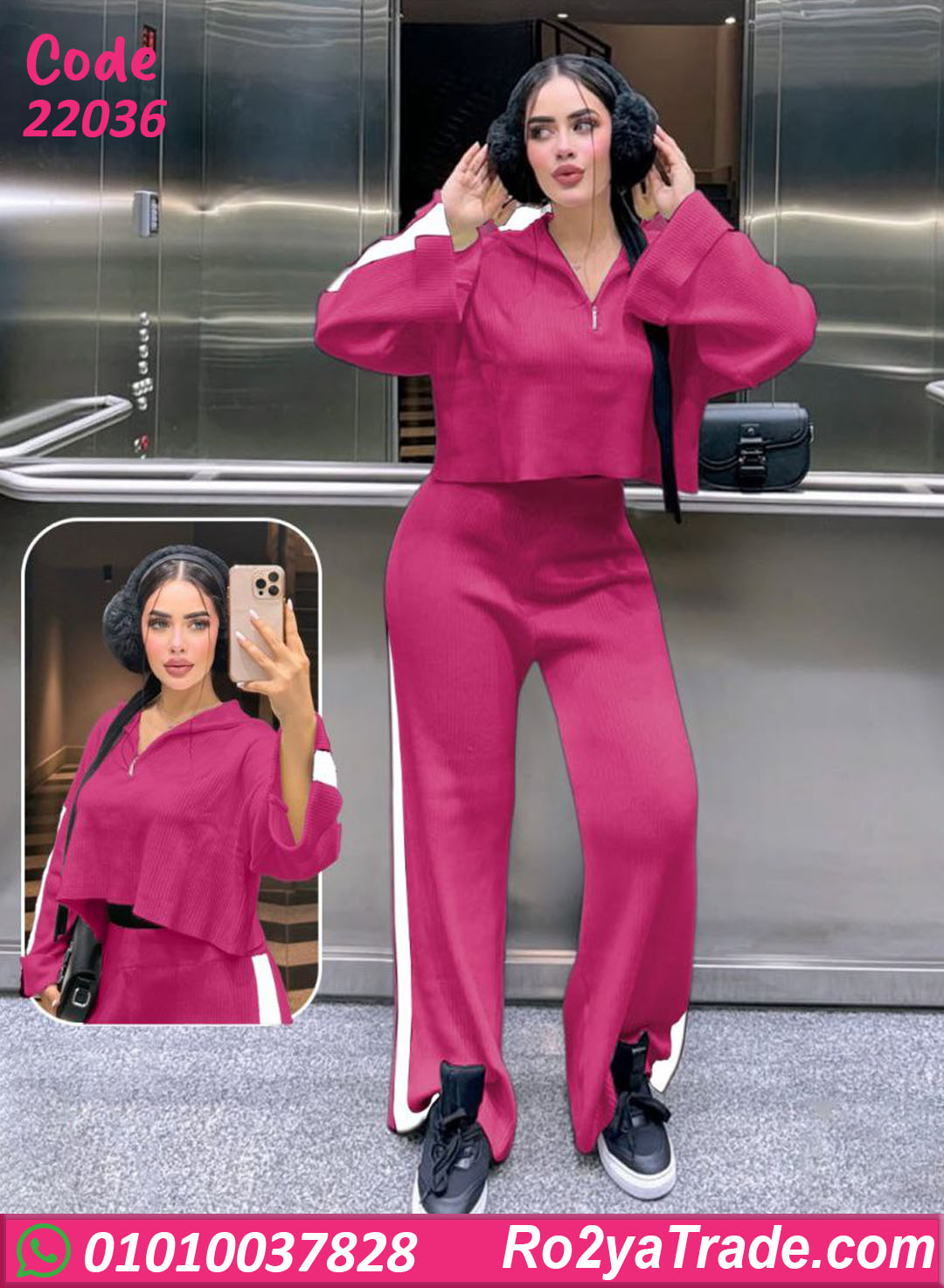طقم ترنج شتوي حريمي مكوّن من بلوزة بكم طويل وقَصة قصيرة مع بنطلون واسع، خامته ناعمة ودافية ومريحة جدًا في اللبس. التصميم مزوّد بخط جانبي بلون متباين يدي شكل رياضي عصري،