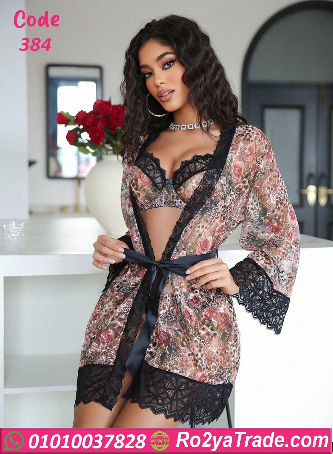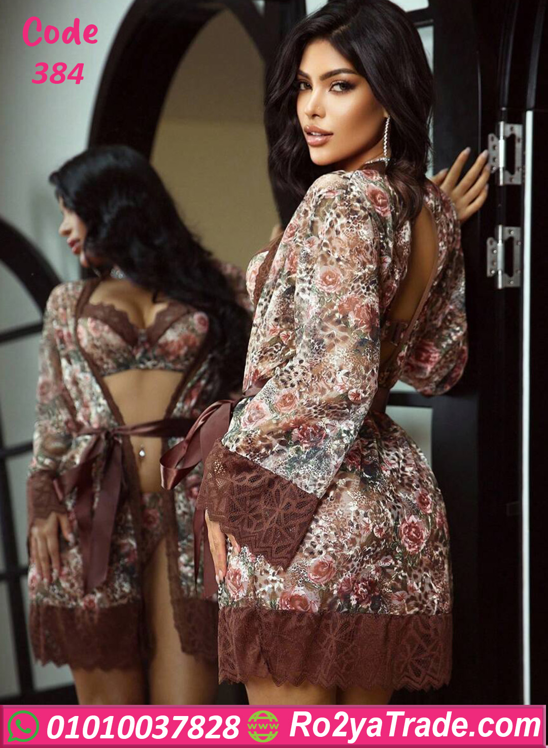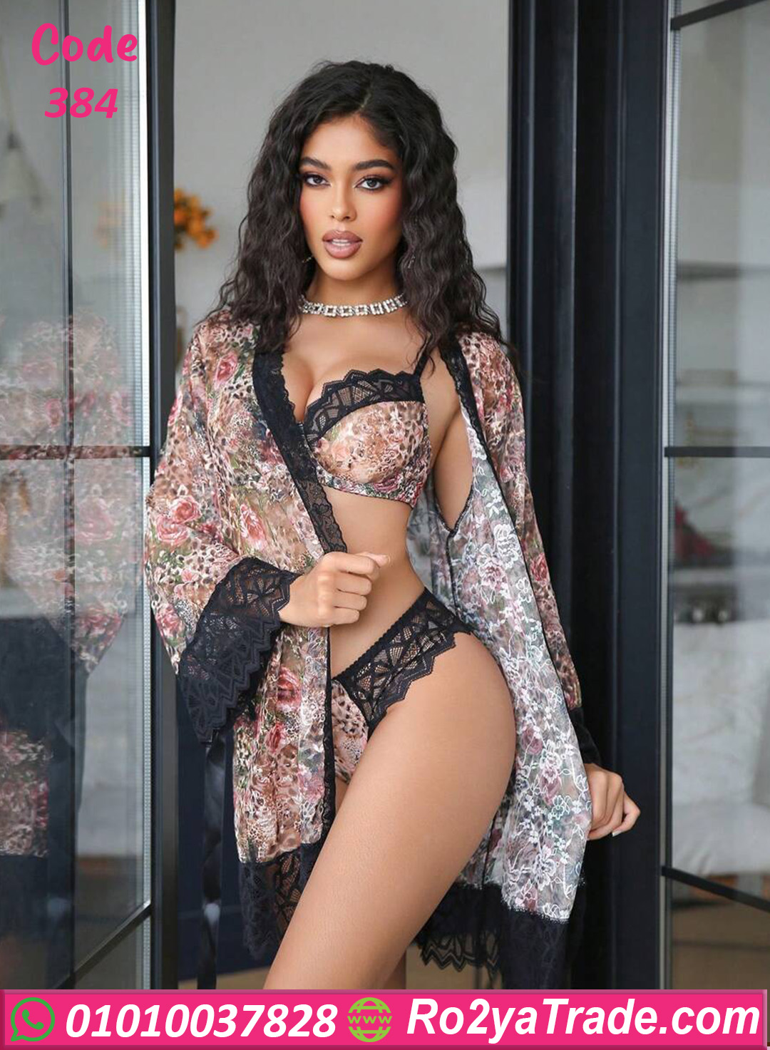 طقم داخلي حريمي مكوّن من برا وبانتي مع روب شيك، مصنوع من خامة ناعمة ومريحة على الجسم. النقشة الراقية مع تفاصيل الدانتيل بتدي شكل أنثوي جذاب، والروب بيضيف لمسة فخامة وأناقة على الطقم. التصميم بيبرز القوام بشكل جذاب من غير ما يكون مزعج، وبيخلي الطقم اختيار مثالي للعرايس أو للمناسبات الخاصة. قطعة مميزة لأي بنت بتحب الإطلالة الجريئة والأنيقة في نفس الوقت. كود 384