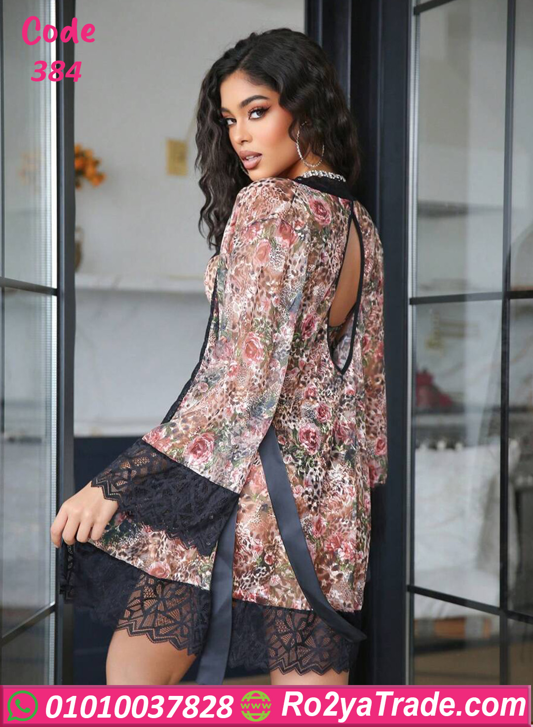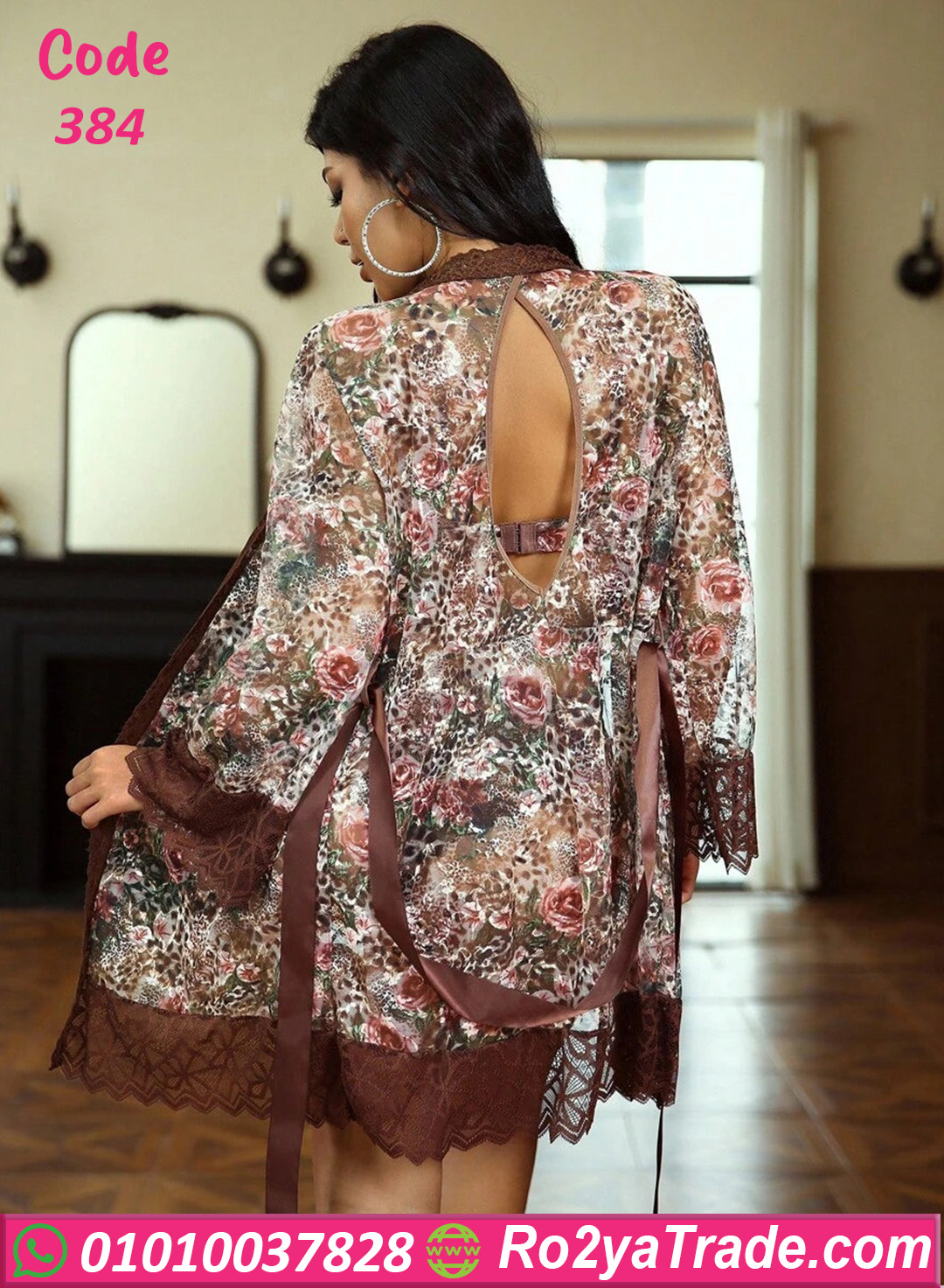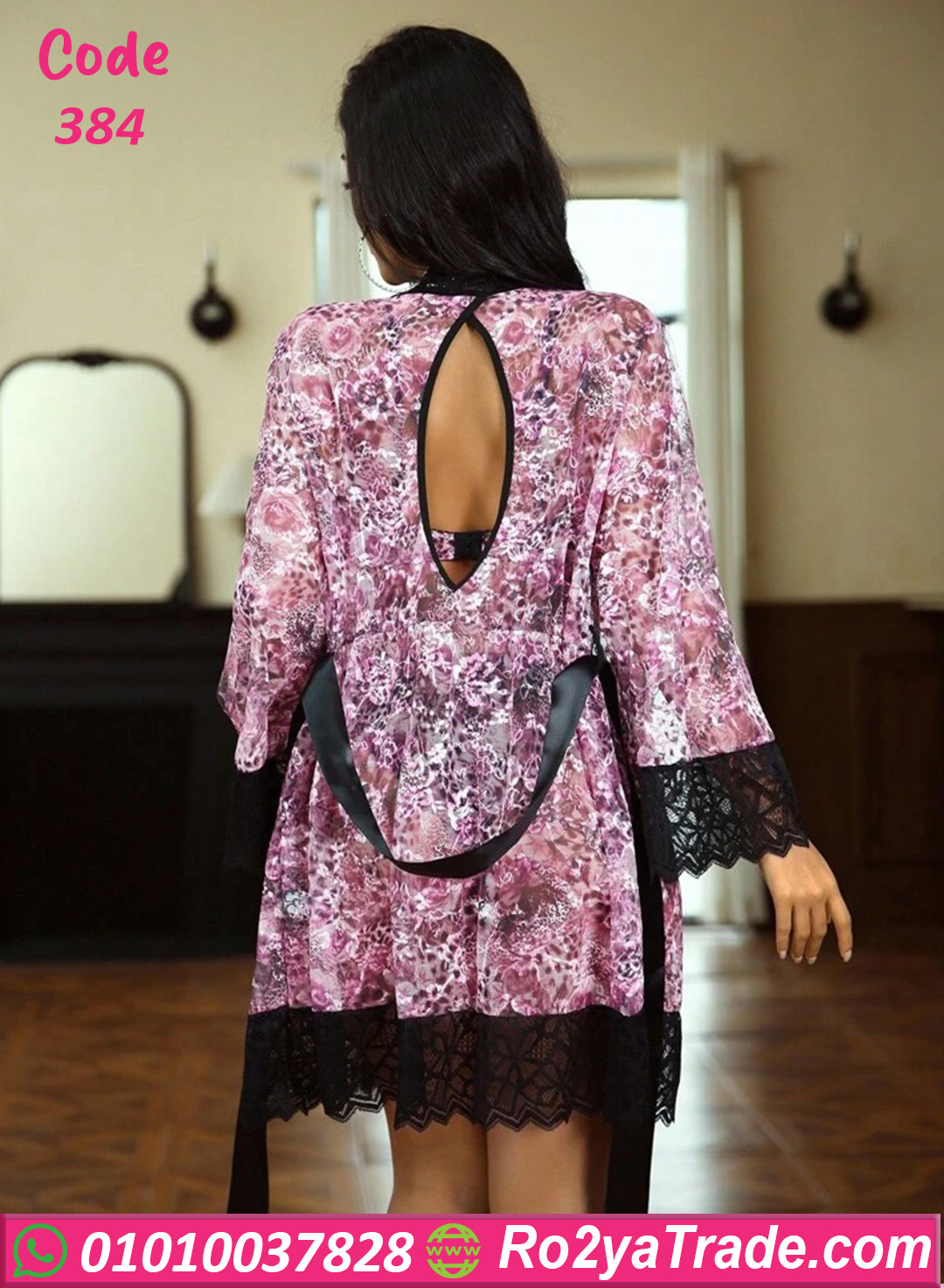 طقم داخلي حريمي مكوّن من برا وبانتي مع روب شيك، مصنوع من خامة ناعمة ومريحة على الجسم. النقشة الراقية مع تفاصيل الدانتيل بتدي شكل أنثوي جذاب، والروب بيضيف لمسة فخامة وأناقة على الطقم. التصميم بيبرز القوام بشكل جذاب من غير ما يكون مزعج، وبيخلي الطقم اختيار مثالي للعرايس أو للمناسبات الخاصة. قطعة مميزة لأي بنت بتحب الإطلالة الجريئة والأنيقة في نفس الوقت. كود 384